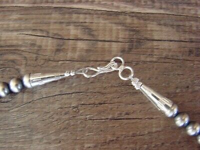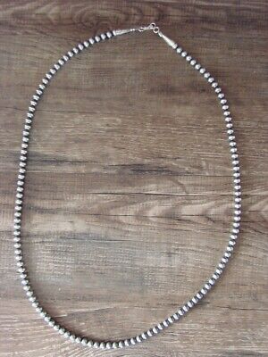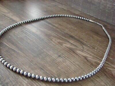 Native American Indian Single Strand Sterling Silver Navajo Pearl Necklace from Western New Mexico. This necklace features a single 26" strand of hand strung 5mm Round Sterling Silver Navajo Pearls. The necklace is finished with a sterling silver cone and a hook and eye closure. These Sterling Silver Navajo Pearls are gorgeous, and this necklace is stunning! Hand strung by Navajo artist Doreen Jake. Free shipping and gift box included!