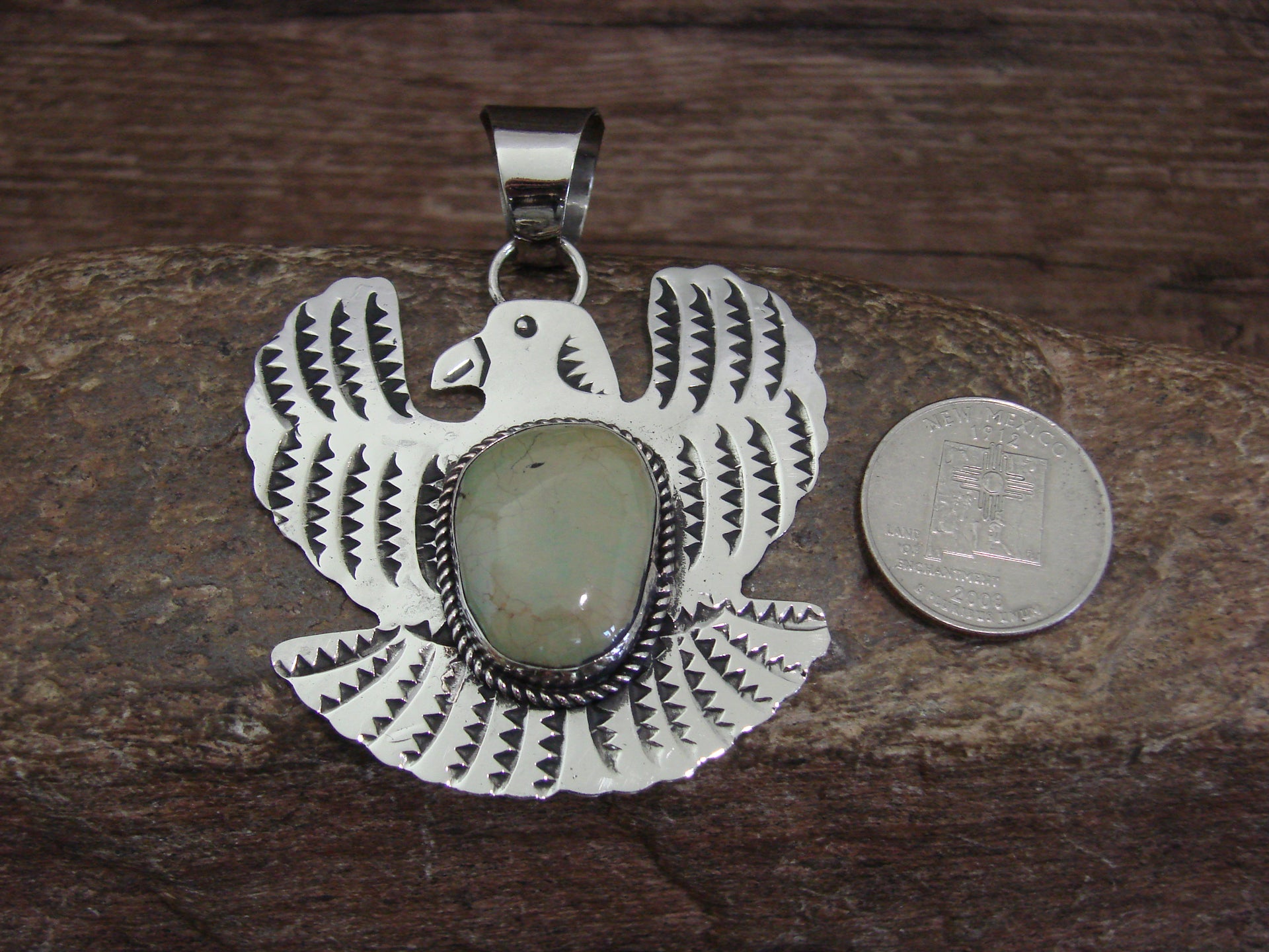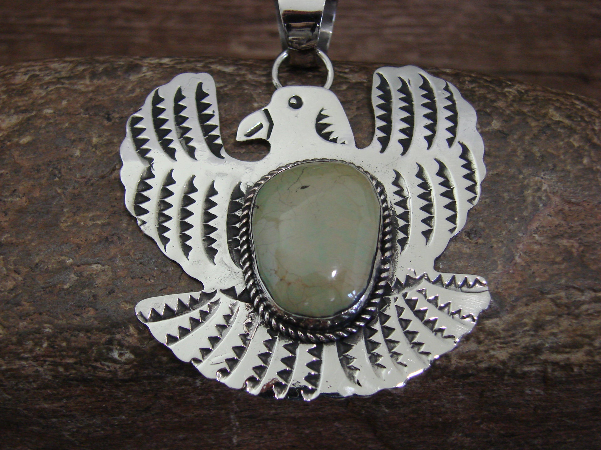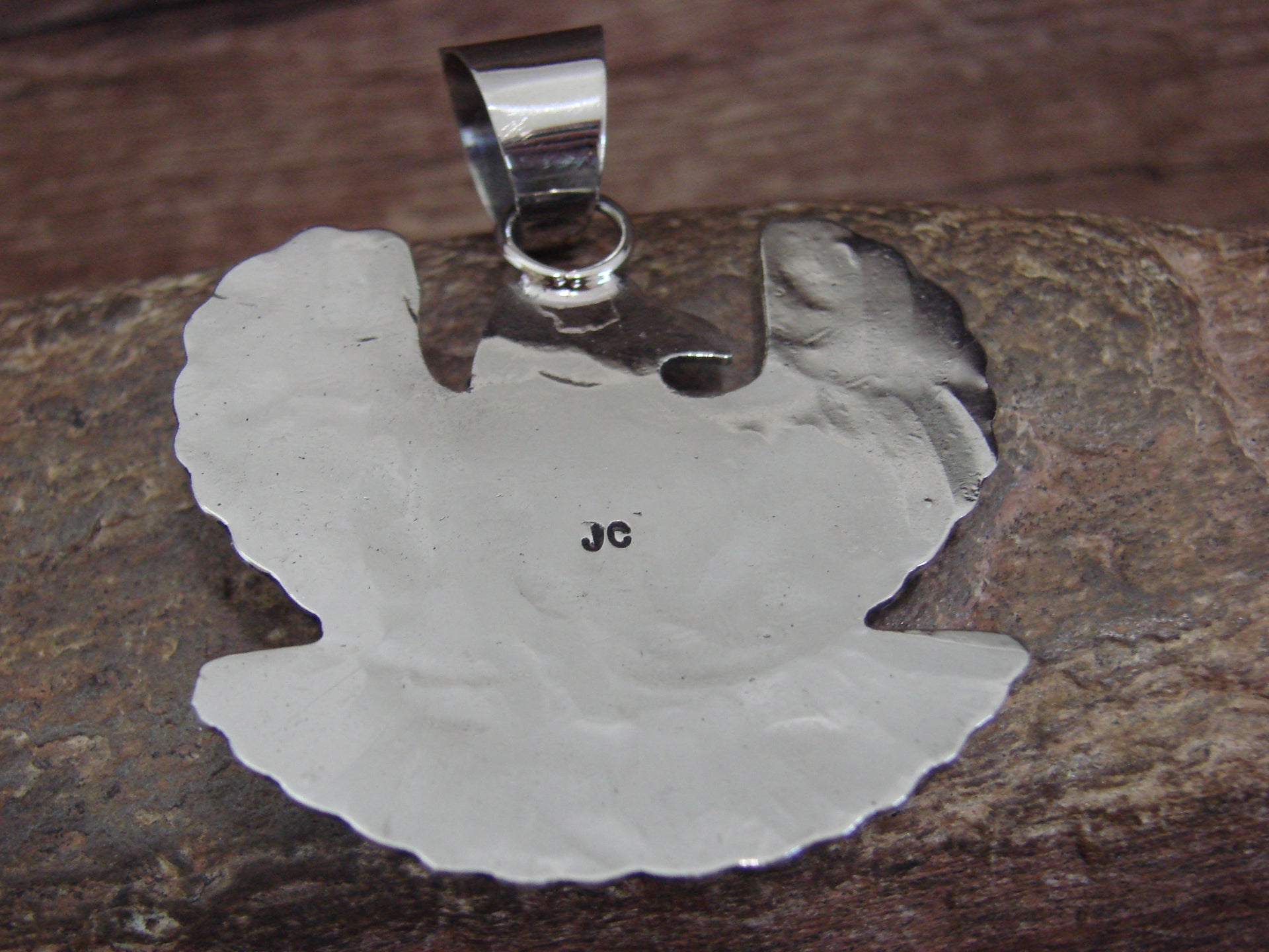 Native American Navajo Indian Nickel Silver & Turquoise Eagle Pendant from Western New Mexico. This beautiful Pendant is hand cut from Nickel Silver and features stunning traditional hand stamping throughout. The Genuine Turquoise stone is securely set into a smooth Nickel Silver bezel setting. Handmade by Jackie Cleveland, wife of the late Navajo Silversmith Albert Cleveland. Signed "JC" on back. Jackie is widely known for her traditional Navajo style and hand stamping. Free gift box and shipping included!