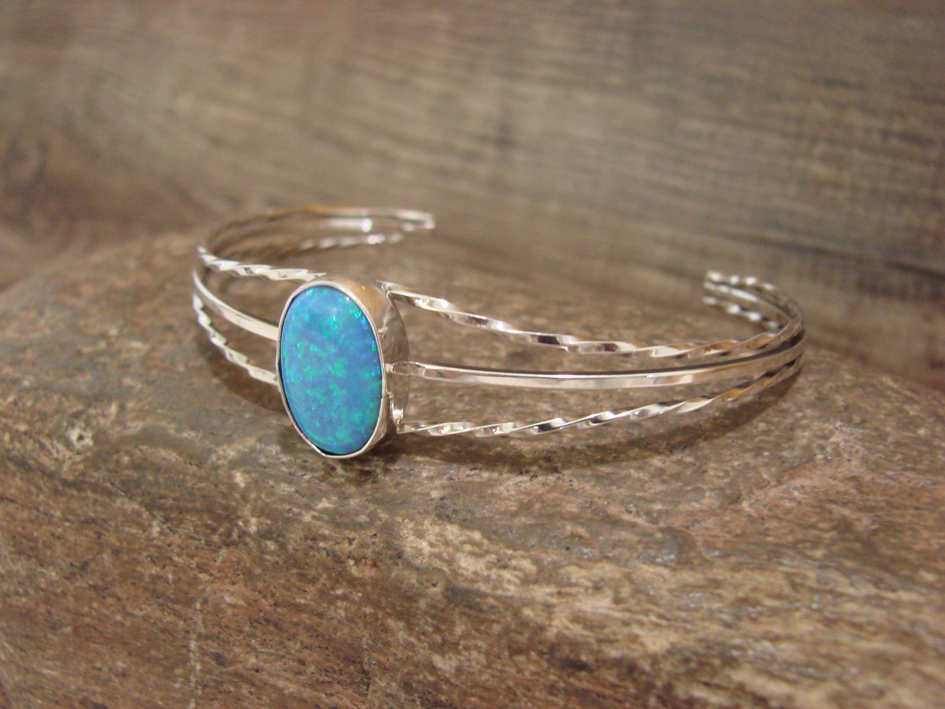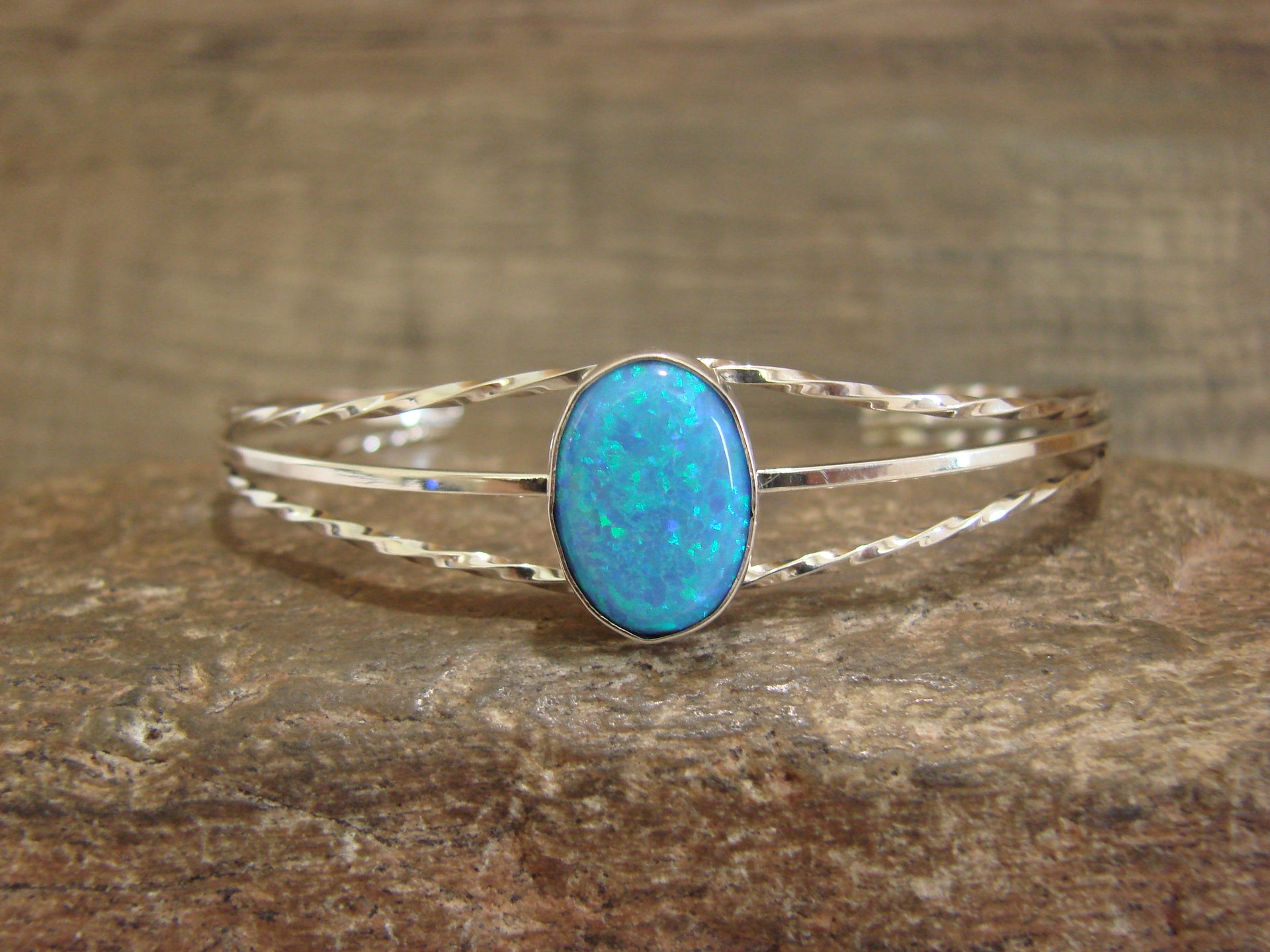 Genuine Native American Navajo Indian Sterling Silver & Blue Opal Bracelet from Western New Mexico. The focal point of this piece is a Lab Opal Stone intricately set into a smooth Sterling Silver bezel setting. Sterling Silver Details and Fine Navajo Silversmith workmanship quality makes this bracelet a beautiful hand made masterpiece! Navajo Indian handmade by Alice Saunders. Unsigned. Free gift box and shipping included!
