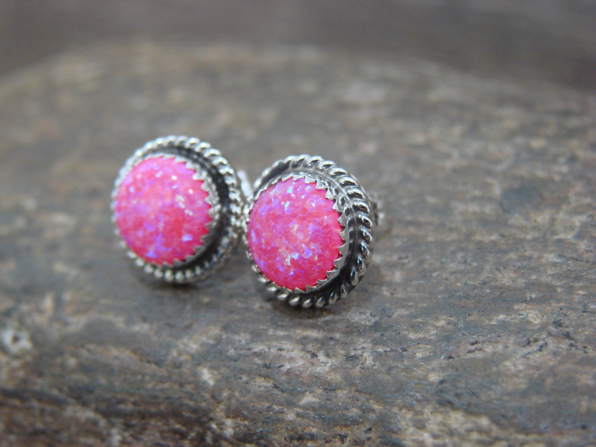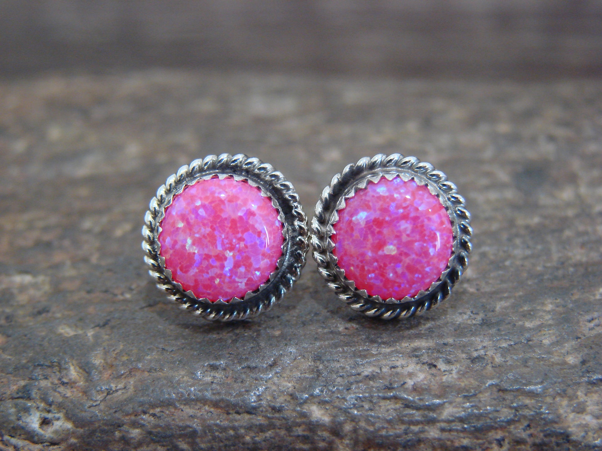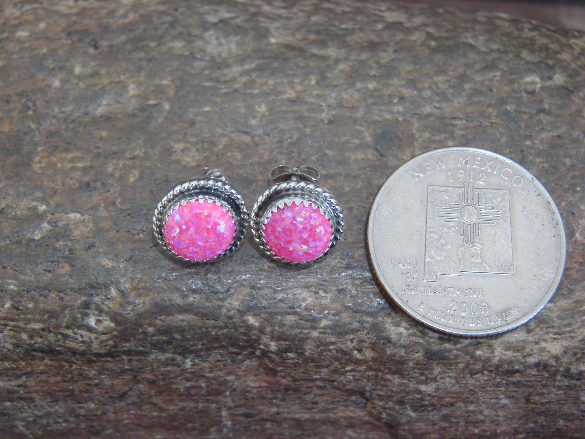 Native American Navajo Indian Sterling Silver & Pink Opal Post Earrings from Western New Mexico. These Beautiful post earrings feature Lab Opal stones. Each stone is beautifully set into a crown sterling silver bezel setting. This is a great pair of earrings! Navajo Indian hand made by Esther White. Unsigned. Free Shipping and Gift Box included!