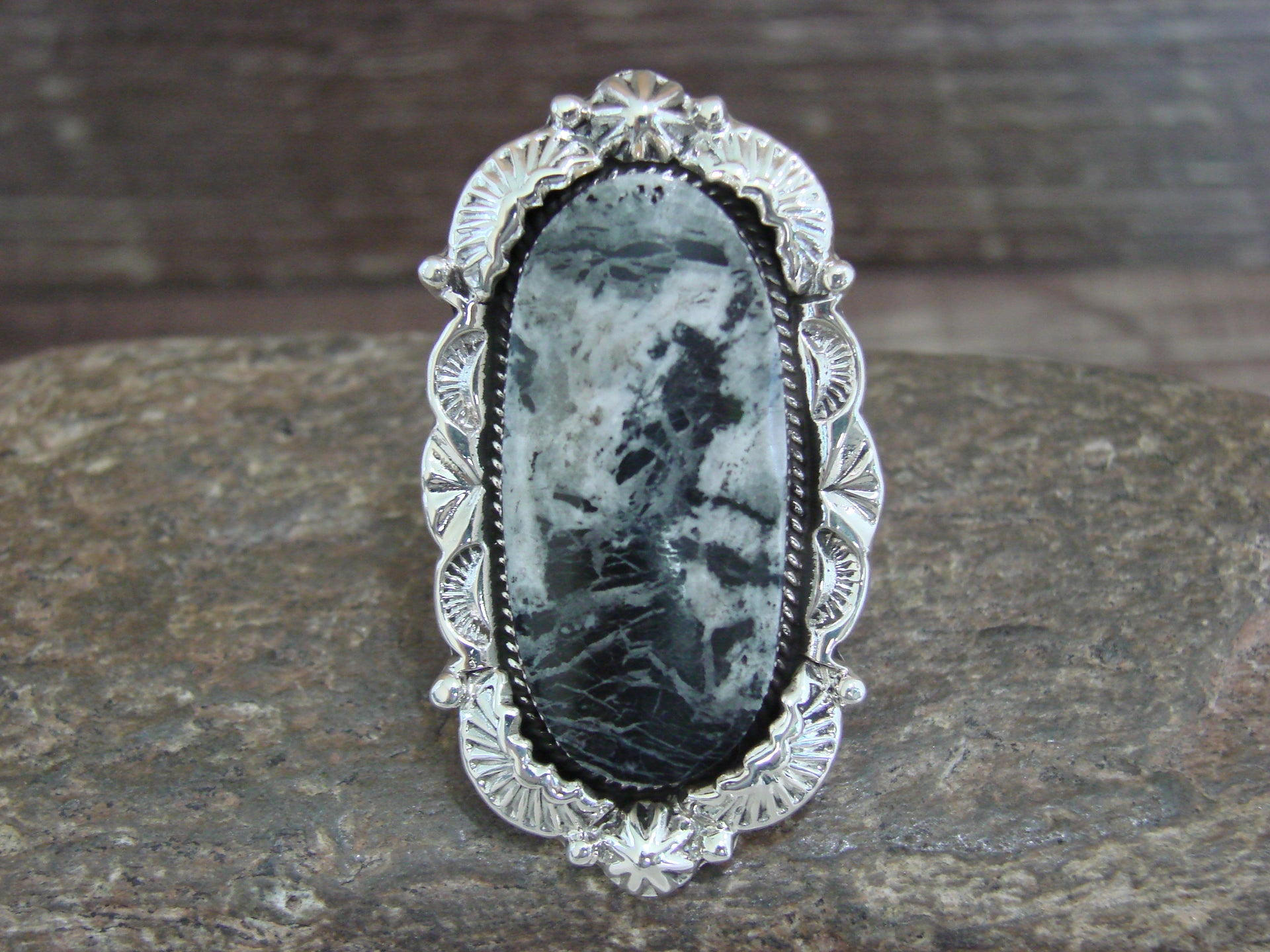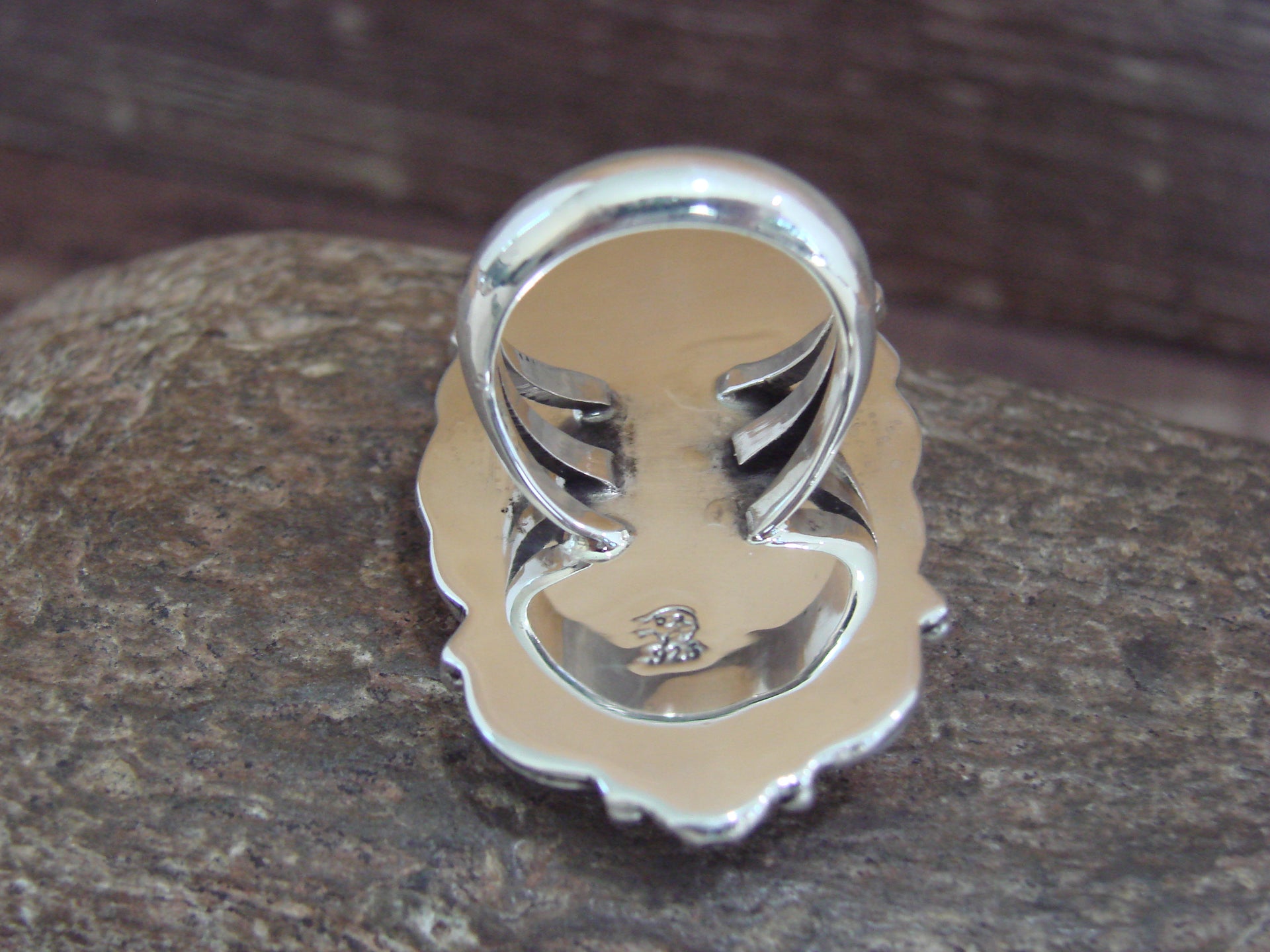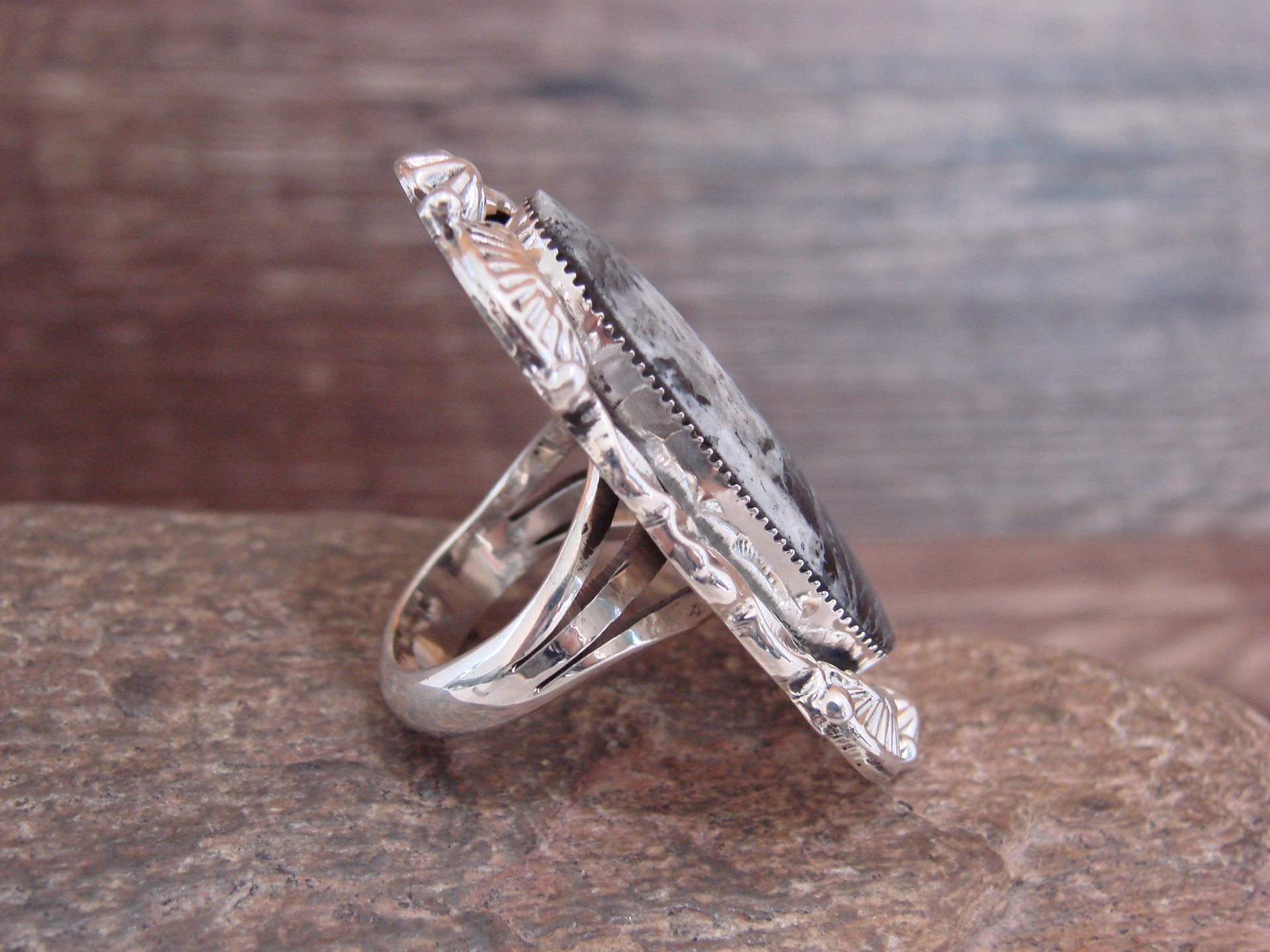 Genuine Native American Navajo Indian Sterling Silver & White Buffalo Turquoise Ring from Western New Mexico. This ring features a single genuine, White Buffalo Turquoise stone set into a Crown Sterling Silver bezel setting. Beautiful Hand Stamping and details in Sterling Silver surround this gorgeous stone. This is a stunning ring Hand Made to Perfection! Navajo Indian handmade by Emerson Delgarito. Hallmarked on the back. Free shipping and gift box included!