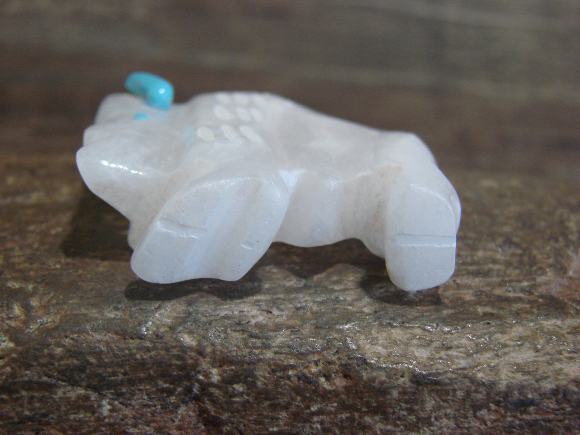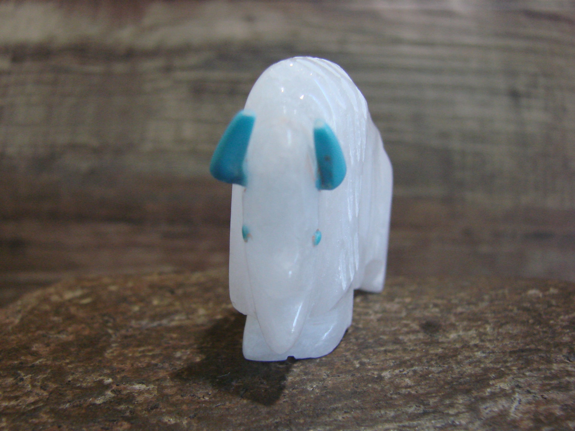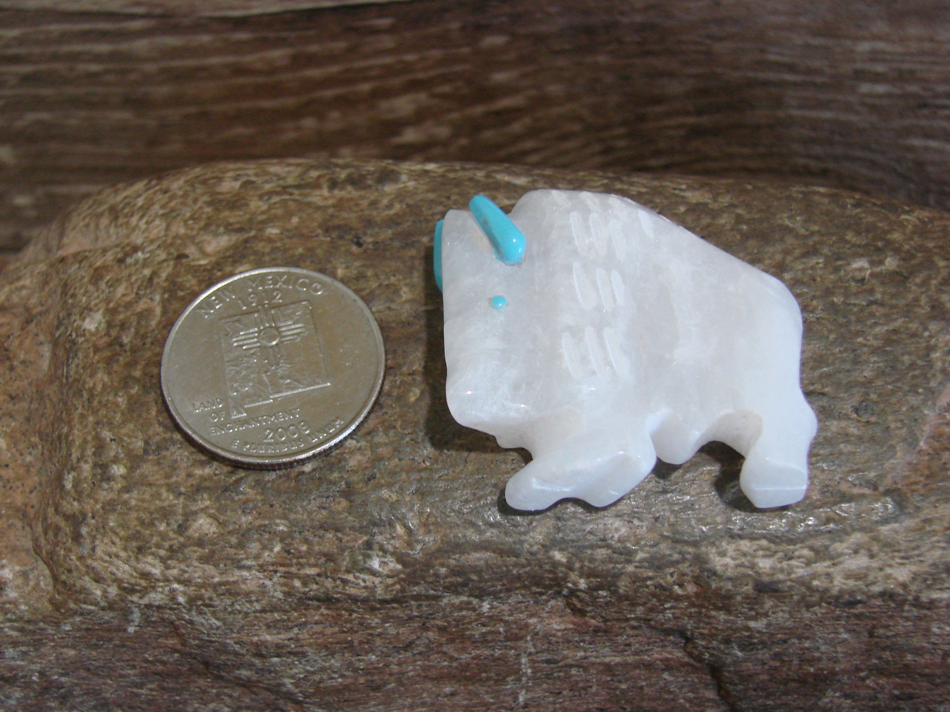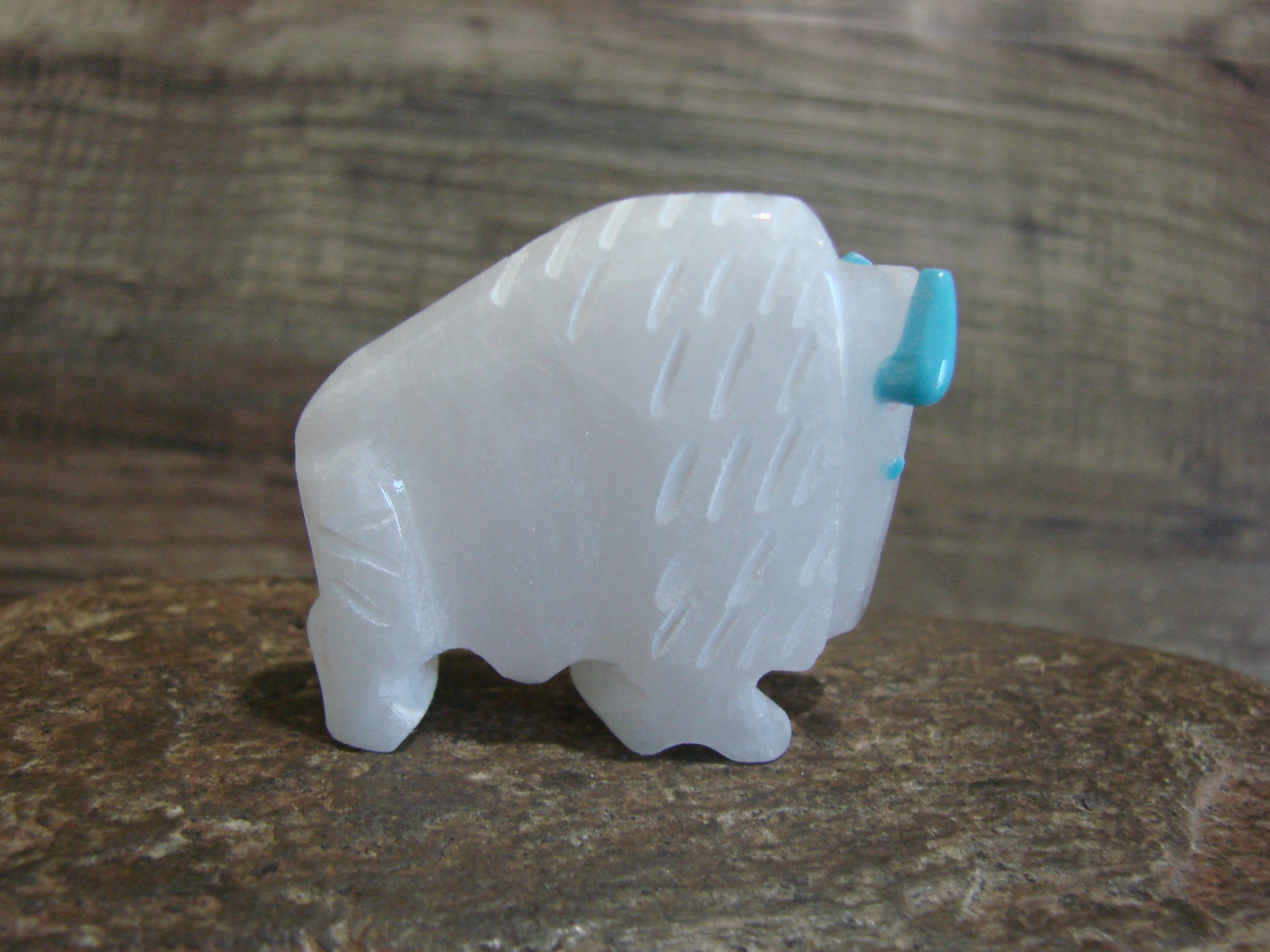 Genuine Native American Zuni Indian Hand Carved Buffalo Fetish from the Zuni Pueblo in Western New Mexico. This Stunning Fetish is Hand Carved out of a beautiful piece of White Alabaster. Turquoise is used for both the eyes and Horns. This is a unique and stunning piece! Handmade by the Zuni carver Todd Etsate. Free Shipping included!