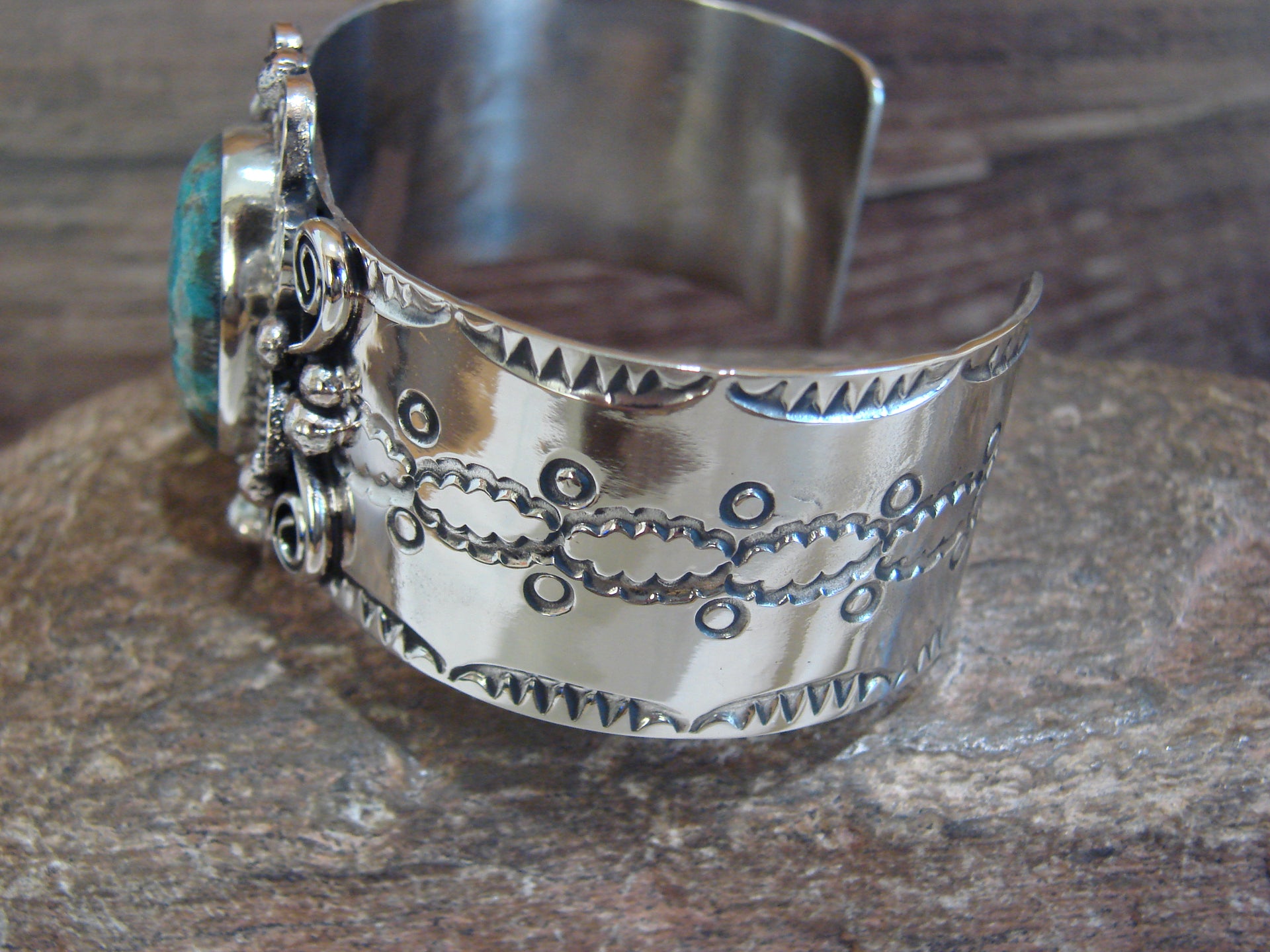 Native American Navajo Indian Handmade Nickel Silver & Turquoise Bracelet from Western New Mexico. This Large bracelet features a Turquoise stone set into a smooth Nickel bezel setting. The stone is nicely polished and surrounded by traditional Navajo Hand Stamping and details in Nickel Silver. This bracelet is Gorgeous and made with Nickel Silver. Navajo Indian handmade by well-known Silversmith Jackie Cleveland. Signed "JC" on the back. Free Shipping with a gift box included!