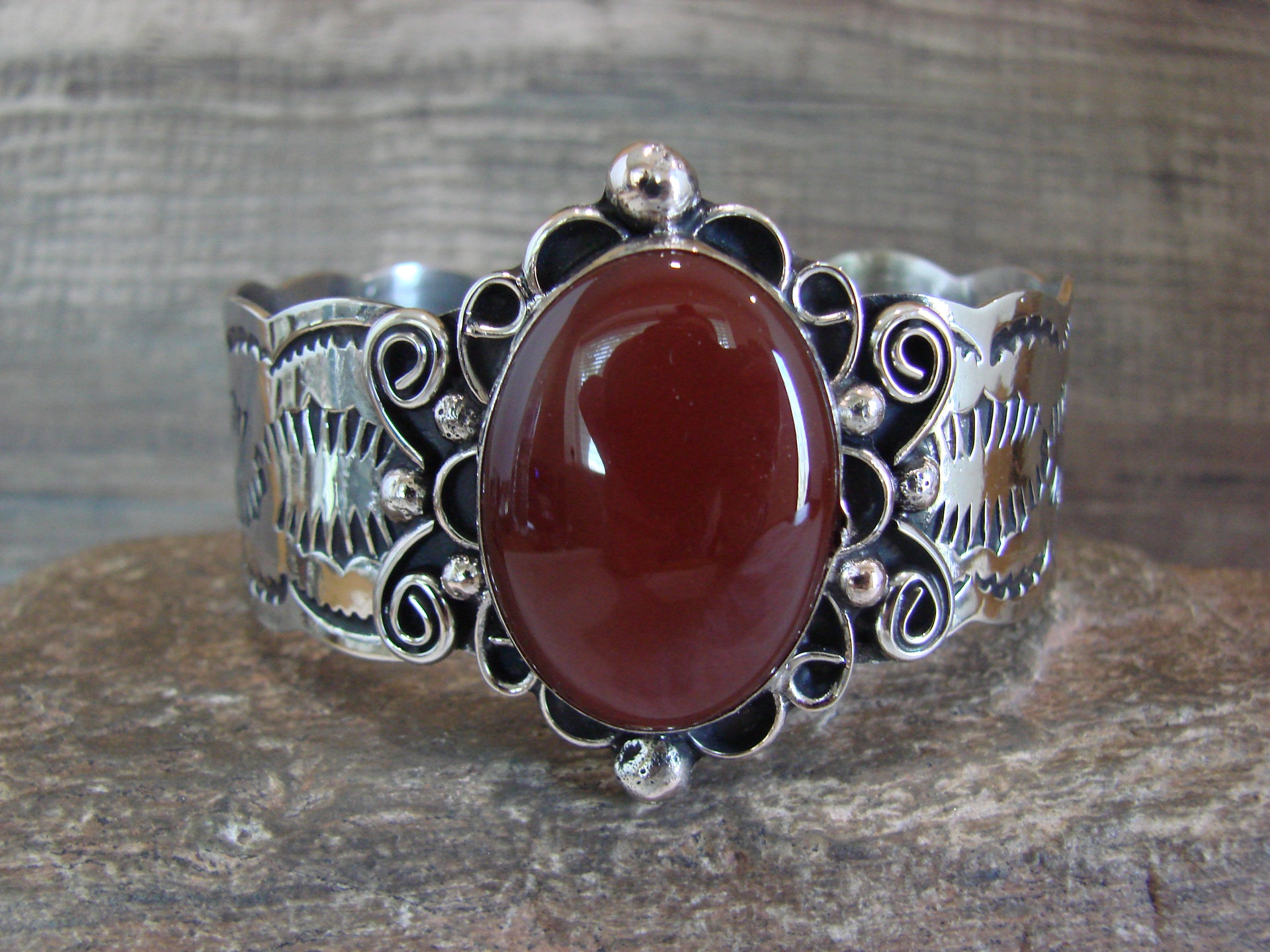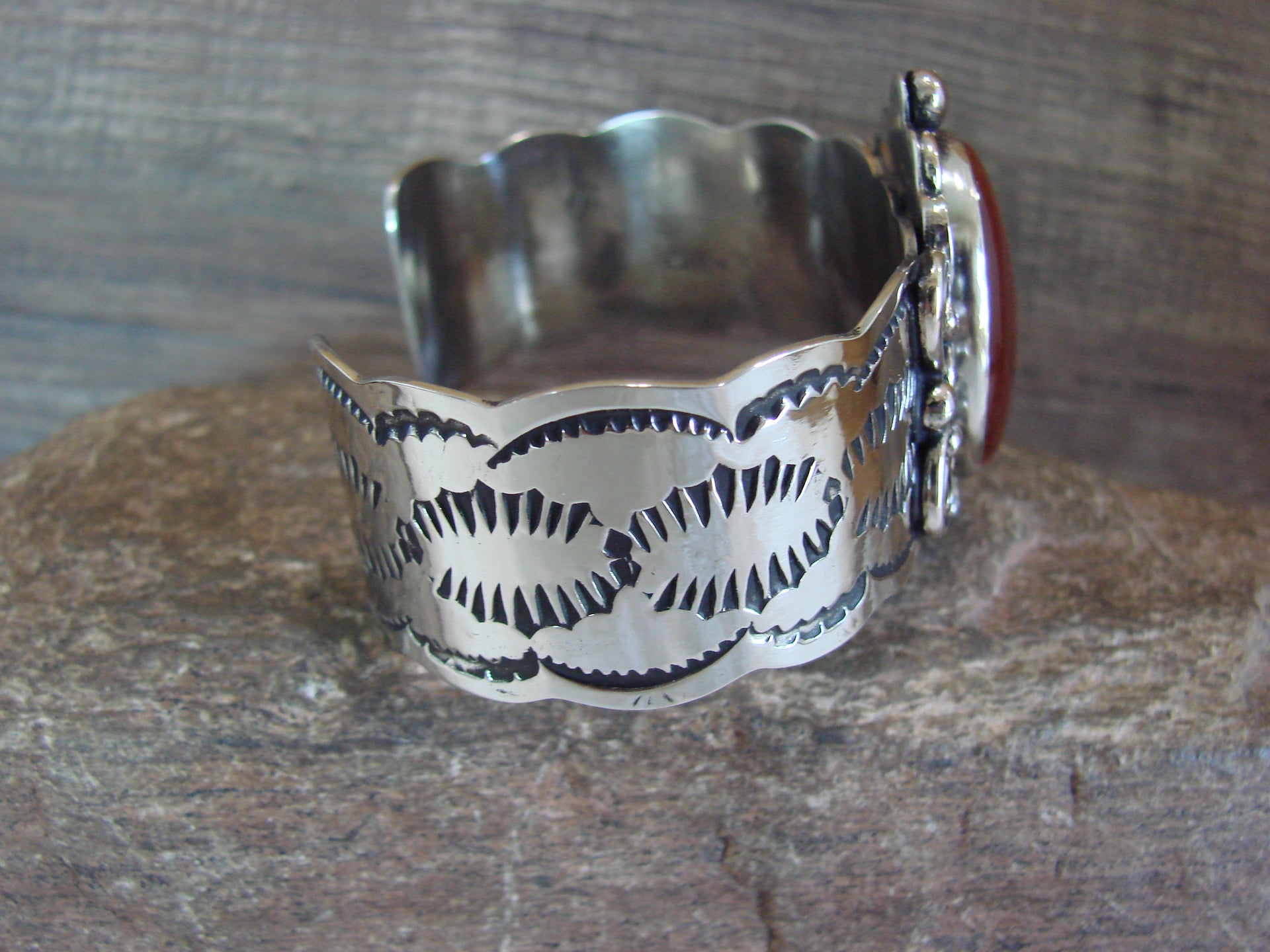 Native American Navajo Indian Handmade Nickel Silver & Red Howlite Bracelet from Western New Mexico. This bracelet features a Red Howlite stone set into a smooth Nickel Silver bezel setting. The stone is nicely polished and surrounded by traditional Navajo style design work in Nickel Silver. Navajo Indian handmade by well-known Silversmith Jackie Cleveland. Signed "JC" on the back. Free Shipping with a gift box included!