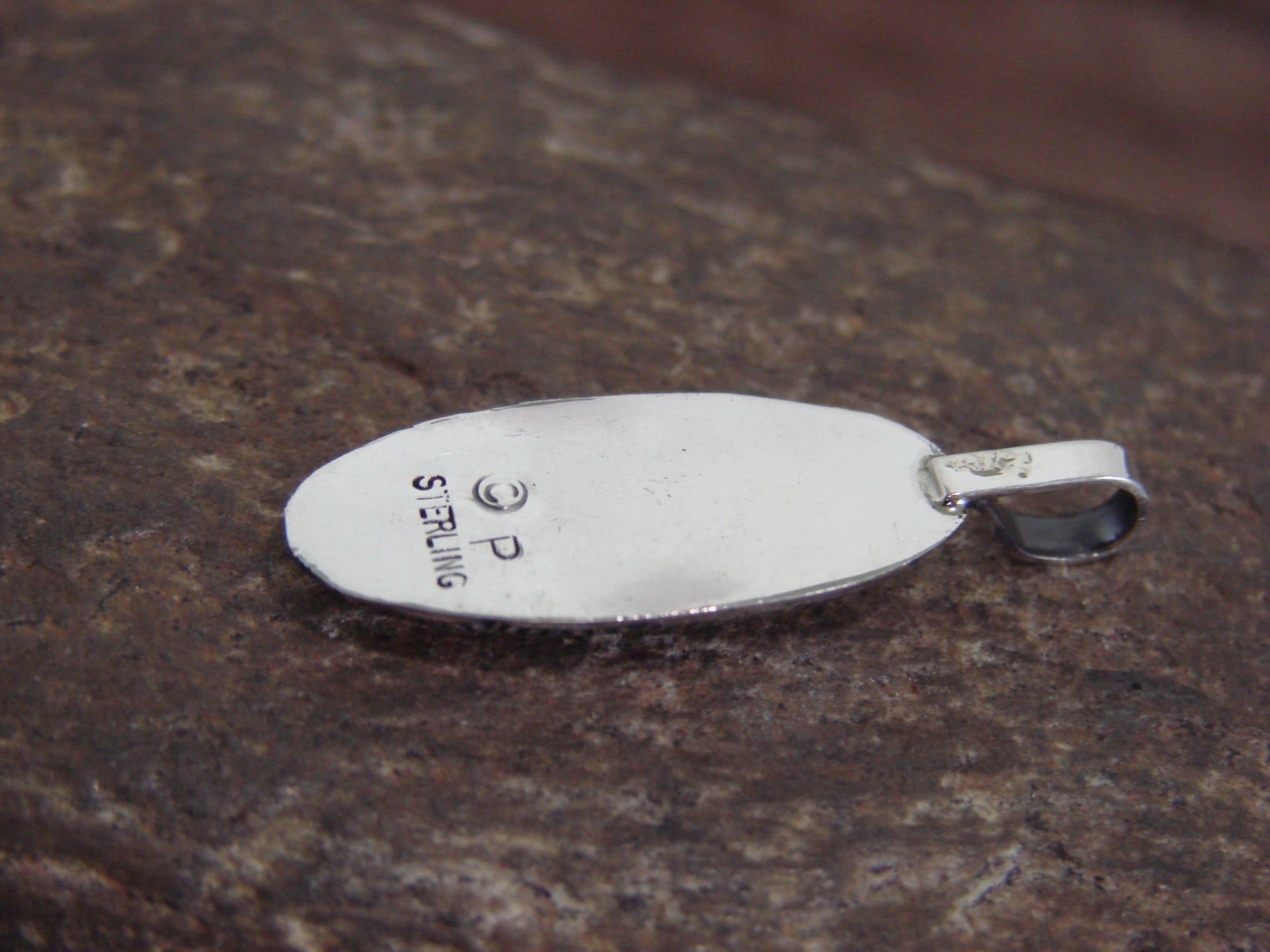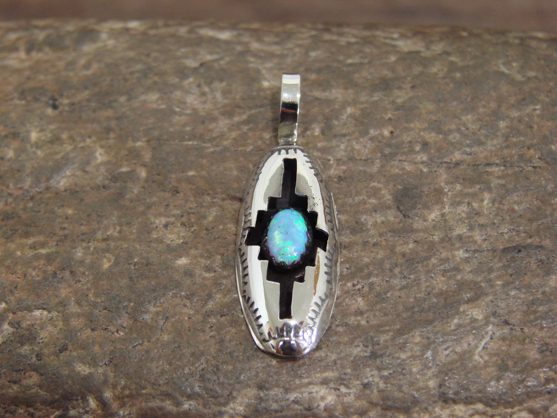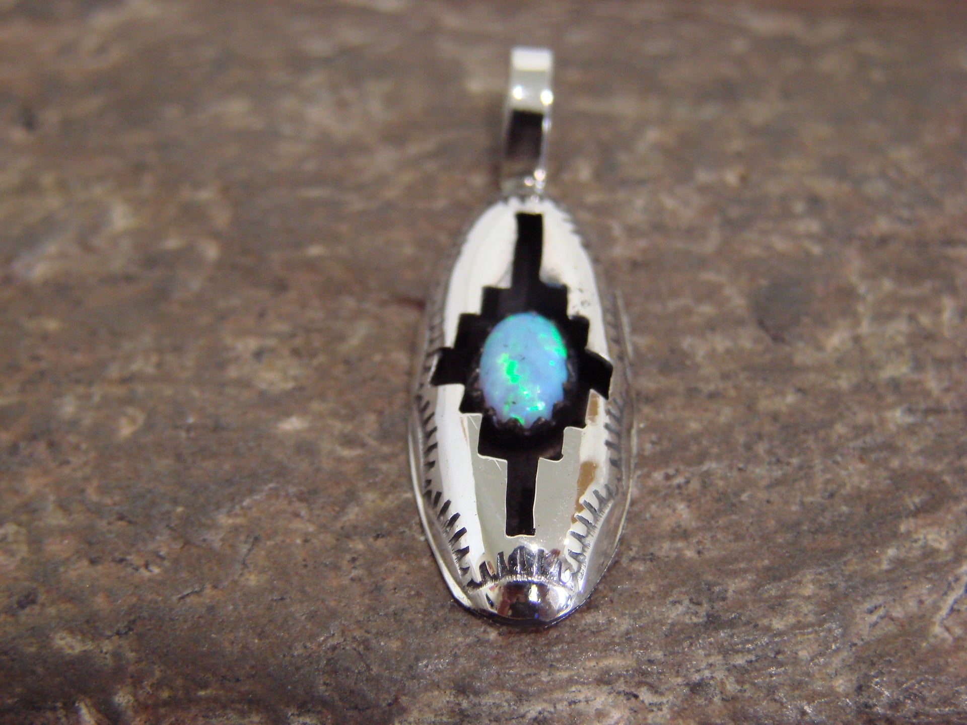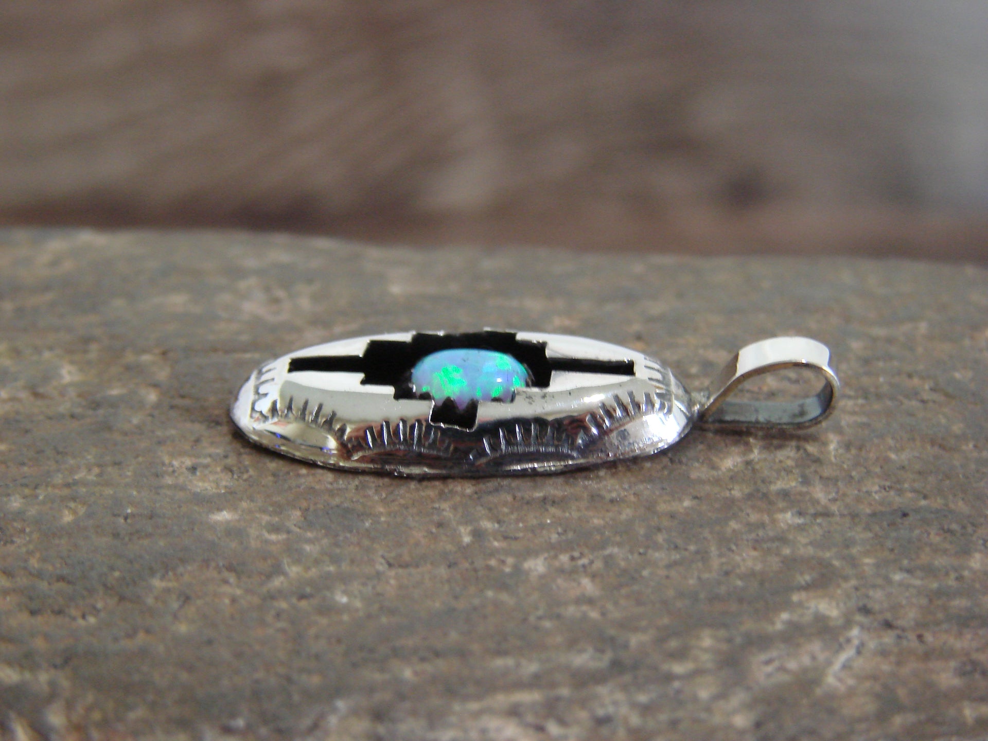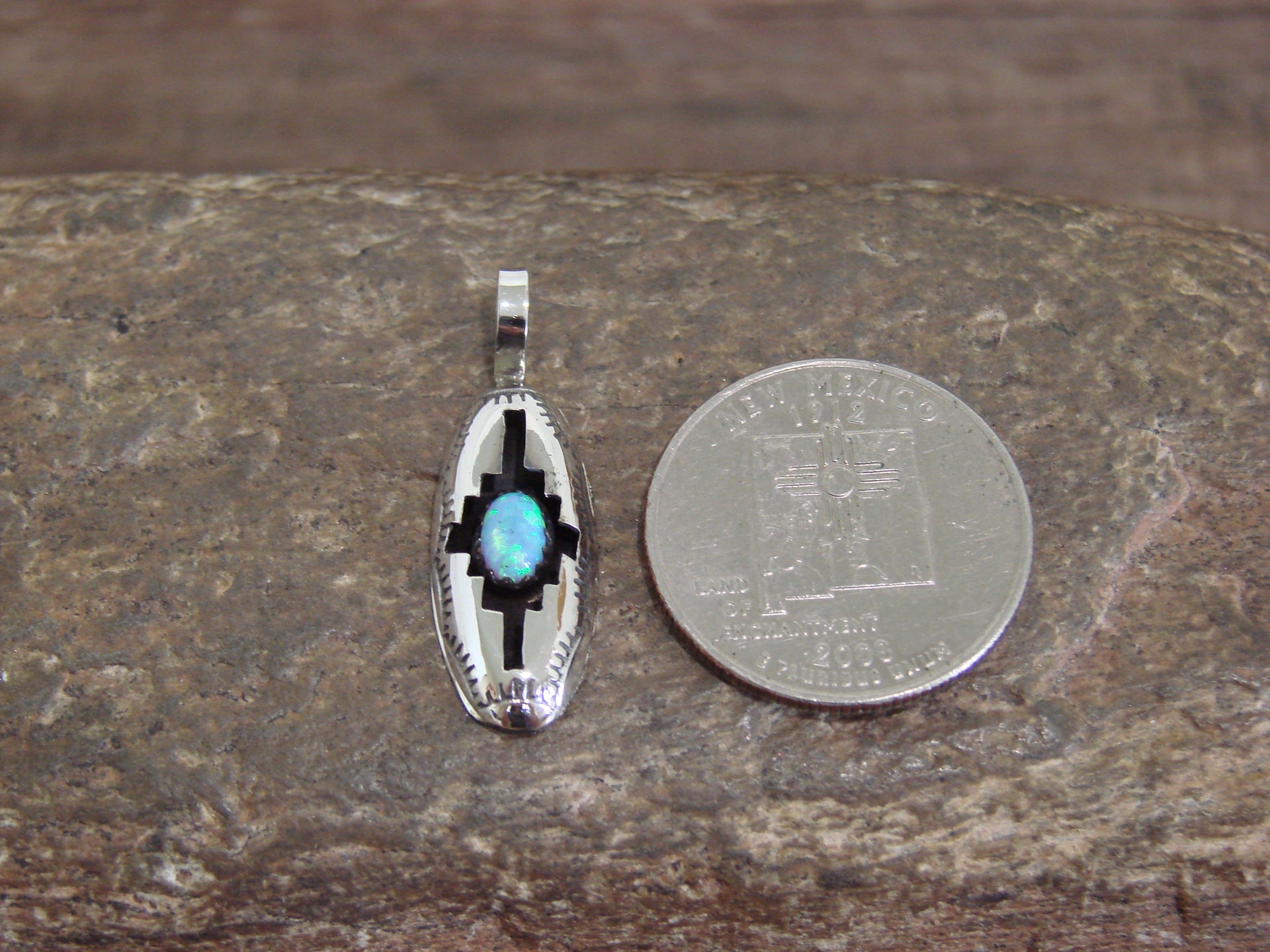 Genuine Native American Navajo Indian Sterling Silver & Blue Opal Shadow Box Pendant from Western New Mexico. This Pendant features a Lab Blue Opal stone set into a sterling silver Crown bezel setting. The Silver is cut out around the stone giving it a very nice shadow box look. Handmade by Felix Perry. Signed "P" and Stamped "Sterling" on the back. Free Shipping with a Gift Box included!
