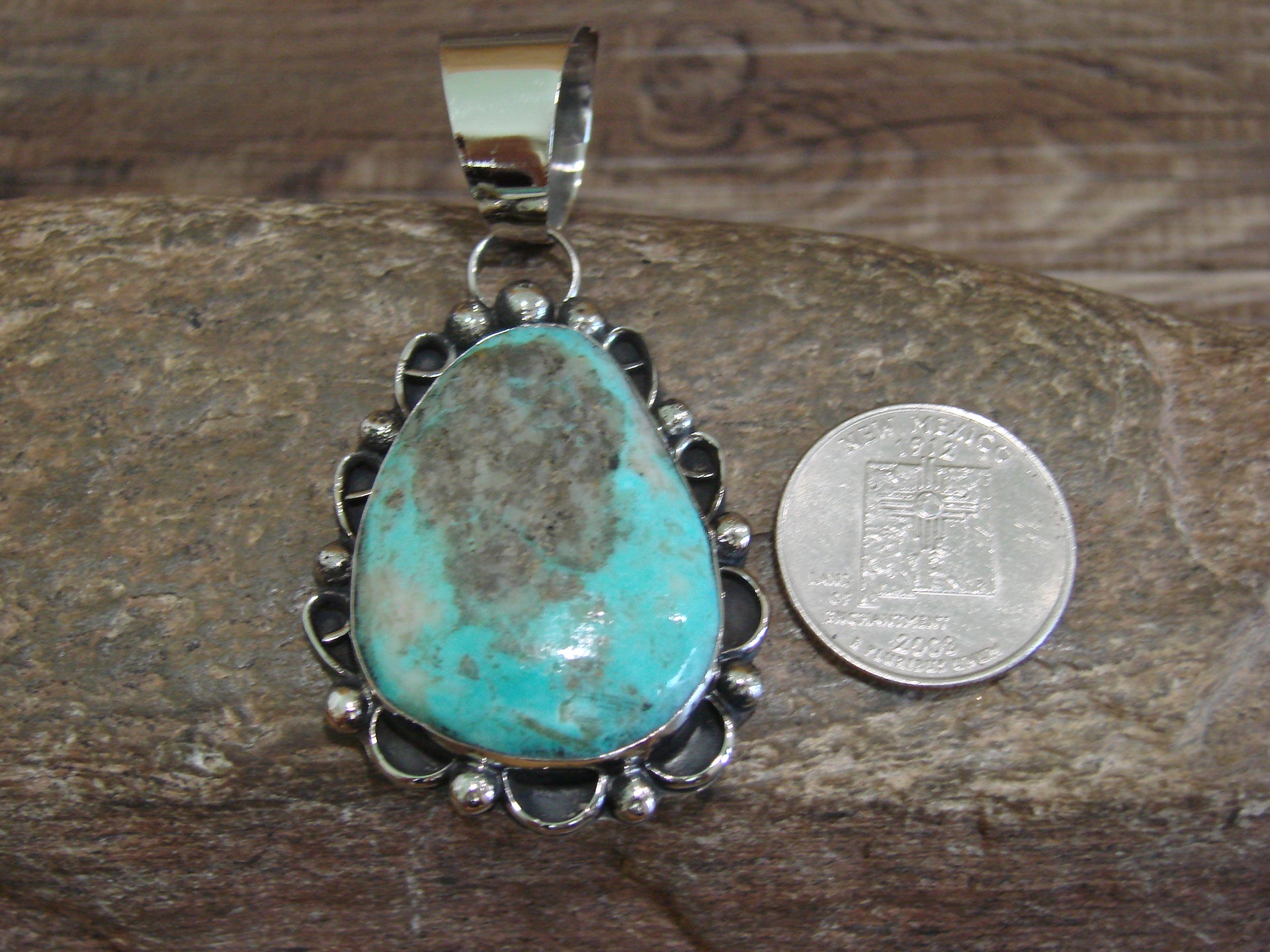 Native American Navajo Indian Nickel Silver & Turquoise Pendant from Western New Mexico. This beautiful Pendant is hand cut from Nickel Silver and features stunning traditional Nickel Silver details throughout. The Genuine Turquoise stone is securely set into a smooth Nickel bezel setting. This Pendant is made with Nickel Silver. Handmade by Jackie Cleveland, wife of the late Navajo Silversmith Albert Cleveland. Signed "JC" on back. Free gift box and shipping included!
