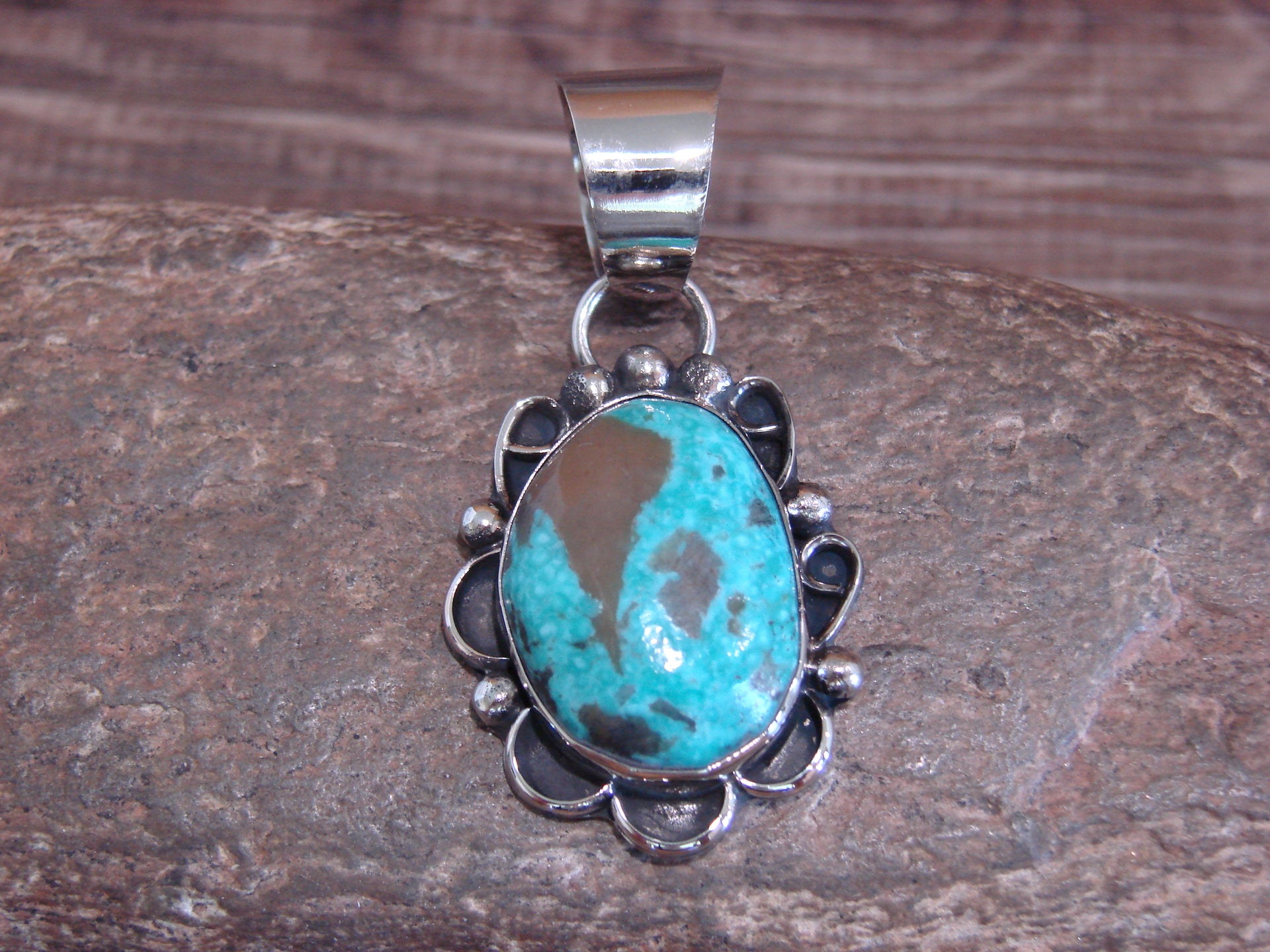 Native American Navajo Indian Nickel Silver & Turquoise Pendant from Western New Mexico. This beautiful Pendant is hand cut from Nickel Silver and features stunning traditional Nickel Silver details throughout. The Genuine Turquoise stone is securely set into a smooth Nickel bezel setting. This Pendant is made with Nickel Silver. Handmade by Jackie Cleveland, wife of the late Navajo Silversmith Albert Cleveland. Signed "JC" on back. Free gift box and shipping included!