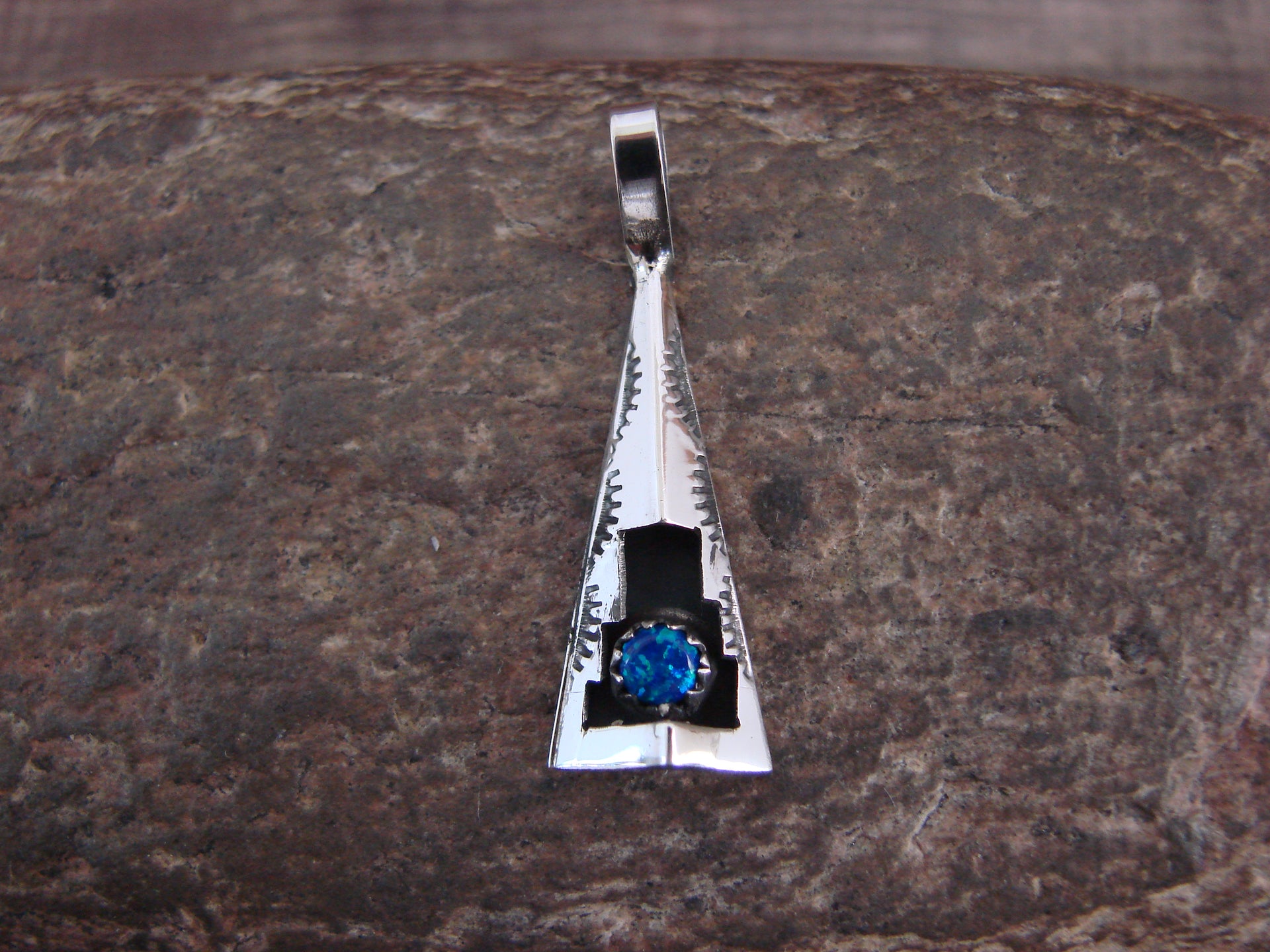 Native American Navajo Indian Sterling Silver & Blue Opal Shadow Box Pendant from Western New Mexico. This Pendant features a Lab Opal stone set into a sterling silver Crown bezel setting. The Silver is cut out around the stone giving it a very nice shadow box look. Handmade by Felix Perry. Signed "P" and Stamped "Sterling" on the back. Free Shipping with a Gift Box included!