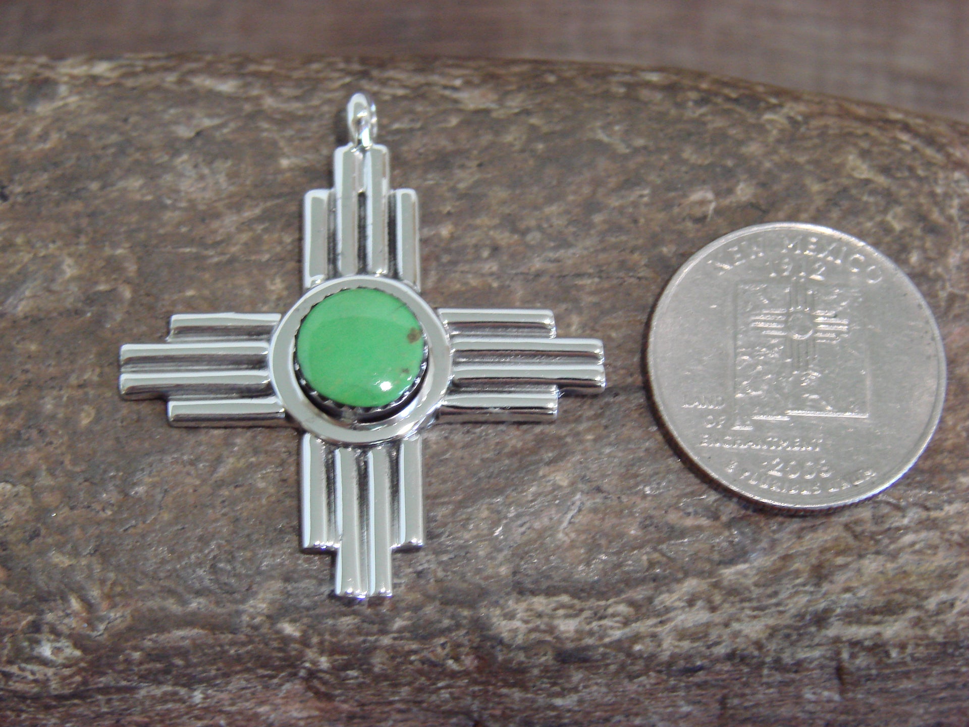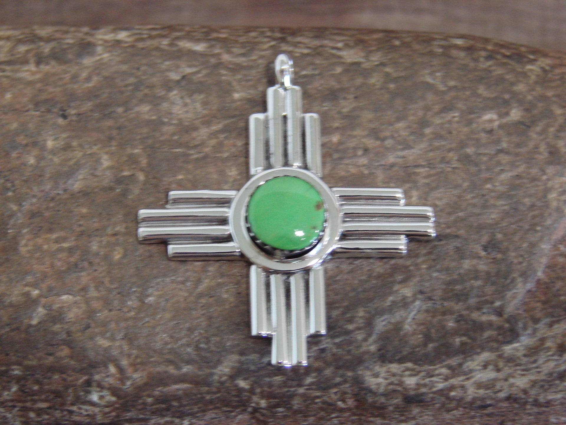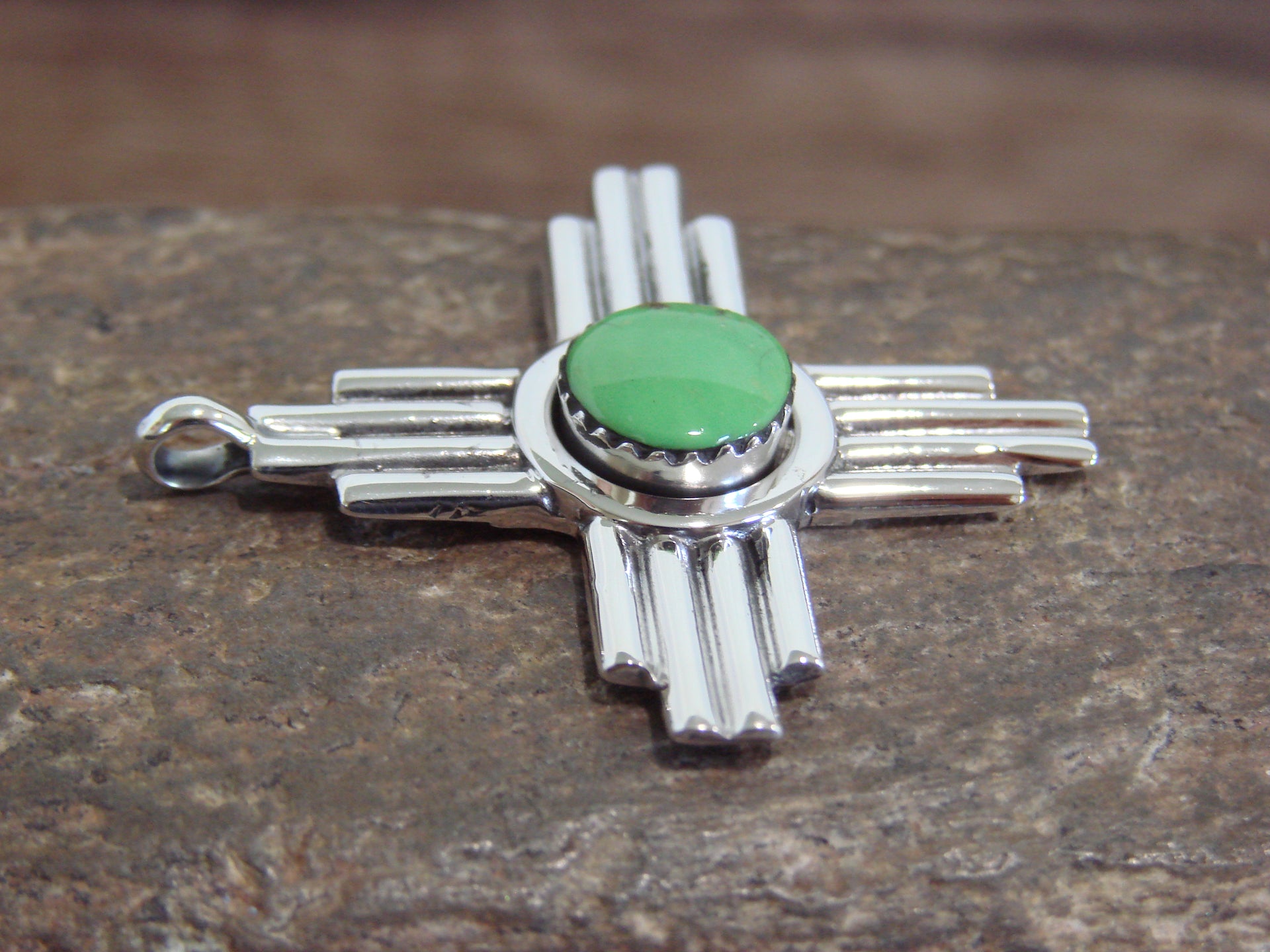 Genuine Native American Navajo Indian Sterling Silver & Gaspeite Zia Symbol Pendant from Western New Mexico. This Beautiful pendant features a Genuine Gaspeite stone intricately set into a crown Sterling Silver bezel setting within the center of a Smooth Sterling Silver Zia Cross. This Zia is Genuine and Stunning! Navajo Indian handmade by Ryntanna Yazzie. Hallmarked on the back. Free shipping and gift box included!