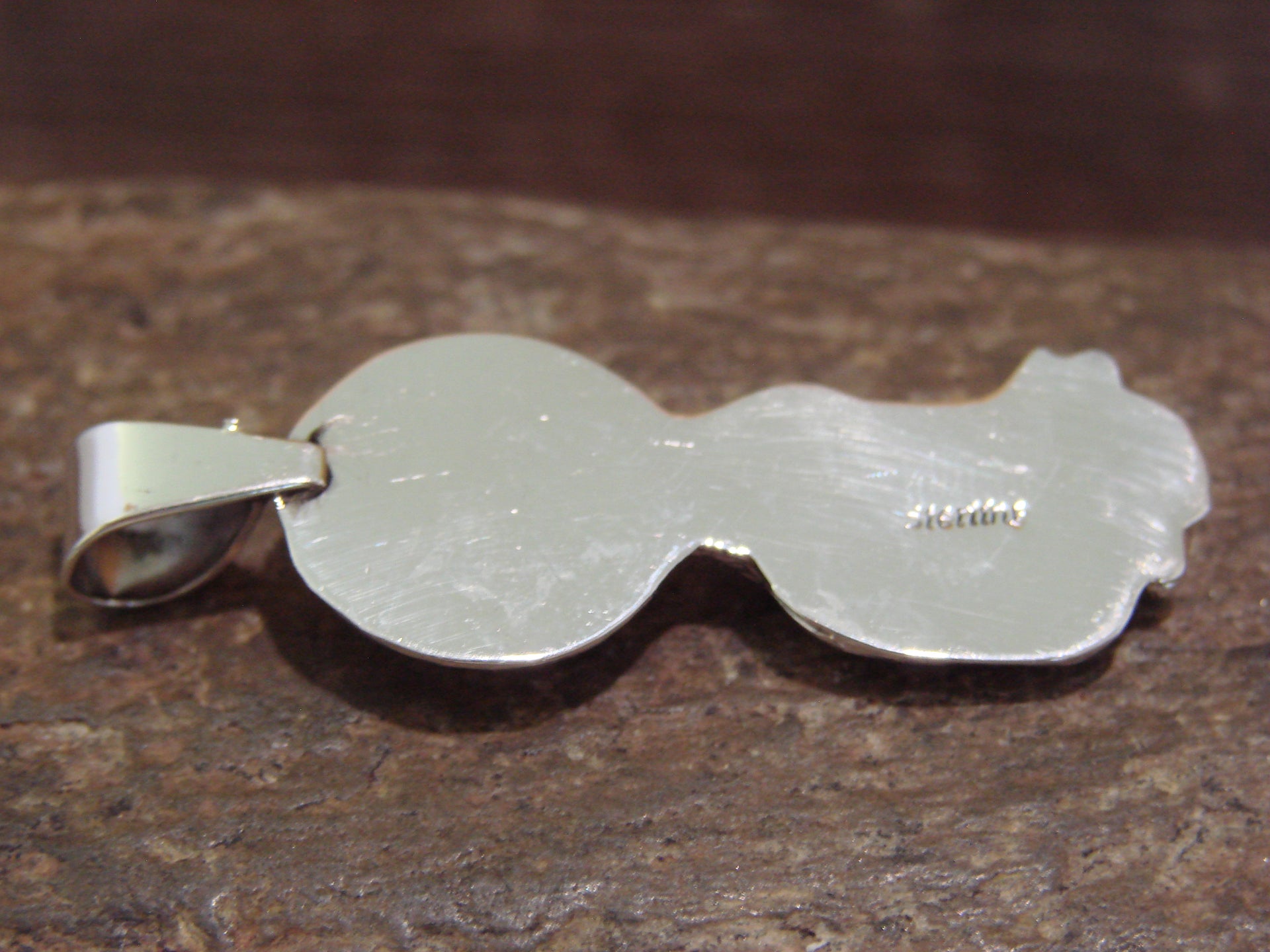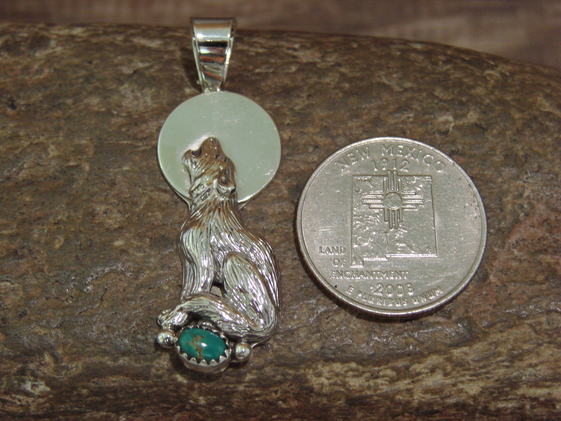Native American Navajo Indian Sterling Silver Green Turquoise Pendant from Western New Mexico. This pendant features a beautiful Greener Turquoise stone set into a crown sterling silver bezel and nicely polished. Surrounding the stone is beautiful hand stamping and a sterling silver Wolf. Navajo Indian handmade by Samuel Yellowhair. Stamped "Sterling" on the back. Free shipping and gift box included!