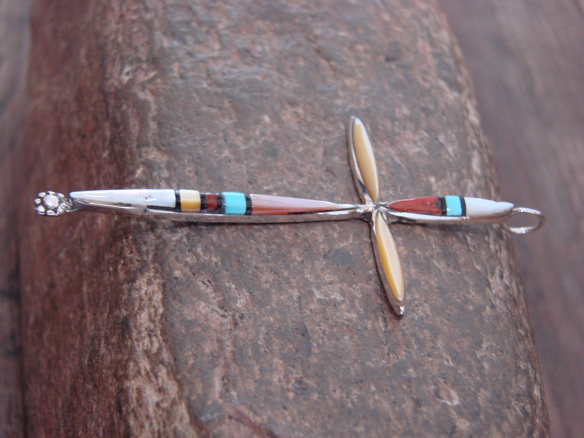 Native American Zuni Indian Silver & Multi Stone Inlay Cross Pendant from Western New Mexico. This Cross features beautiful genuine Turquoise, Coral, Onyx, and Shell stones beautifully inlayed into a smooth sterling silver Cross setting. This Cross is Stunning! Hand made by Zuni Silversmith Sylvester Noche. Hallmarked on the back. Free Shipping with a gift box included!
