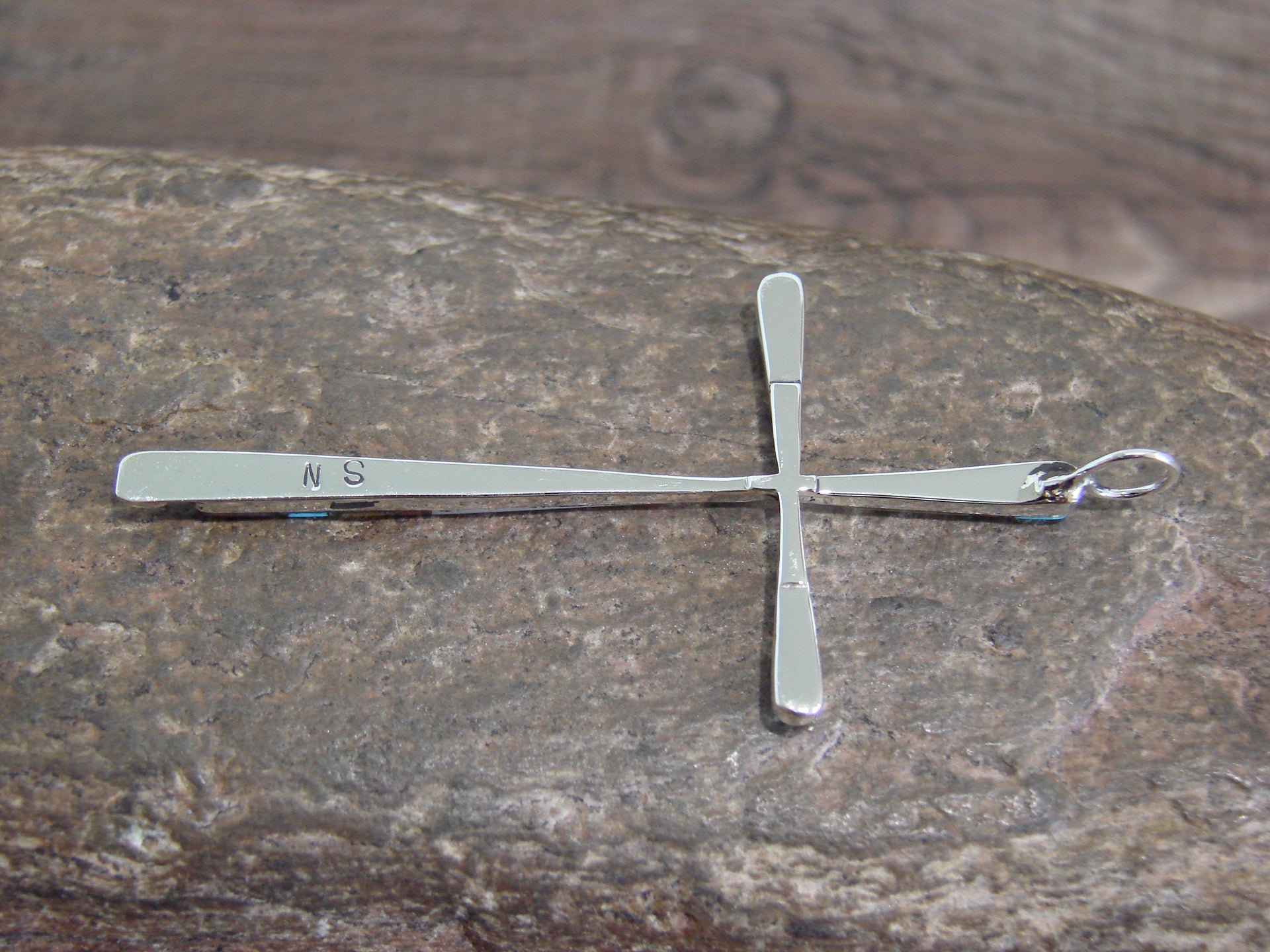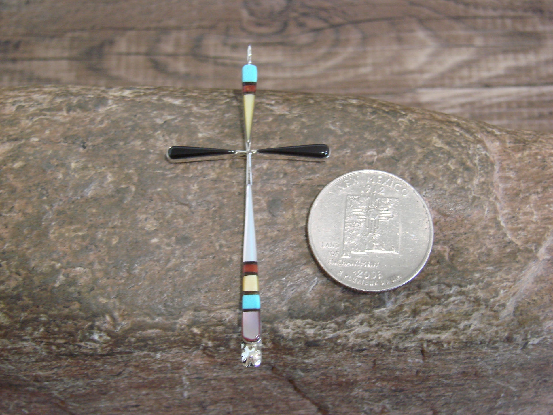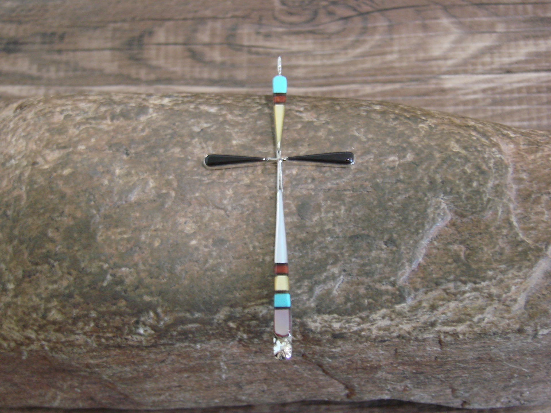Genuine Native American Zuni Indian Silver & Multi Stone Inlay Cross Pendant from Western New Mexico. This Cross features beautiful genuine Turquoise, Coral, Onyx, and Shell stones beautifully inlayed into a smooth sterling silver Cross setting. This Cross is Stunning! Hand made by Zuni Silversmith Sylvester Noche. Signed "SN" on the back. Free Shipping with a gift box included!