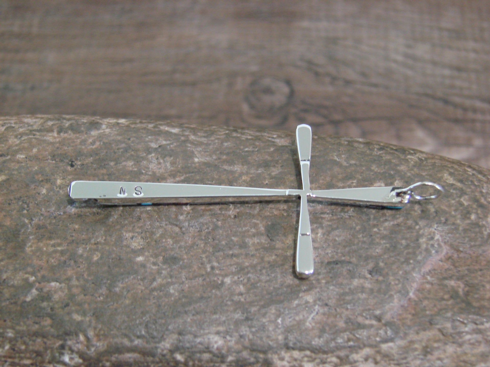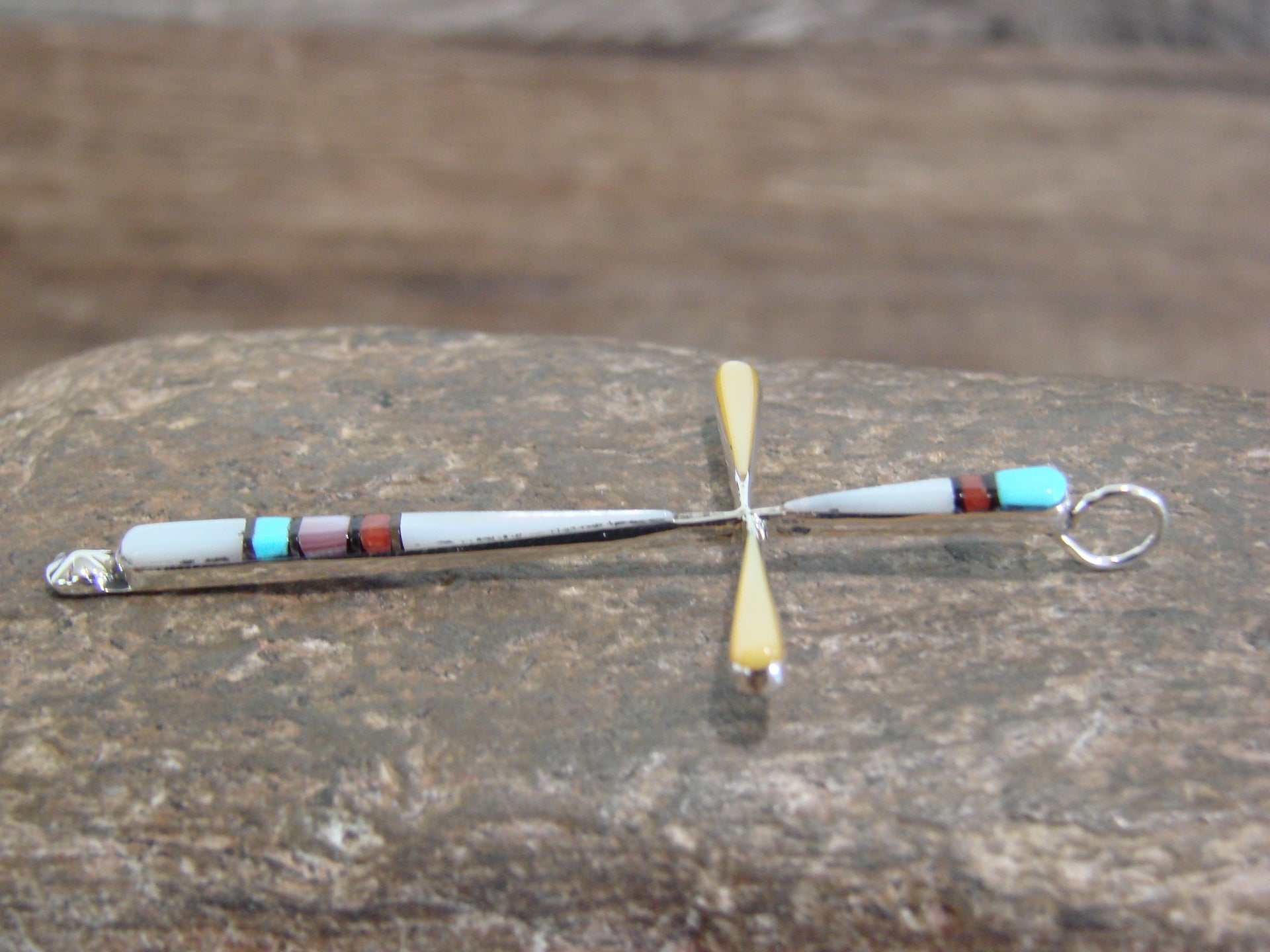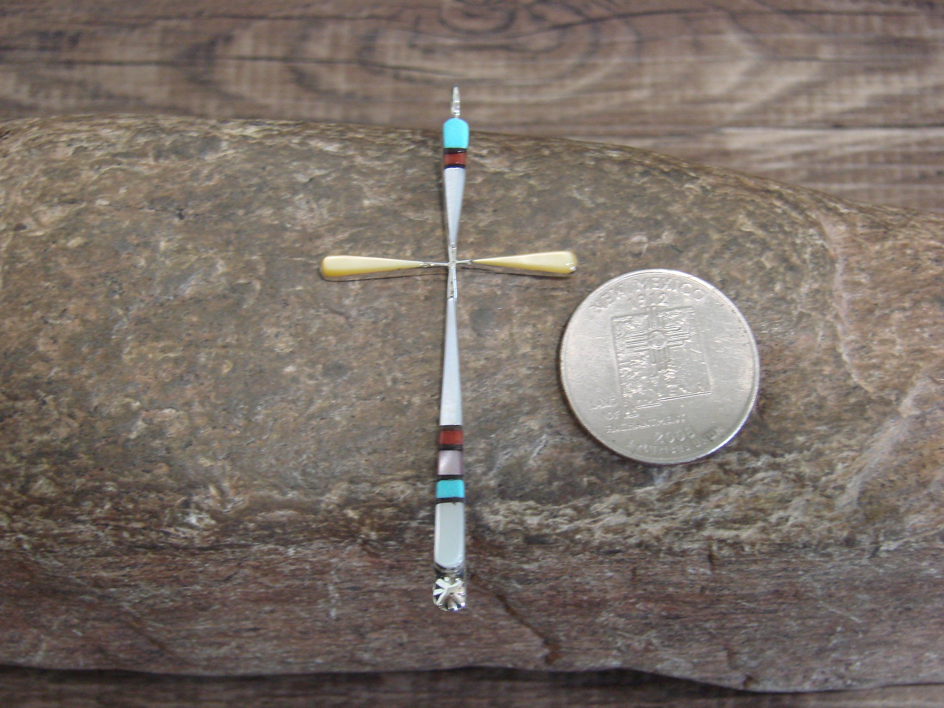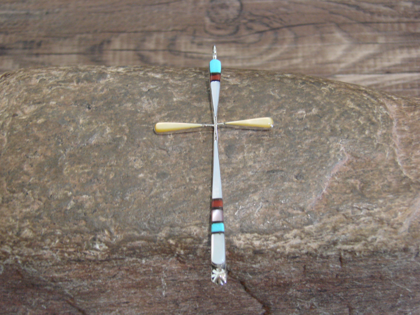 Genuine Native American Zuni Indian Silver & Multi Stone Inlay Cross Pendant from Western New Mexico. This Cross features beautiful genuine Turquoise, Coral, Onyx, and Shell stones beautifully inlayed into a smooth sterling silver Cross setting. This Cross is Stunning! Hand made by Zuni Silversmith Sylvester Noche. Signed "SN" on the back. Free Shipping with a gift box included!