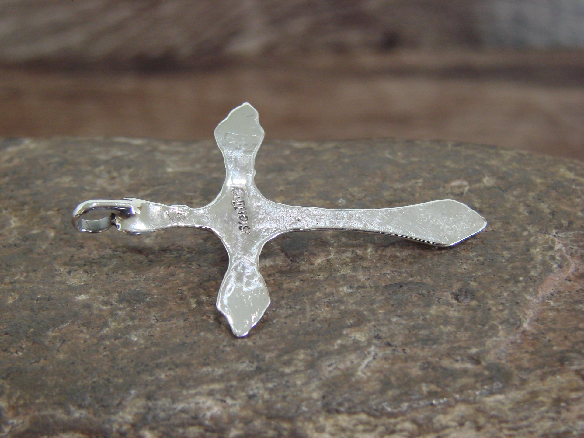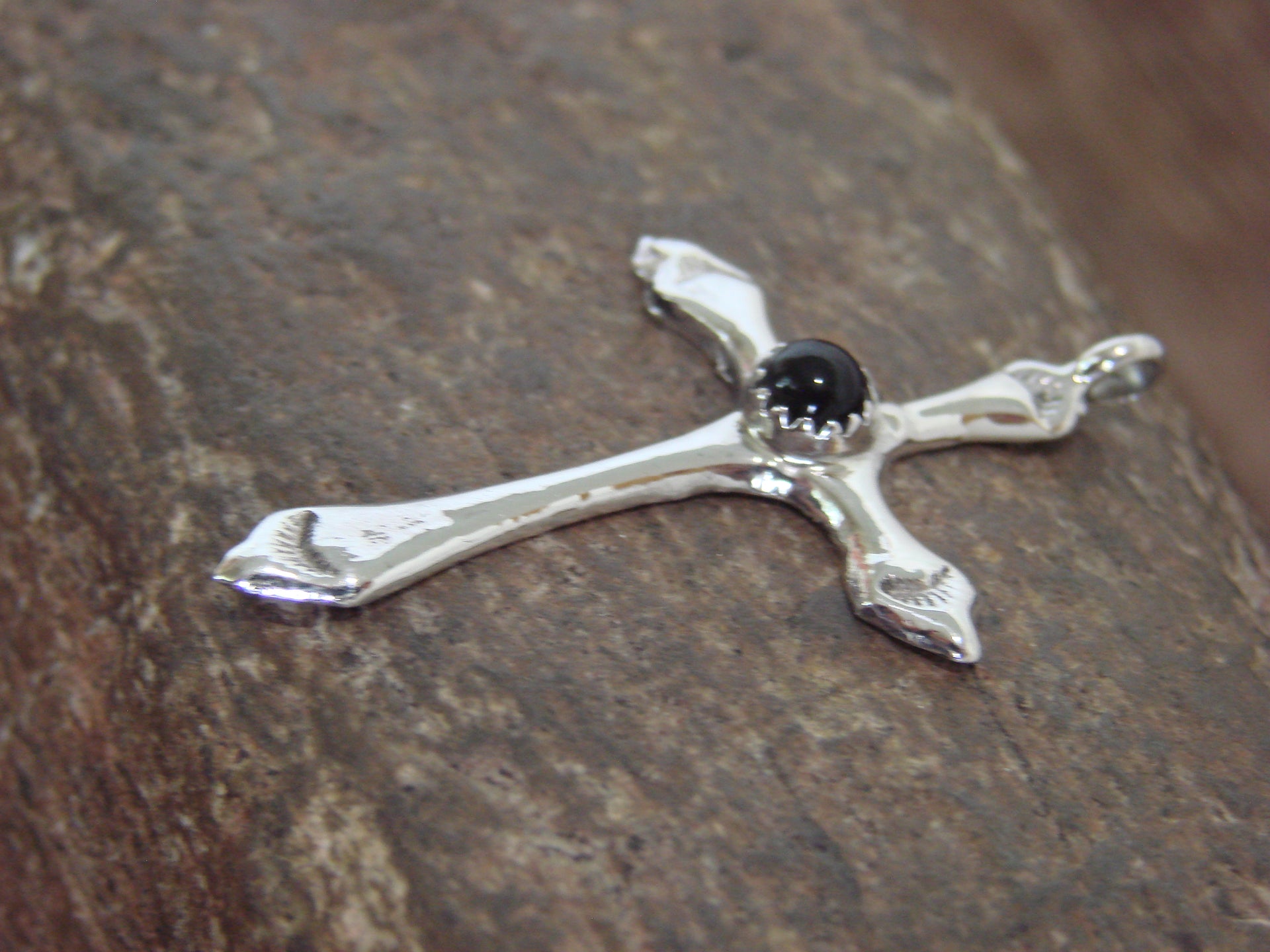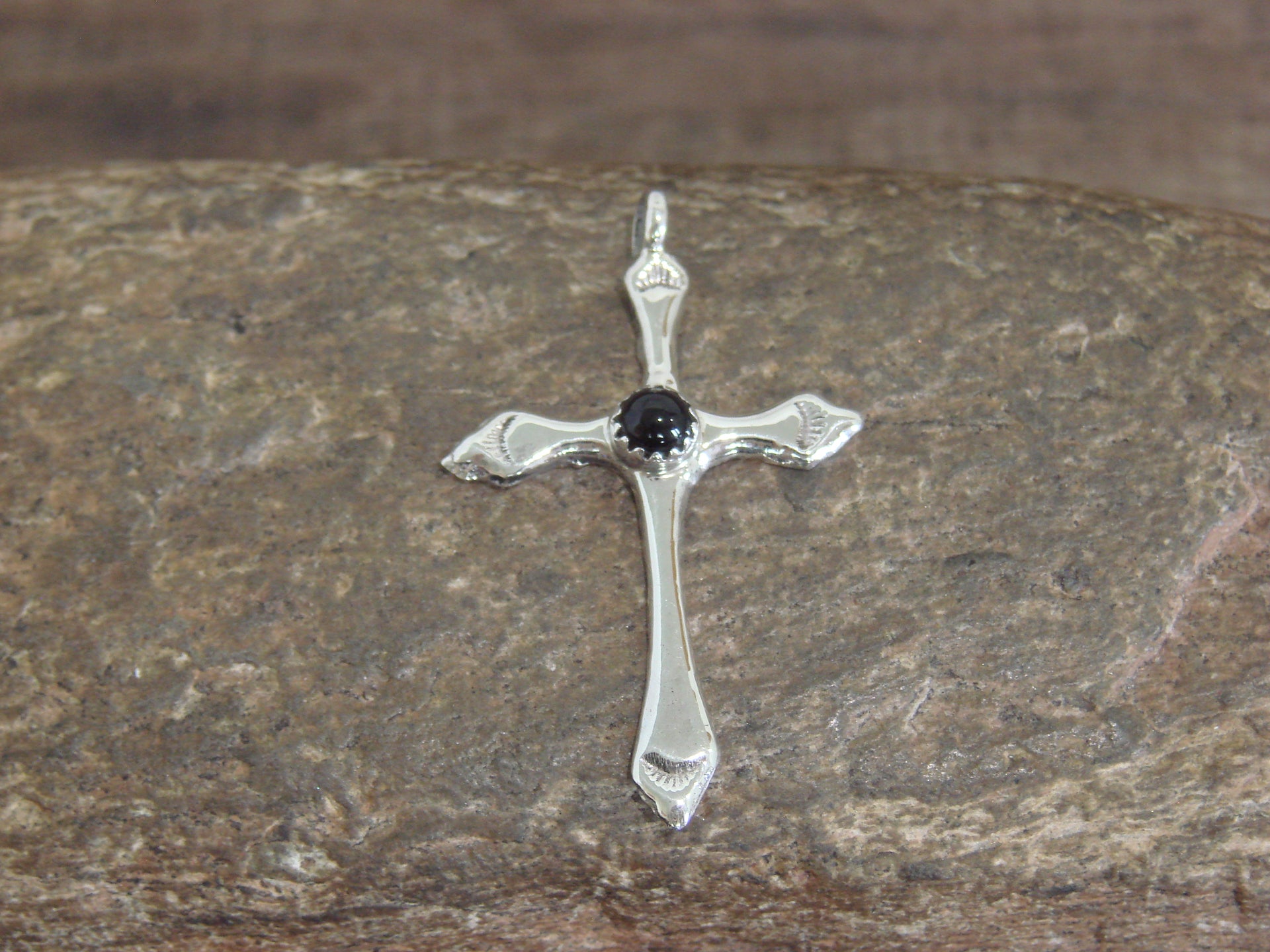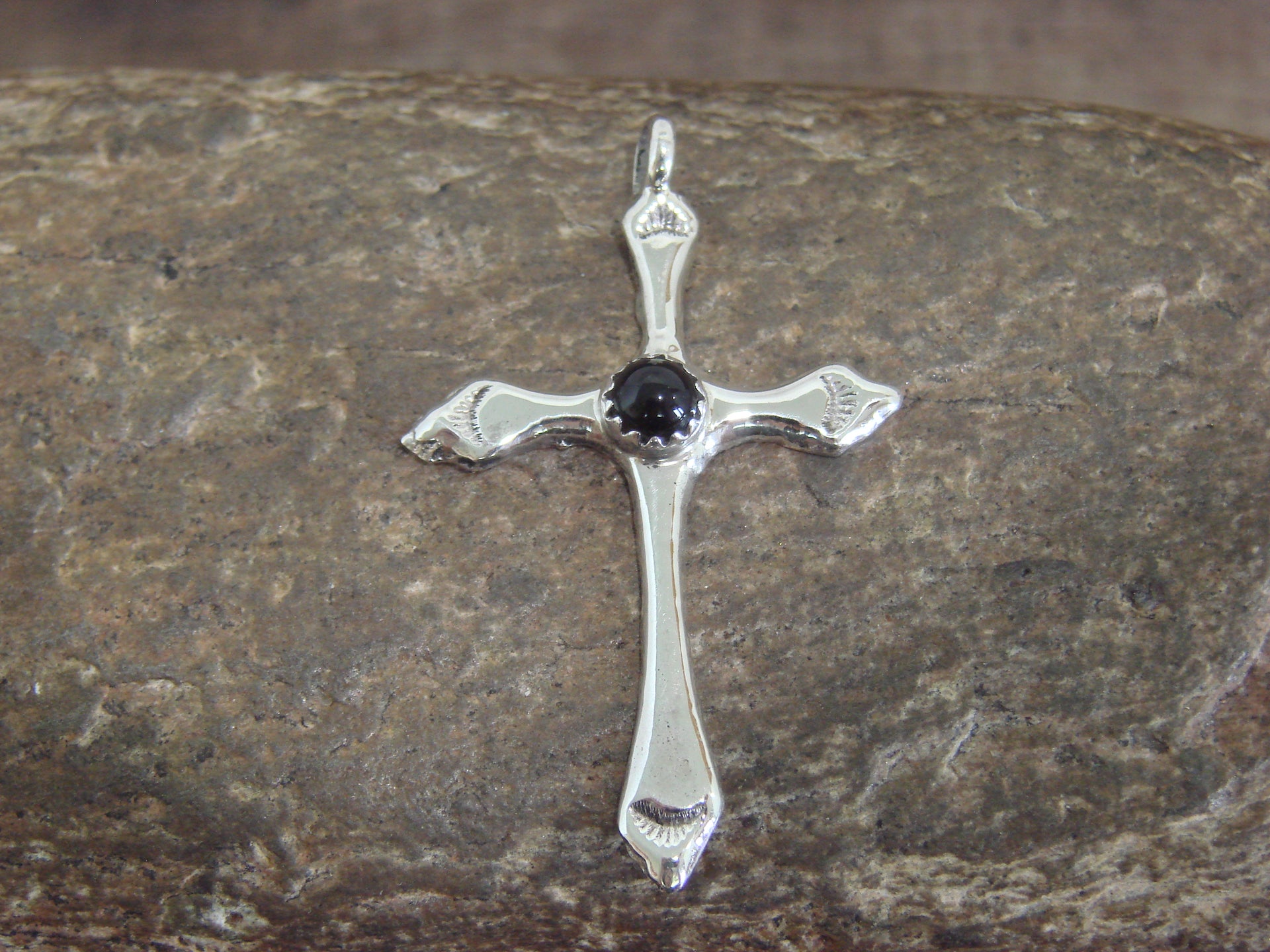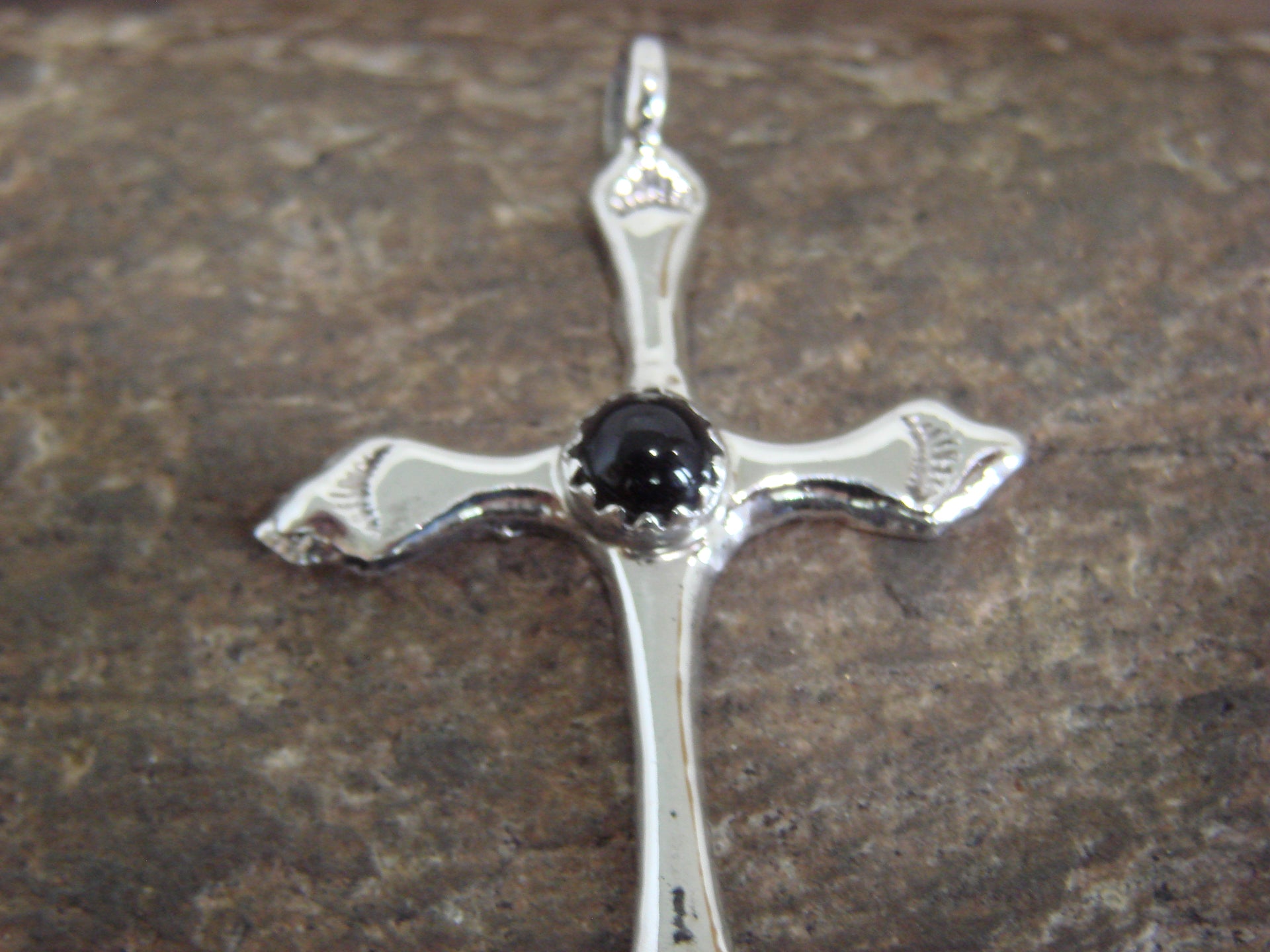 Native American Navajo Indian Sterling Silver & Onyx Cross Pendant from Western New Mexico. This Beautiful Cross Pendant features an Onyx stone set into a crown sterling silver bezel setting. The stone is placed within the center of a Hand Stamped Sterling Silver cross. This is a great Pendant! Hand made by Navajo Silversmith Rochelle Bekis. Stamped "Sterling" on the back. Free Shipping with a gift box included!