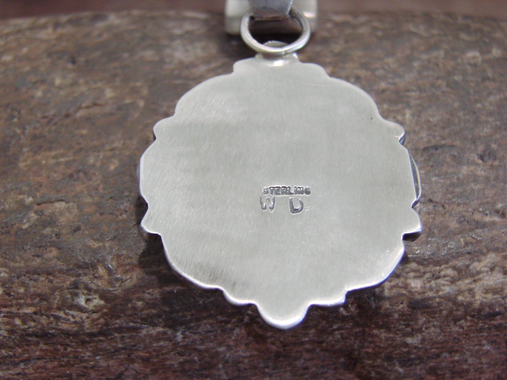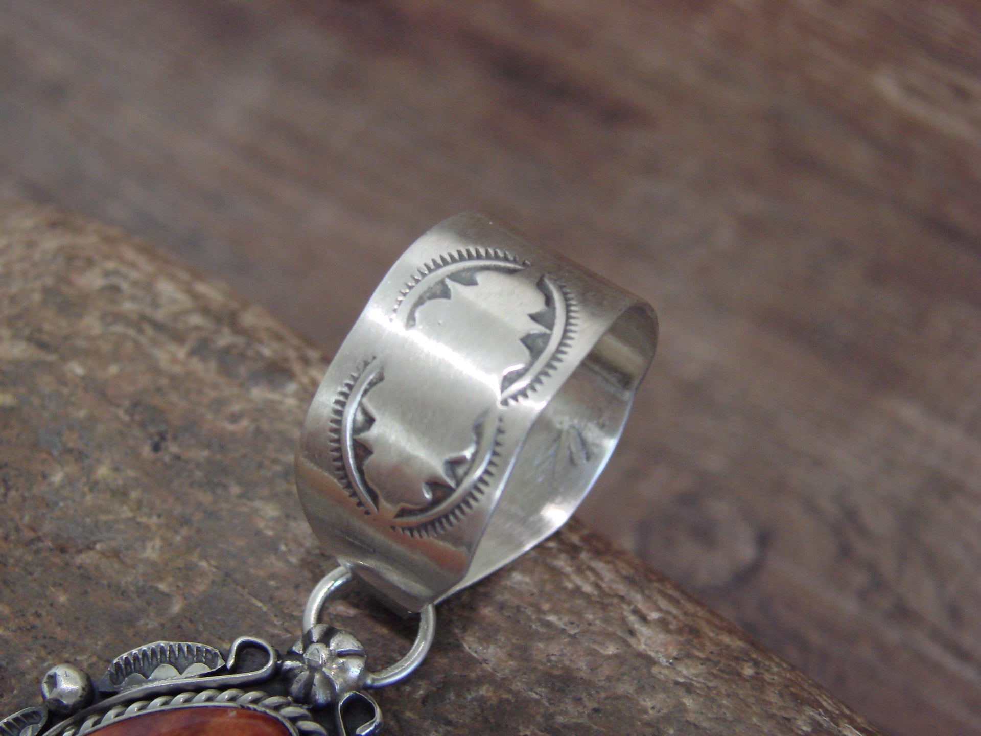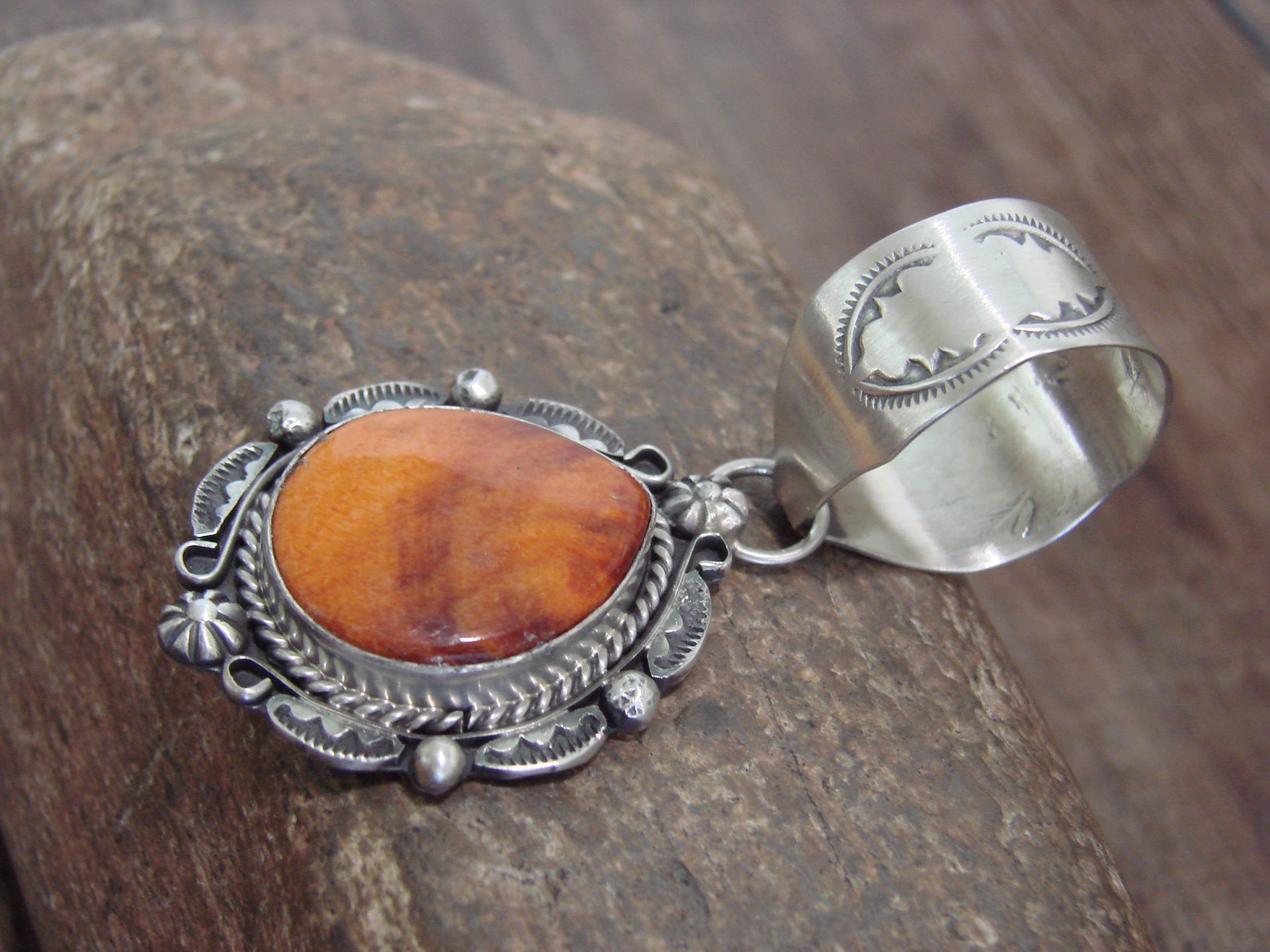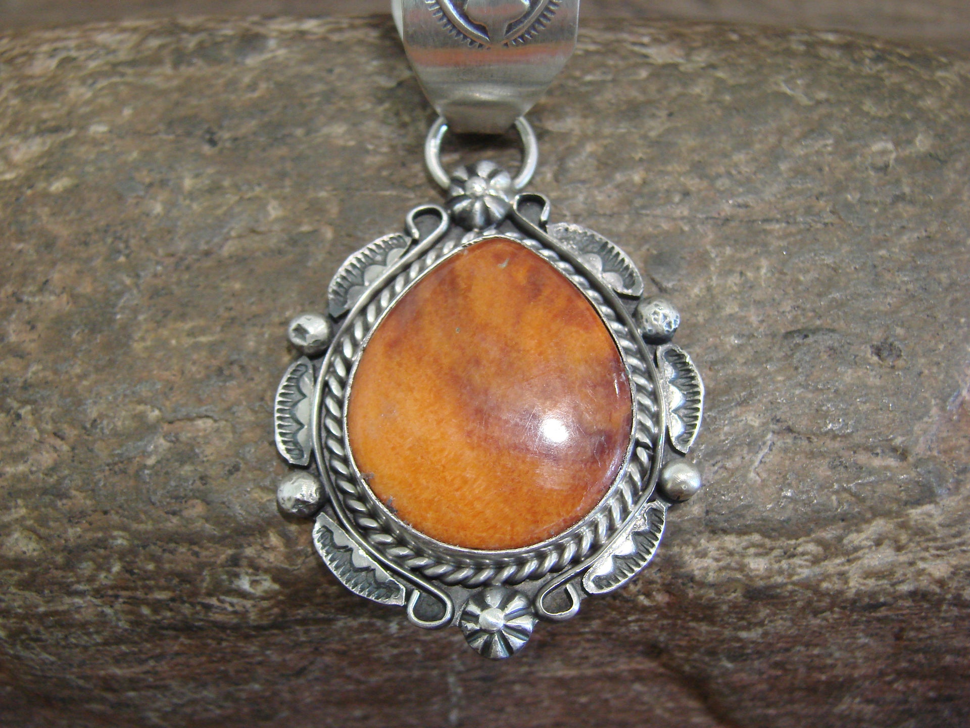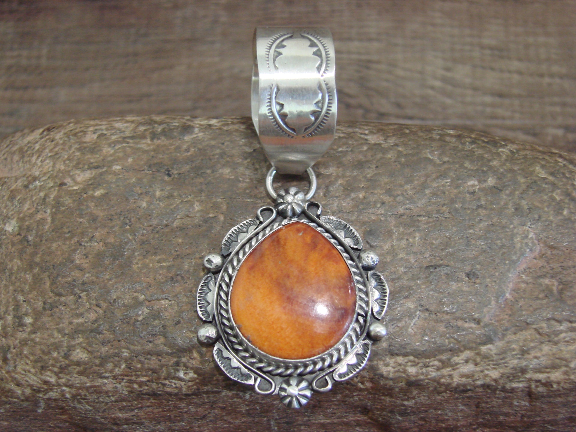 Genuine Native American Navajo Indian Sterling Silver & Spiny Oyster Pendant from Western New Mexico. This Stunning pendant features a Genuine Spiny Oyster stone intricately set into a smooth Sterling Silver bezel setting. Beautiful Sterling Silver details and Hand Stamping surround the stone. Hand Made to Perfection by Navajo Artist Wilson Dawes. Signed "WD" and Stamped "Sterling" on back. Free gift box and shipping included!