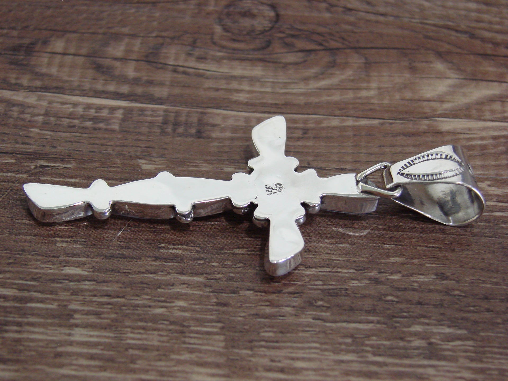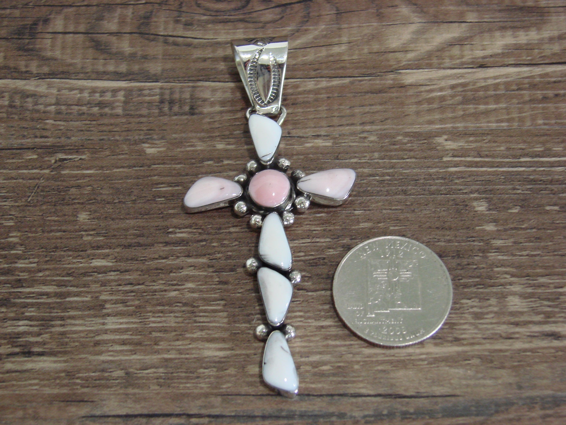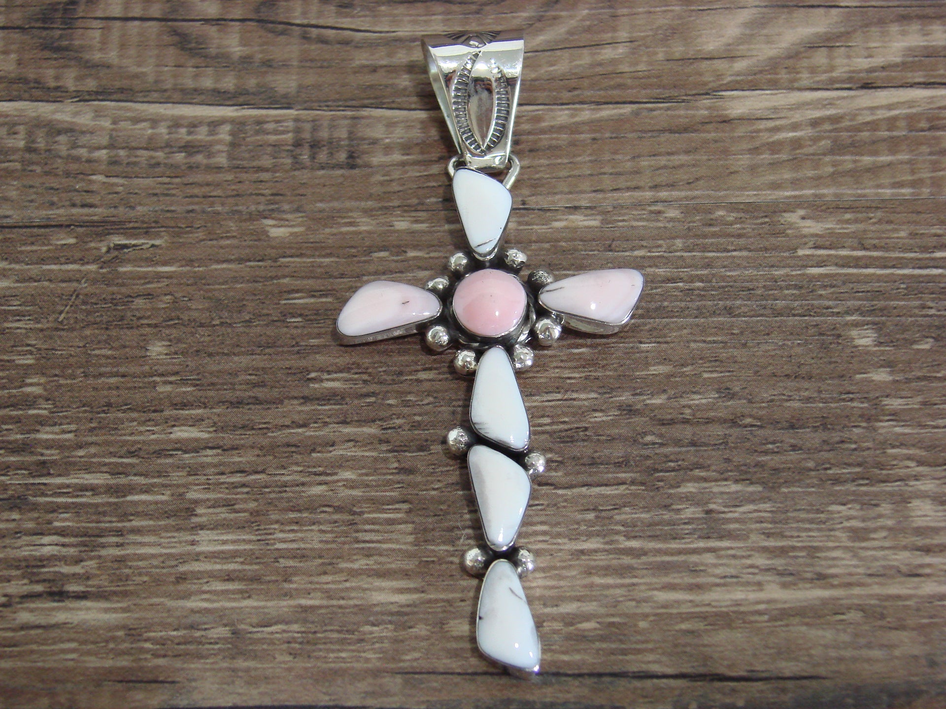 Genuine Native American Navajo Indian Silver & Pink Shell Cross Pendant from Western New Mexico. This Beautiful Cross Pendant features beautiful, Genuine Pink Shell stones set into smooth sterling silver bezel settings. This Cross features traditional hand stamping and gorgeous details throughout. This pendant is Stunning! Hand made by Navajo Silversmith Sheena Jack. Hallmarked on the back. Free Shipping with a gift box included!