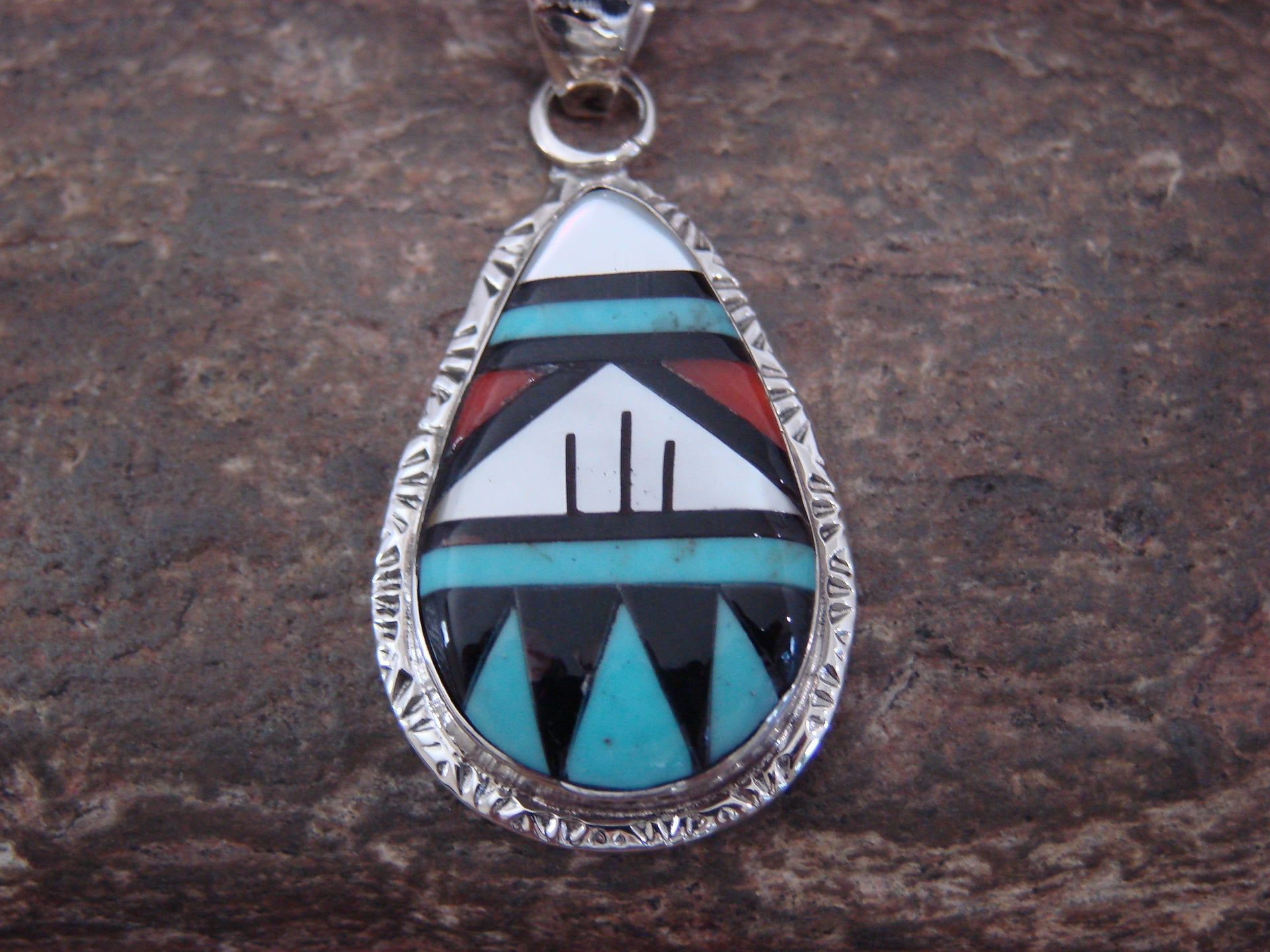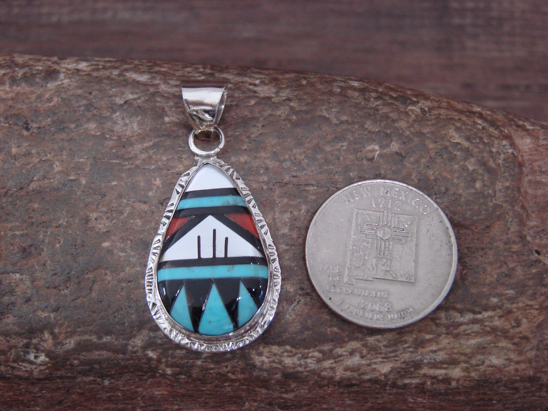 Native American Zuni Indian Sterling Silver & Multi Stone Inlay Pendant from Western New Mexico. This beautiful Pendant is hand cut from Sterling Silver and features stunning traditional Sterling Silver details throughout. The Genuine Turquoise, Coral, Onyx, and Shell stones are beautifully inlaid into smooth Sterling Silver settings. Handmade by Zuni Silver Smith's Leslie & Gladys Lamy. Signed and Stamped Sterling on back. Free gift box and shipping included!