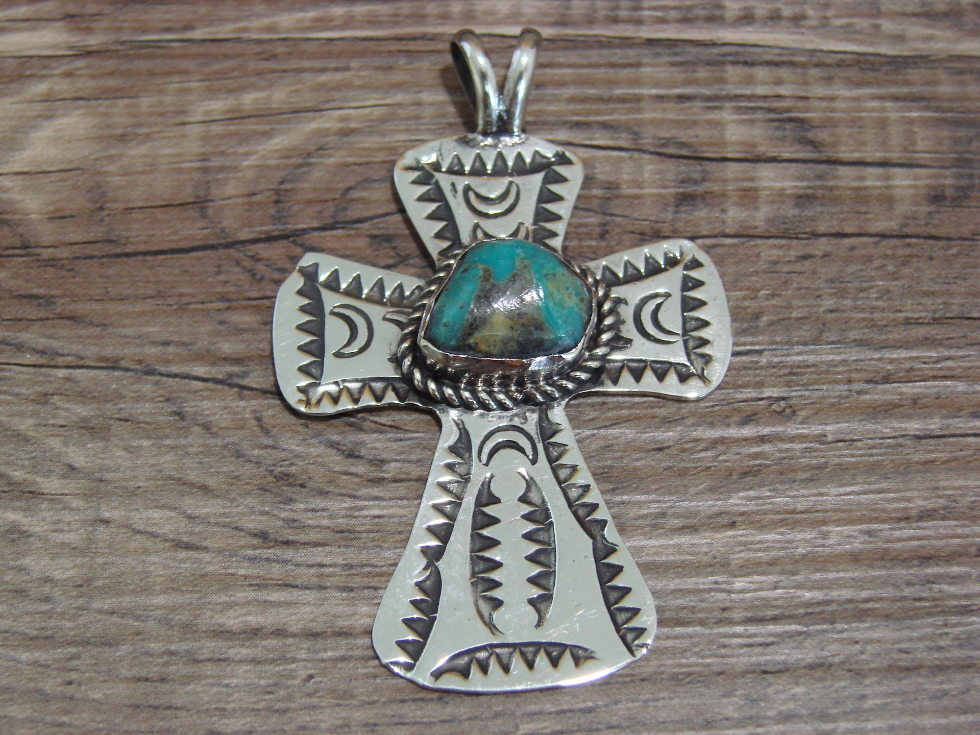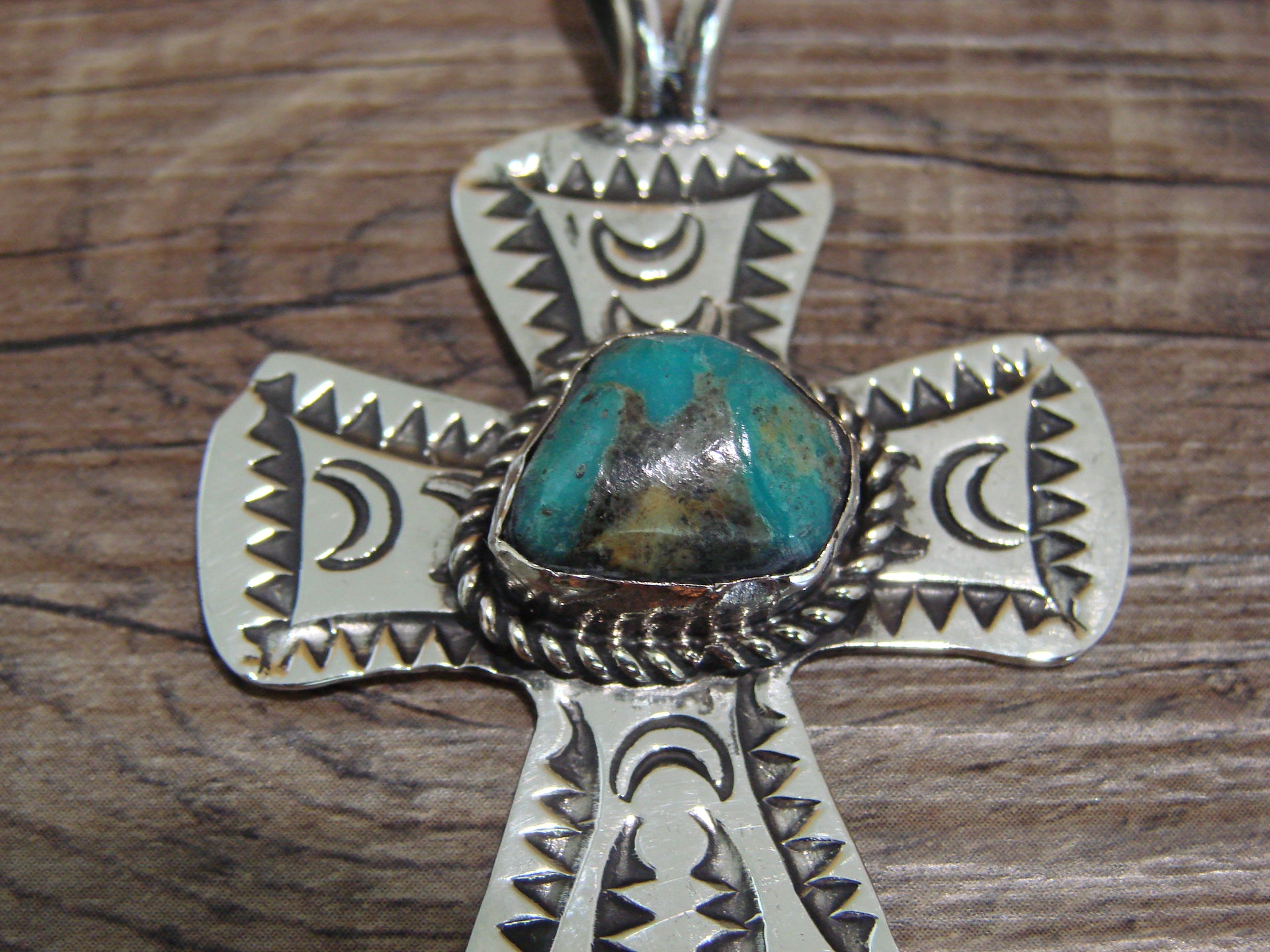 Navajo Indian Nickel Silver & Turquoise Cross Pendant - Cleveland