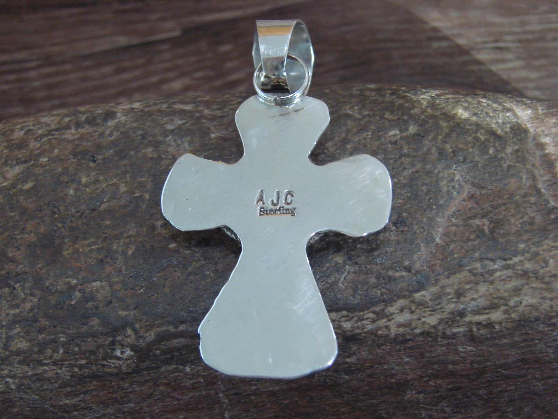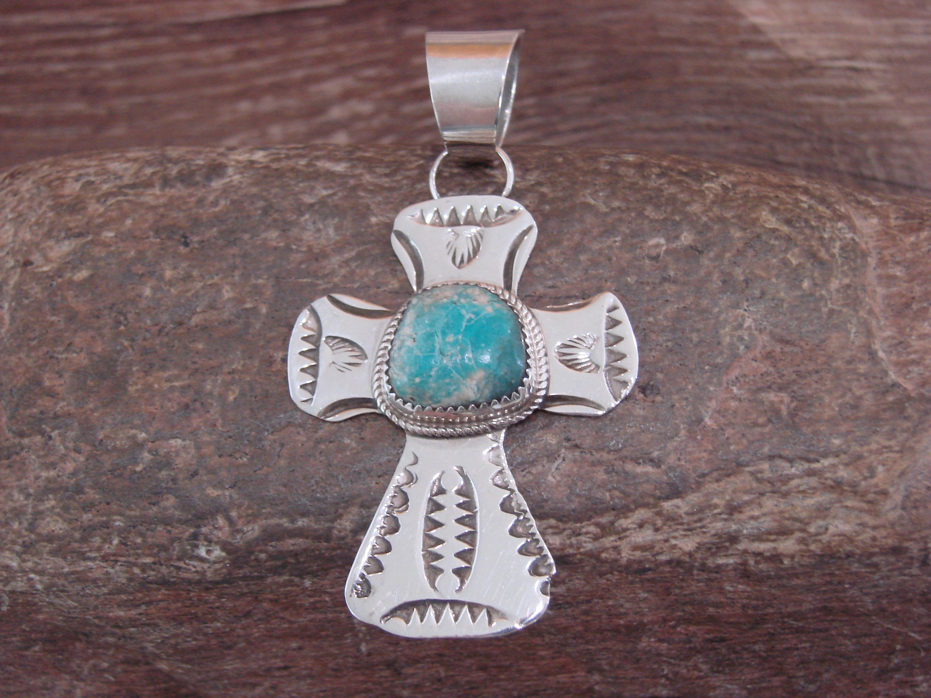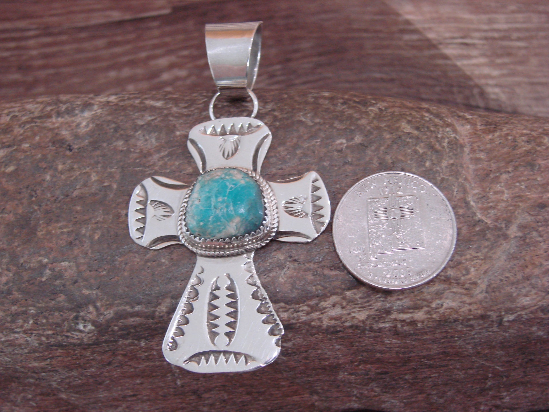 Native American Navajo Indian Sterling Silver & Turquoise Cross Pendant from Western New Mexico. This beautiful Cross Pendant is hand cut from Sterling Silver and features stunning traditional hand stamping throughout. The Genuine Turquoise stone is securely set into a crown Sterling Silver bezel setting. This Cross Pendant is Gorgeous! Handmade by Jackie Cleveland, wife of the late Navajo Silversmith Albert Cleveland. Signed "AJC" and Stamped "Sterling" on back. Jackie is widely known for her traditional Navajo style and hand stamping. Free gift box and shipping included!