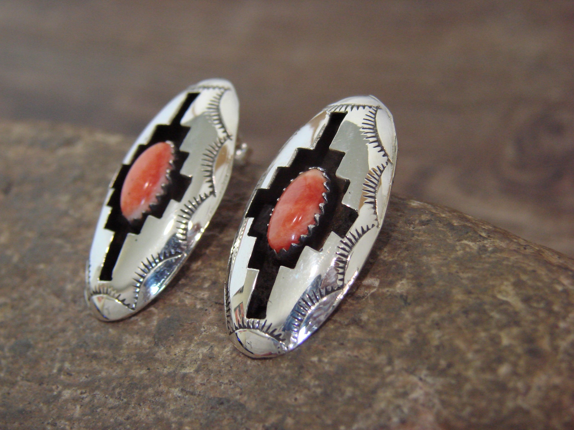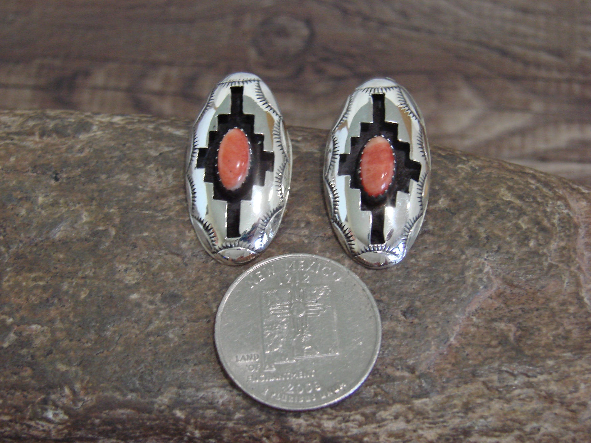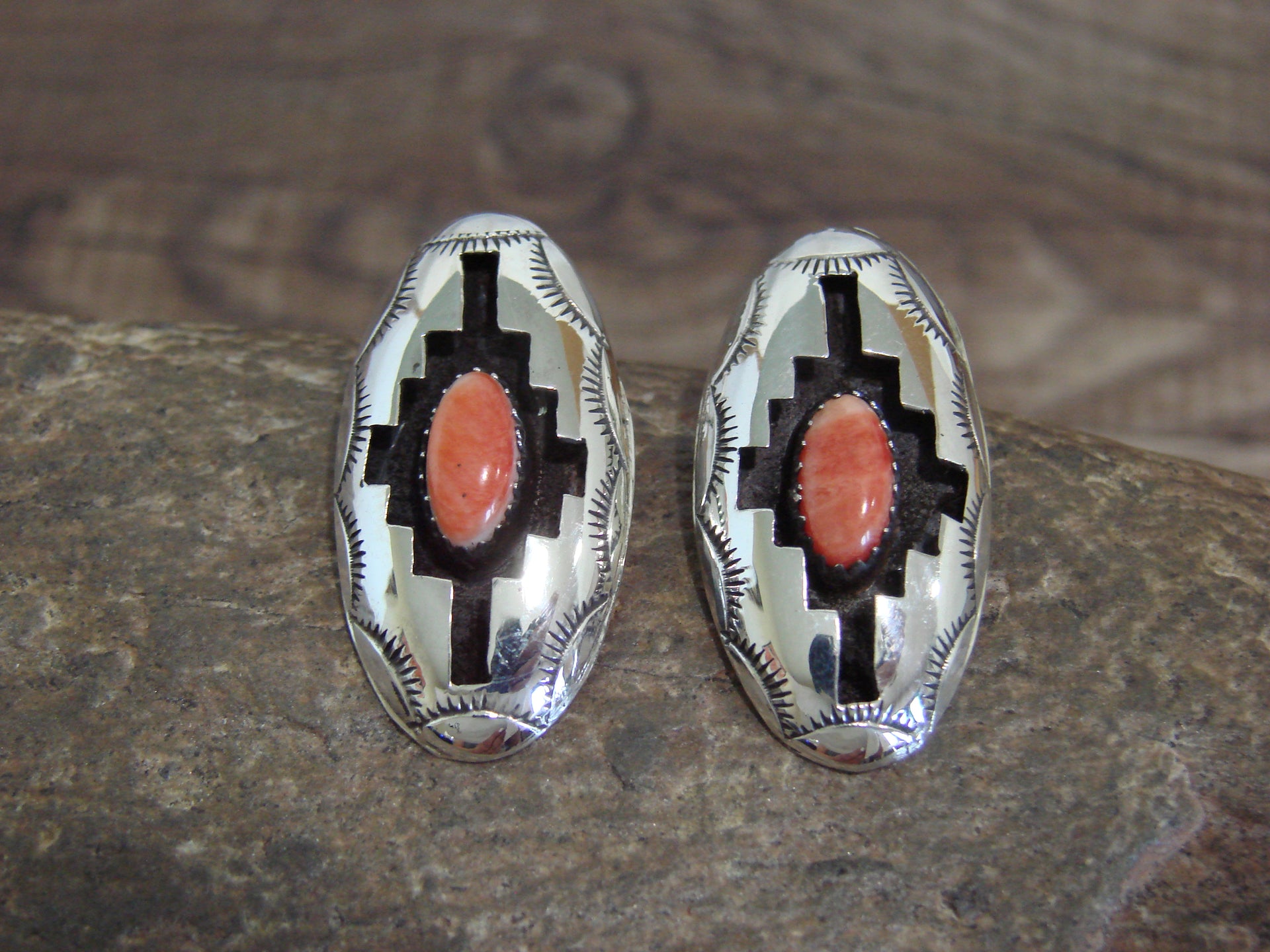 Genuine Native American Navajo Indian Sterling Silver & Spiny Oyster Shadow Box Post Earrings from Western New Mexico. These Beautiful Post earrings feature Spiny Oyster stones beautifully set into a sterling silver shadow box. The shadow box is hand polished. Navajo Indian hand made by Felix Perry. Free shipping and gift box included!