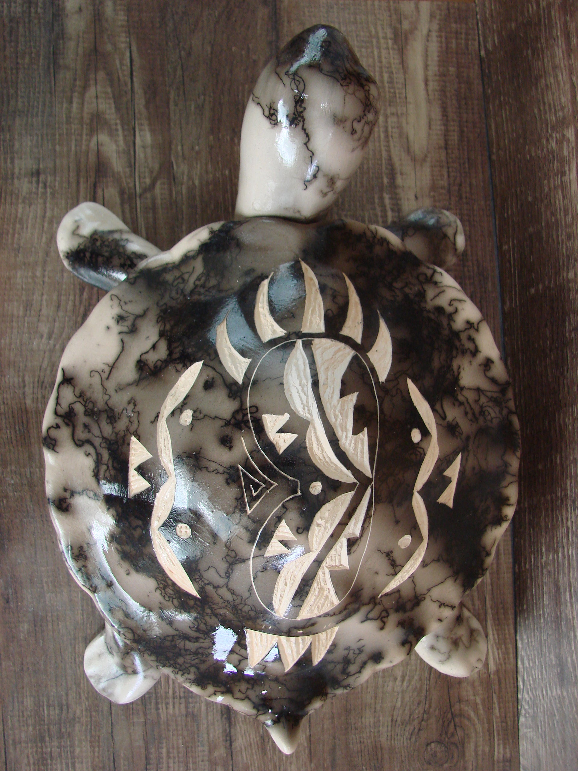 Native American Navajo Indian Horse Hair Turtle Sculpture from Western New Mexico. This Gorgeous piece of Pottery features beautiful horse hair and hand etching throughout. The Horse hair is laid over this piece during firing, the result is a beautiful one of a kind look! Hand etched by Navajo artist M. Vail. Signed. Free Shipping included!