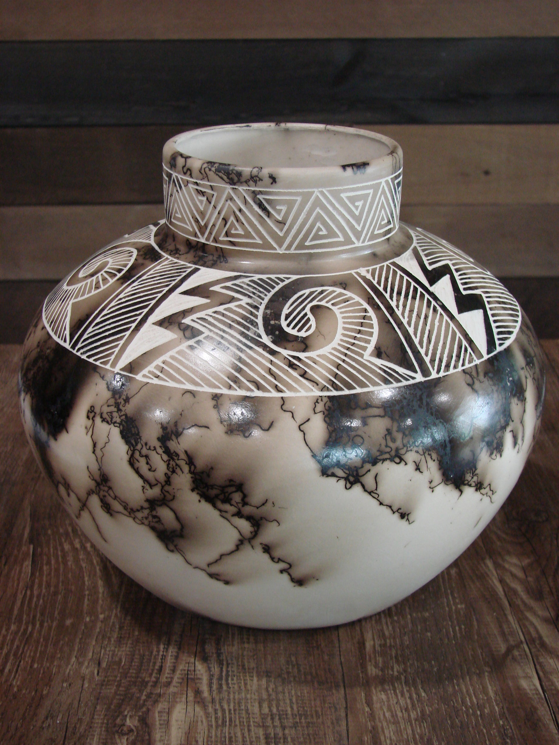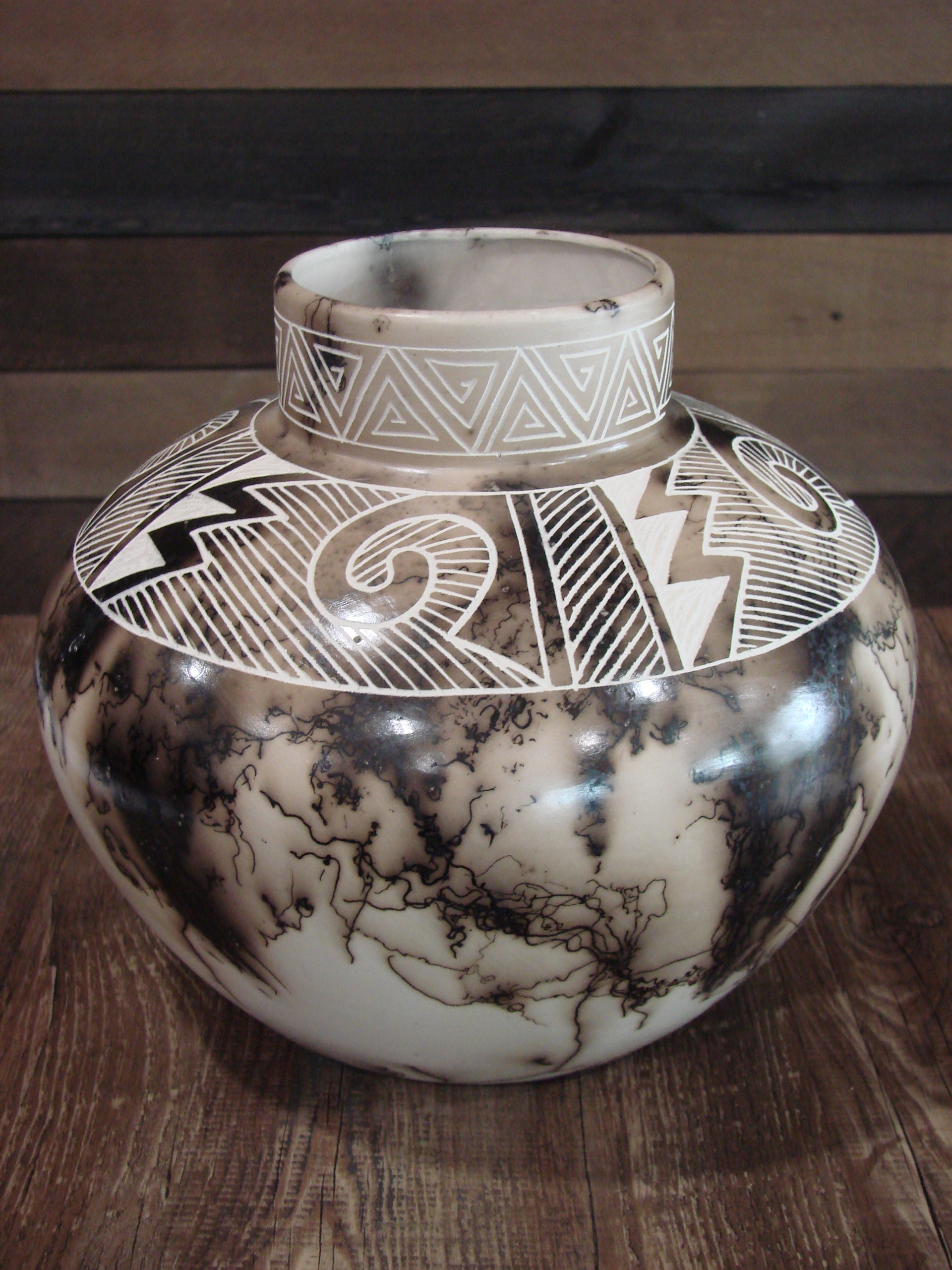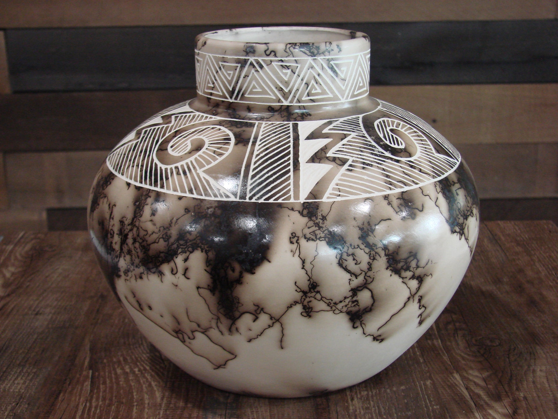 Genuine Native American Acoma Indian Horse Hair Buffalo Pottery from Western New Mexico. This Stunning Piece features beautiful horse hair and hand etching throughout. The Horse hair is laid over the Pottery during firing. The result is a unique one of a kind look! Hand etched by Acoma artist Gary Yellow Corn. Signed on the bottom. Free Shipping included!