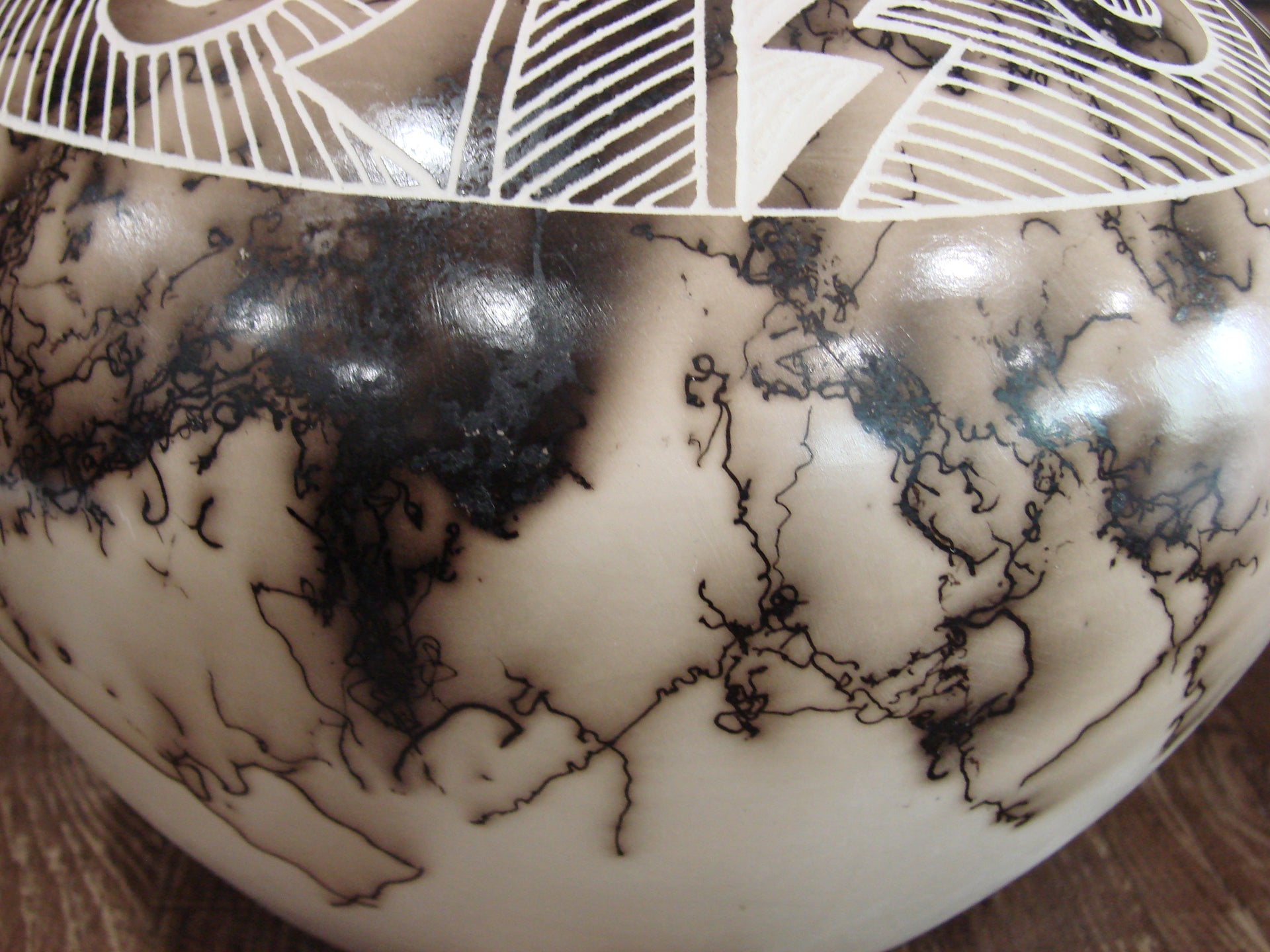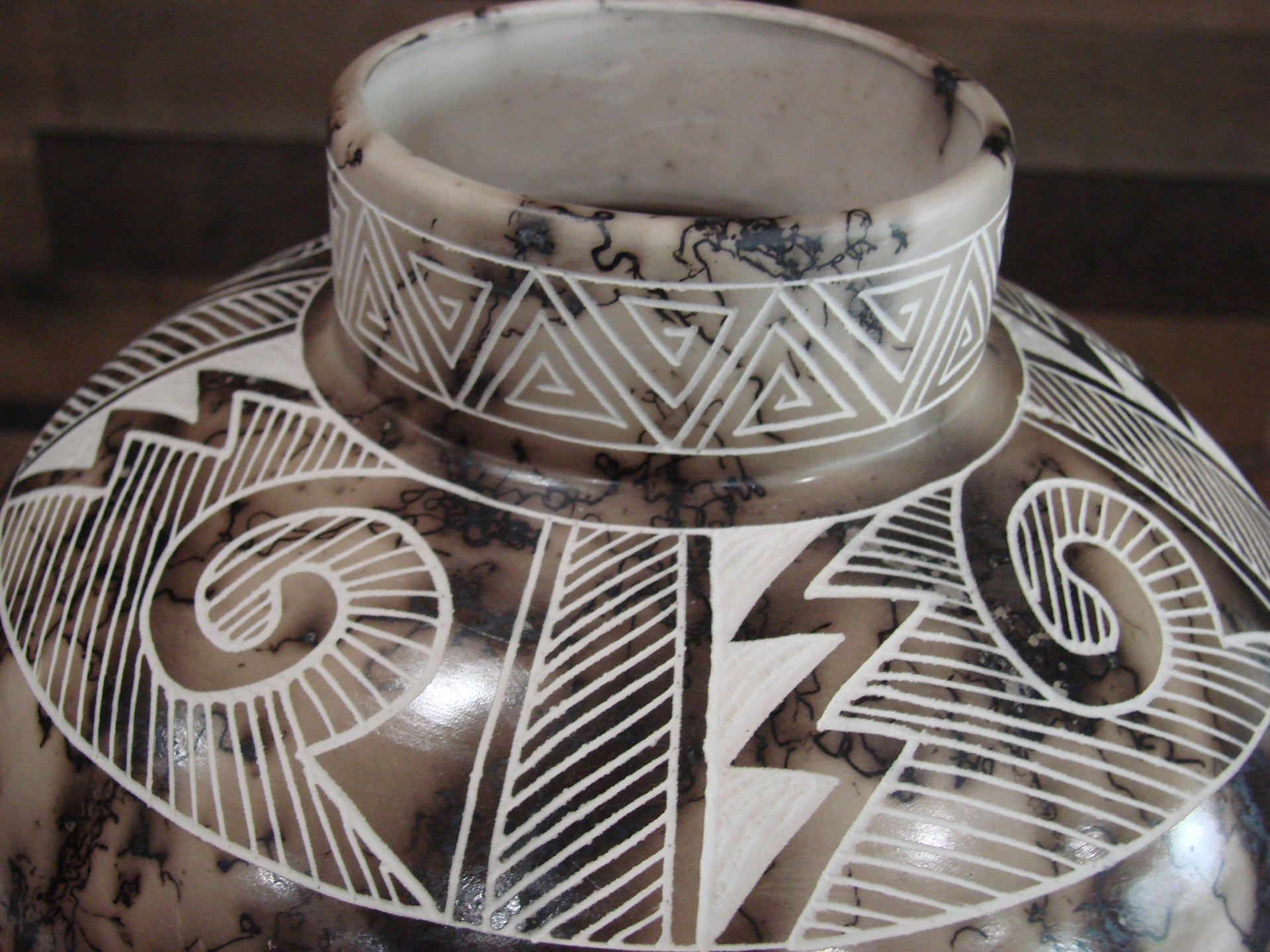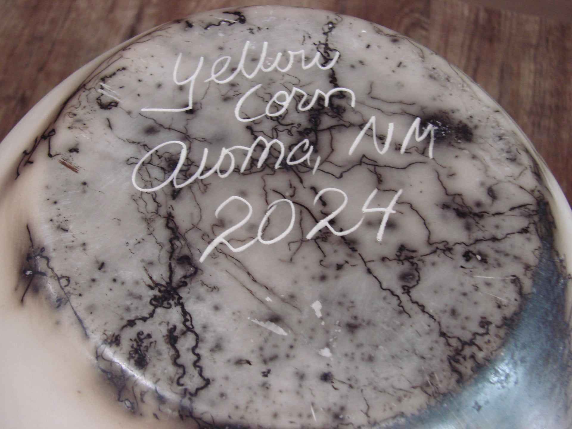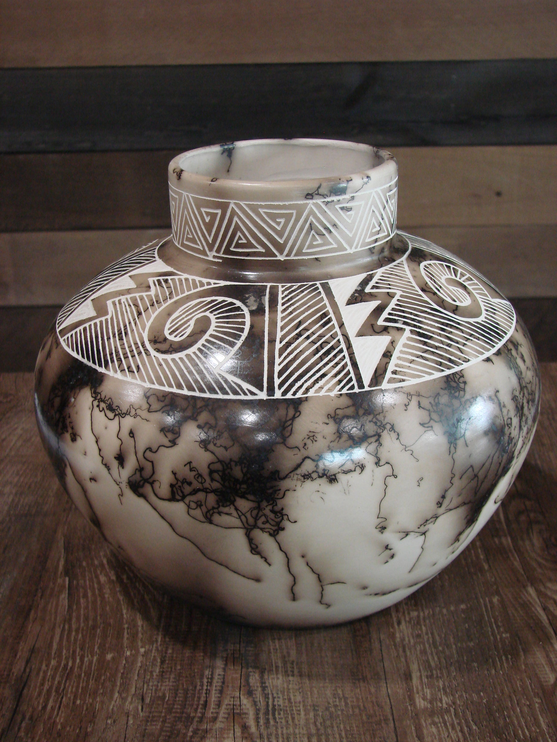 Genuine Native American Acoma Indian Horse Hair Buffalo Pottery from Western New Mexico. This Stunning Piece features beautiful horse hair and hand etching throughout. The Horse hair is laid over the Pottery during firing. The result is a unique one of a kind look! Hand etched by Acoma artist Gary Yellow Corn. Signed on the bottom. Free Shipping included!