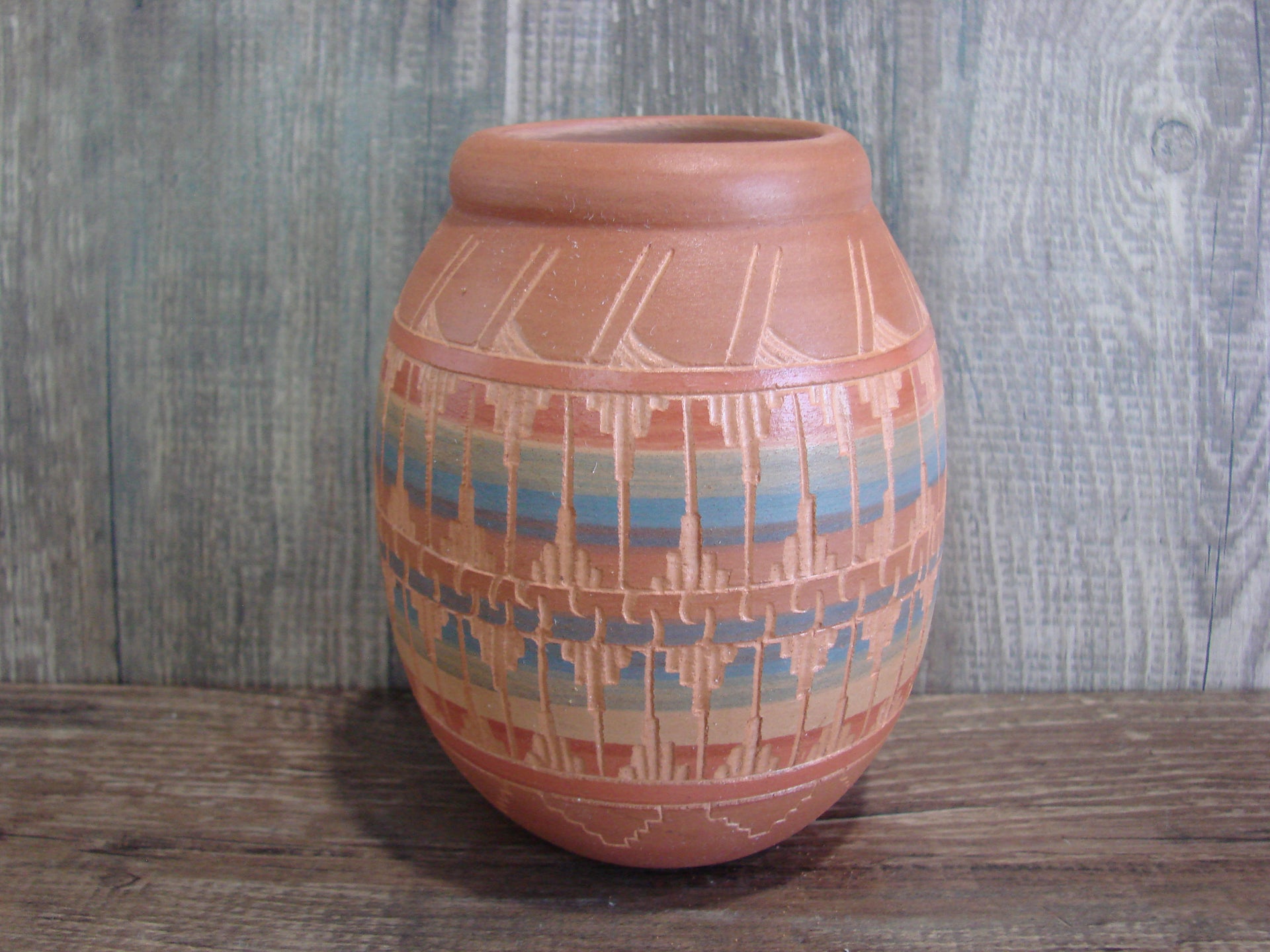 Genuine Native American Navajo Indian Hand Etched and Hand Painted Pottery from Western New Mexico. This beautiful piece of pottery features stunning Hand Painted and traditional Hand Etched Navajo patterns throughout. Hand etched and painted by E. Gilmore. Signed "EG" on the bottom. Free shipping included!