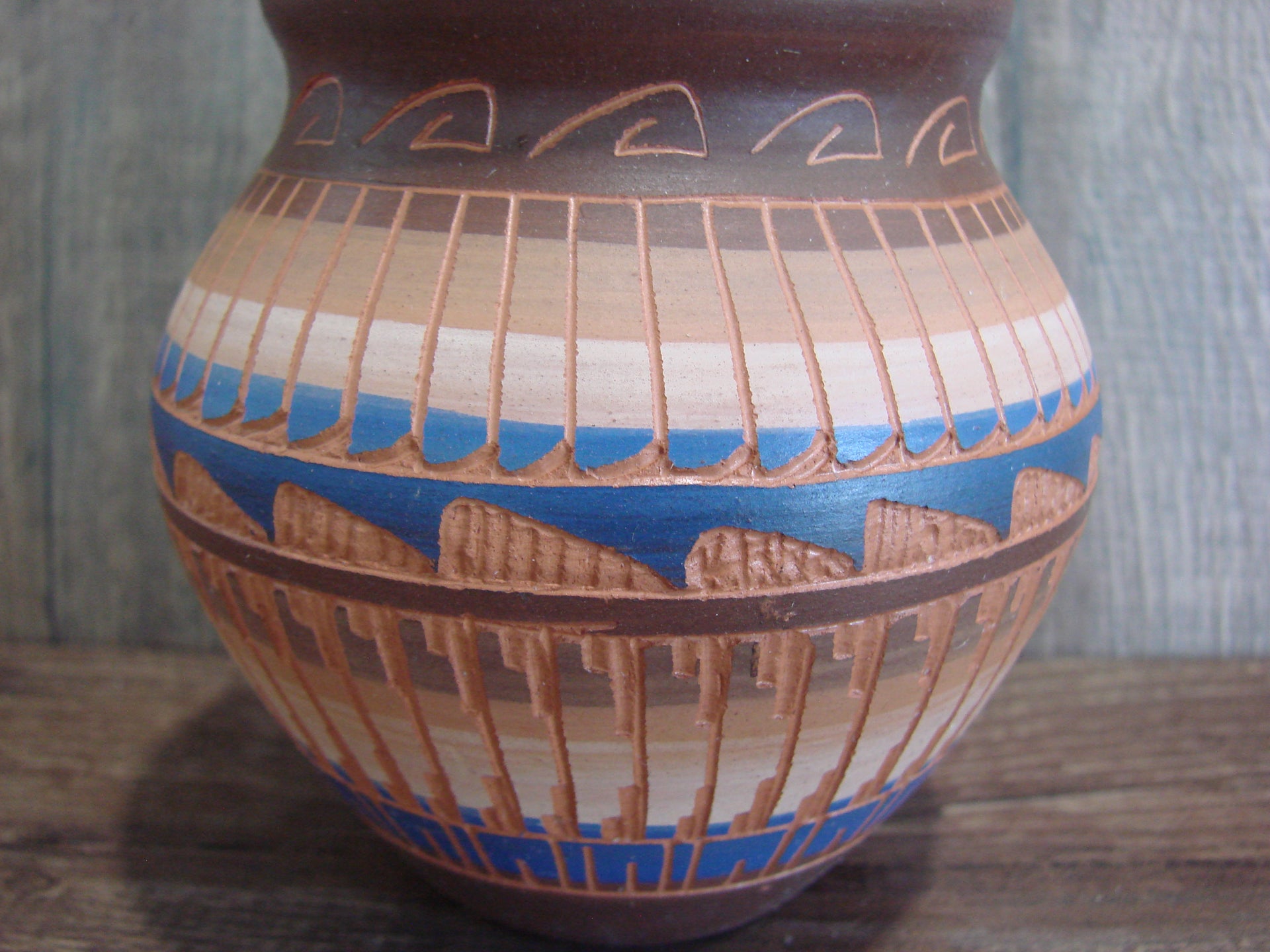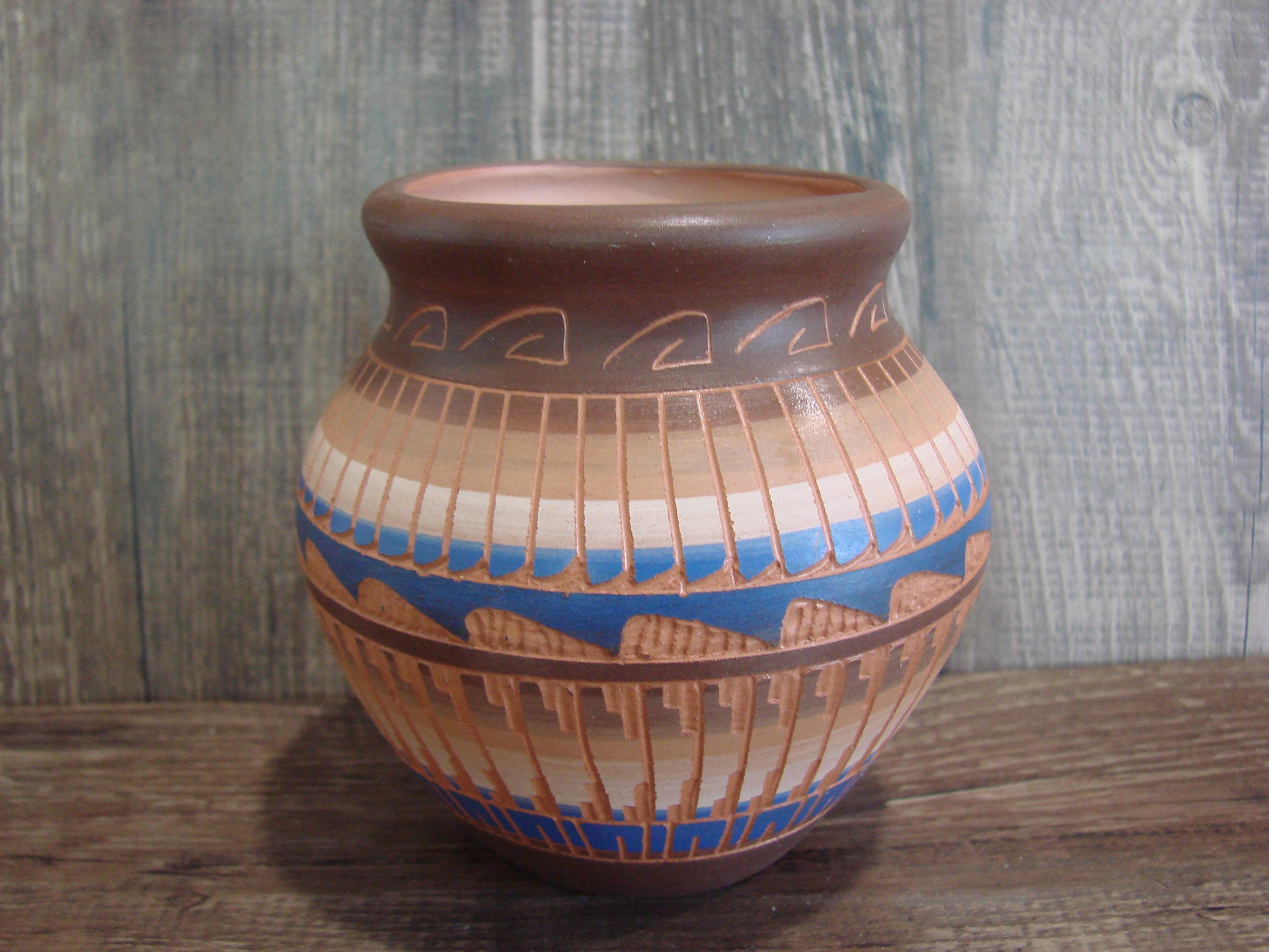 Genuine Native American Navajo Indian Hand Etched and Hand Painted Pottery from Western New Mexico. This beautiful piece of pottery features stunning Hand Painted and traditional Hand Etched Navajo patterns throughout. Hand etched and painted by E. Gilmore. Signed "EG" on the bottom. Free shipping included!