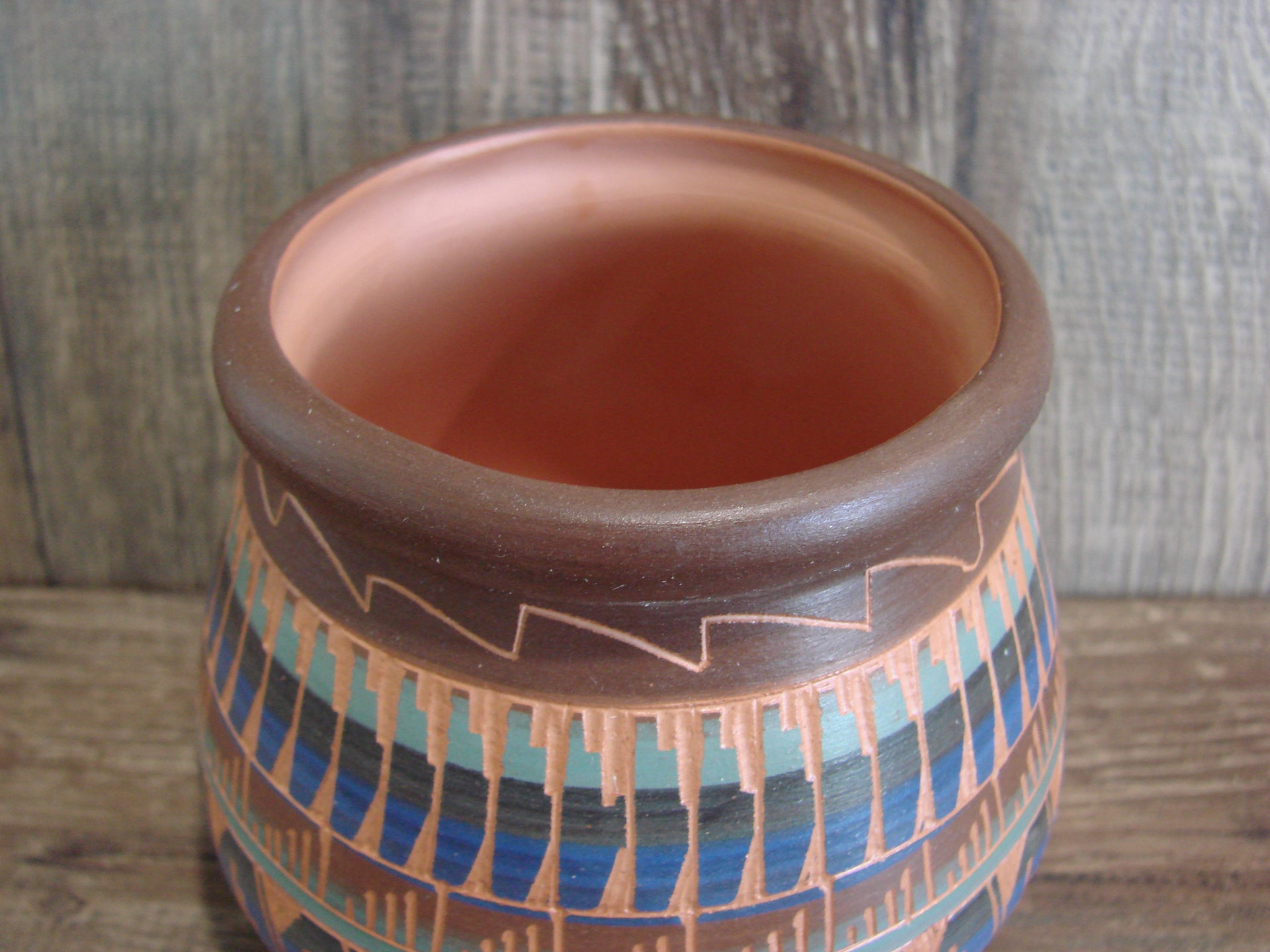 Genuine Native American Navajo Indian Hand Etched and Hand Painted Pottery from Western New Mexico. This beautiful piece of pottery features stunning Hand Painted and traditional Hand Etched Navajo patterns throughout. Hand etched and painted by E. Gilmore. Signed "EG" on the bottom. Free shipping included!