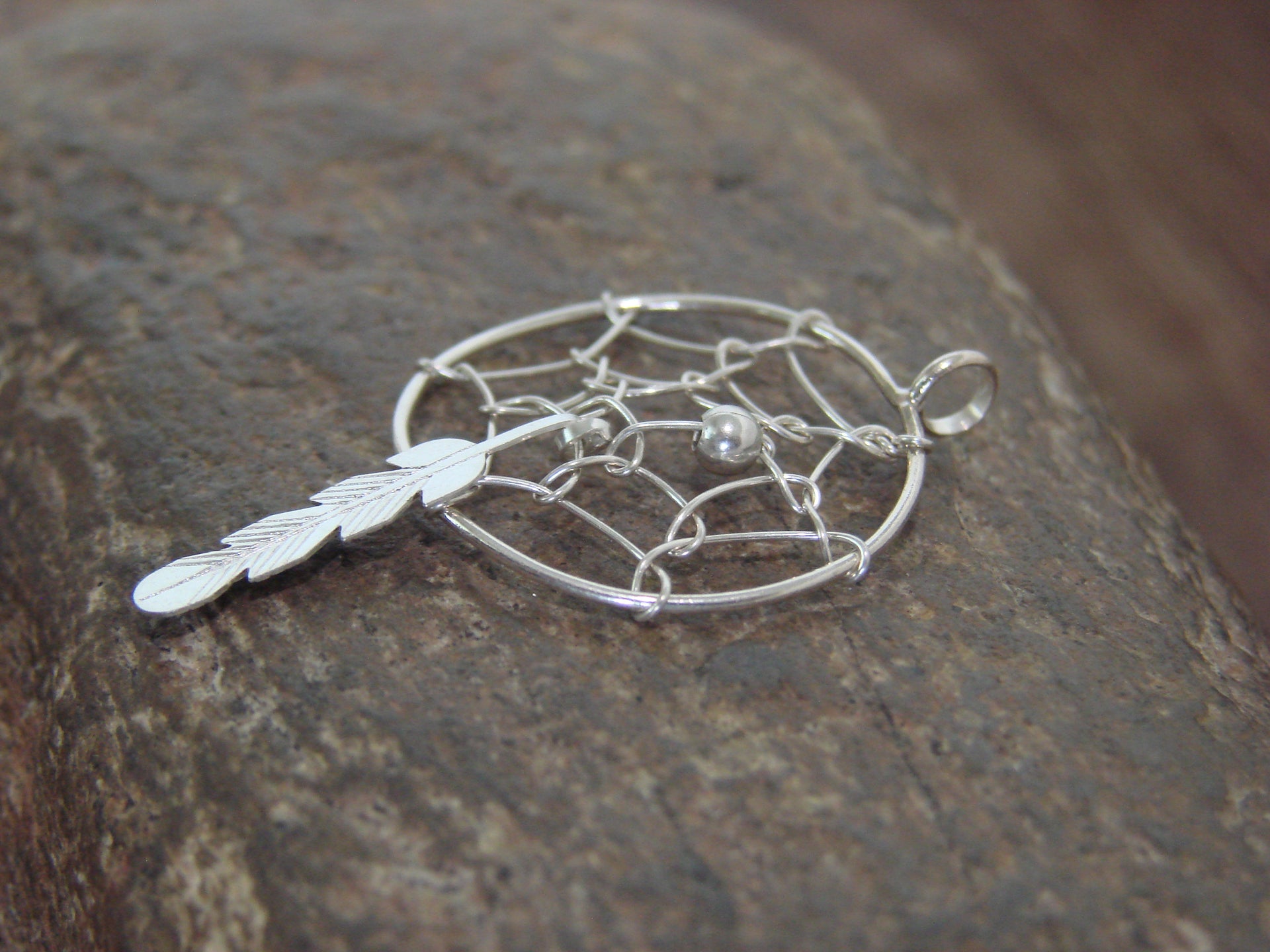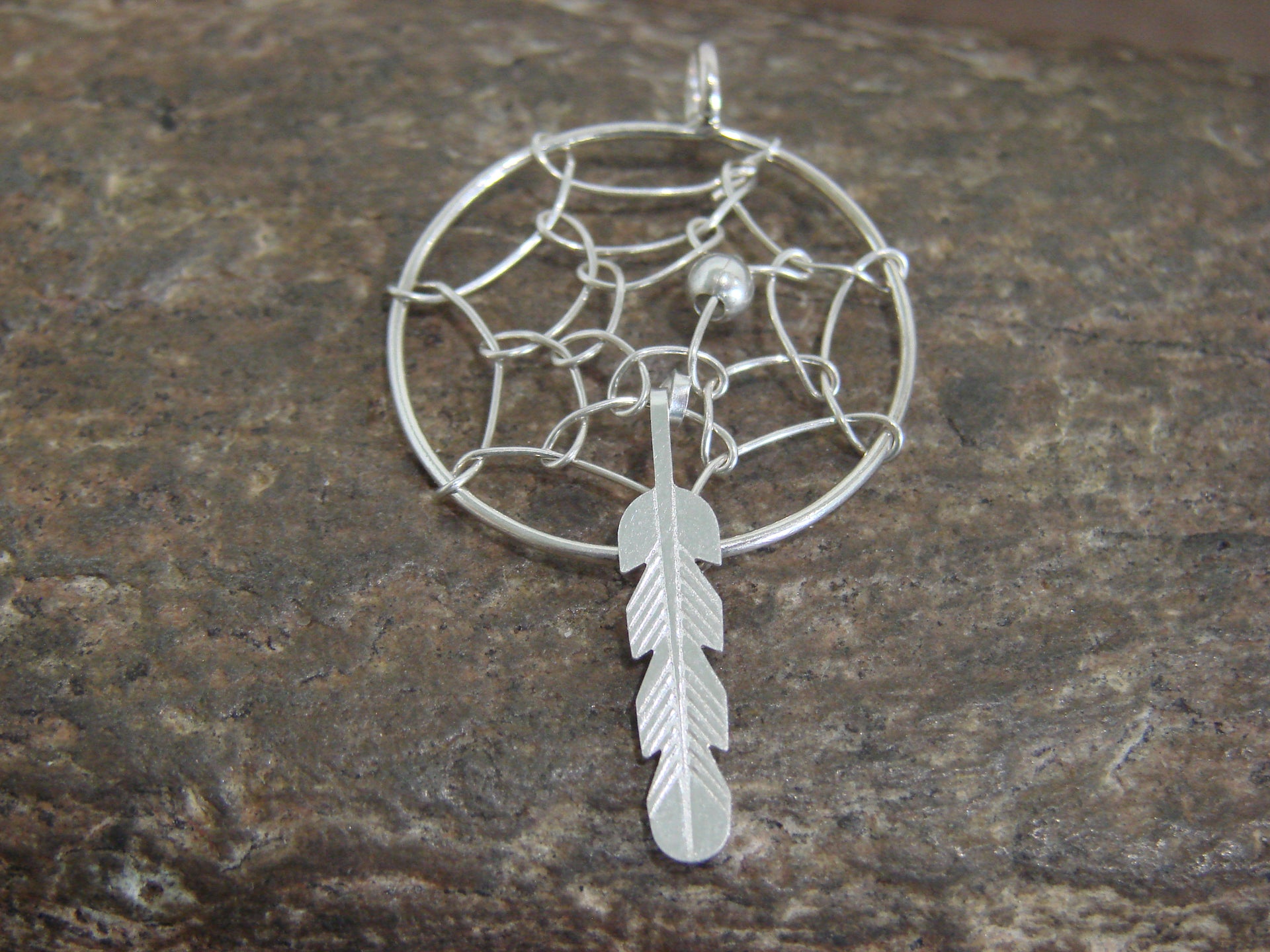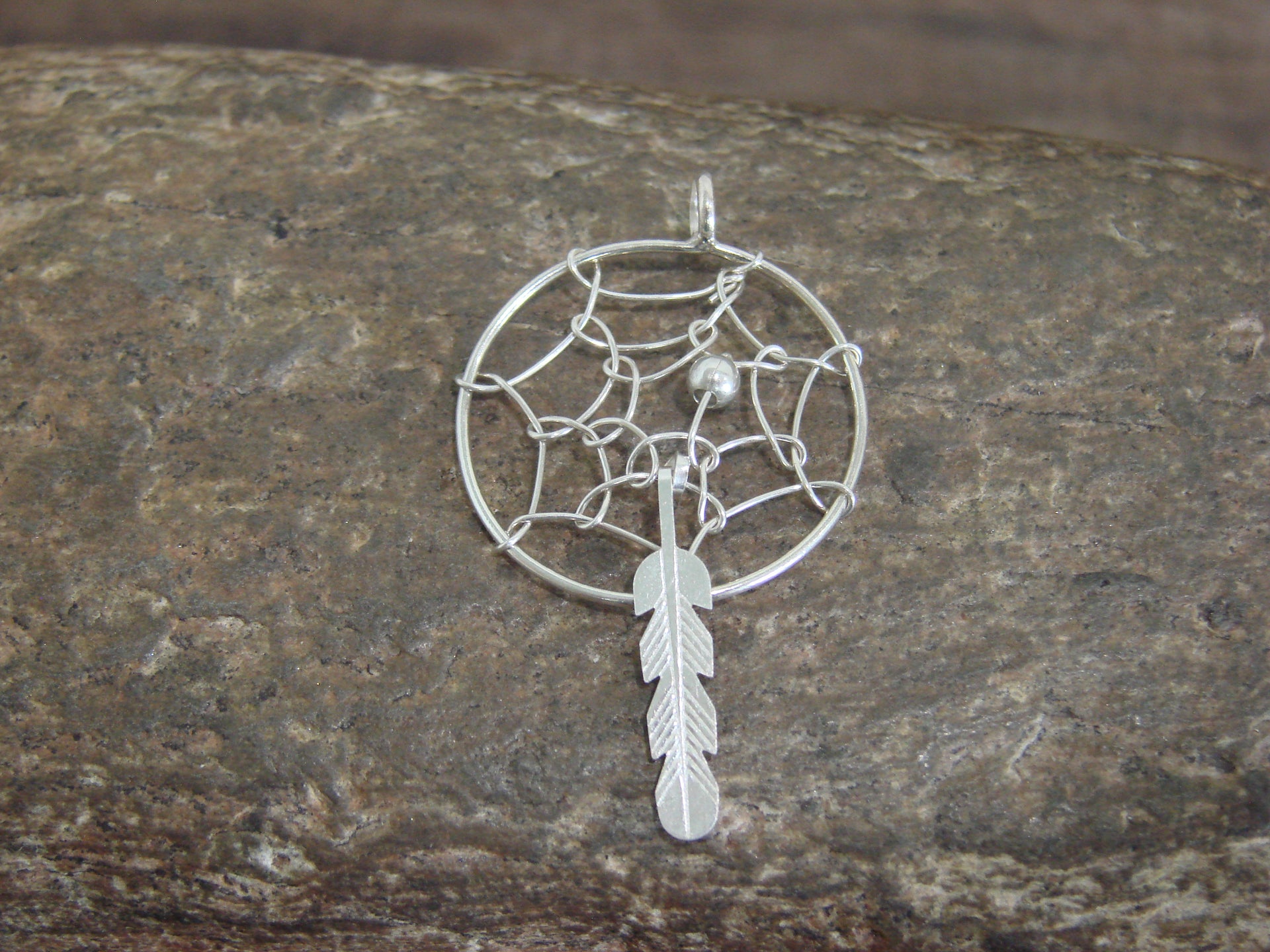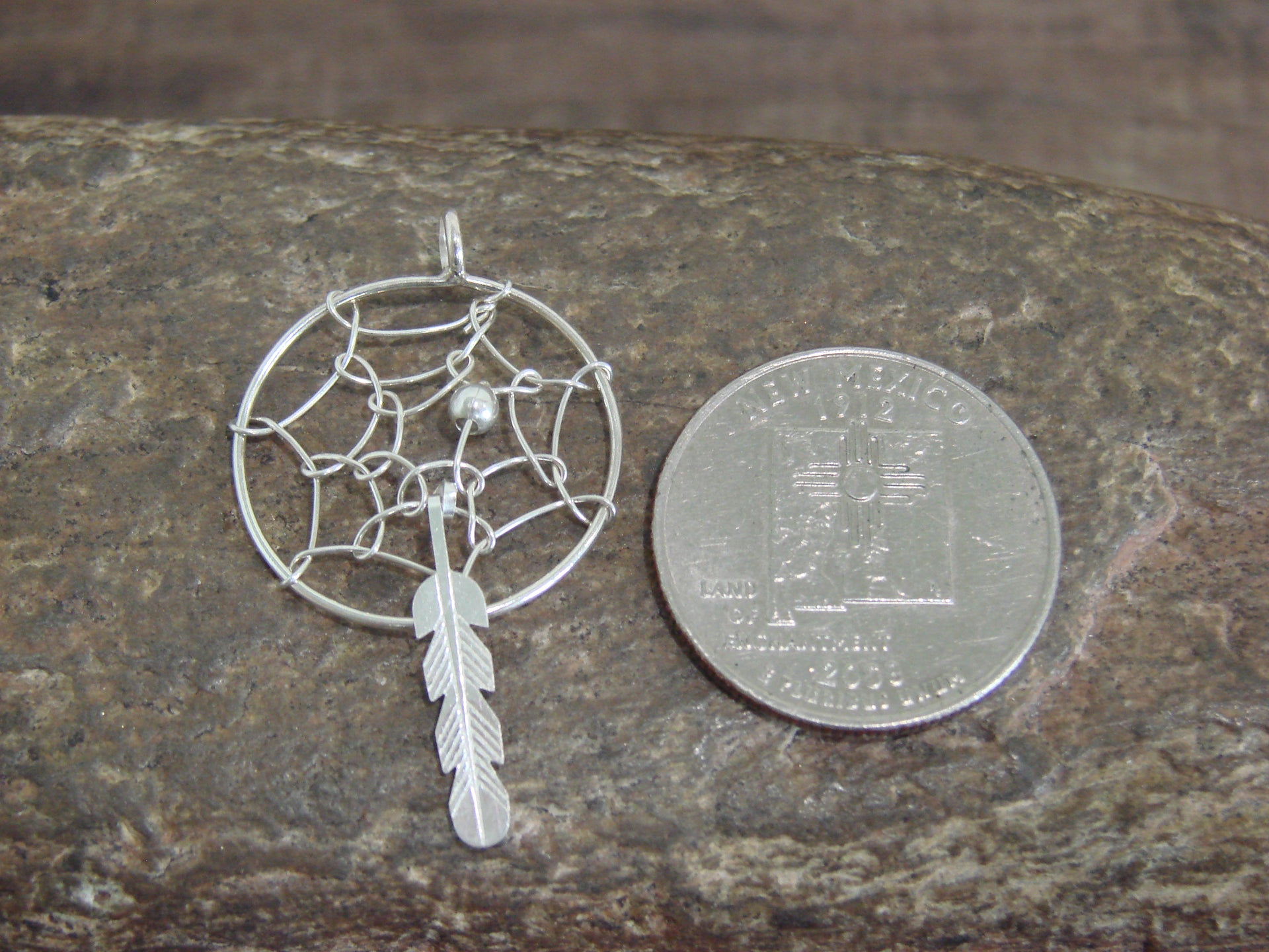 Genuine Native American Navajo Indian Sterling Silver Dream Catcher Pendant from Western New Mexico. This Beautiful pendant features Stunning details in Sterling Silver. A Sterling Silver feather dangles below the dreamcatcher. The pendant is cut and polished to a Stunning finish! Navajo Indian hand made by Lorenzo Arviso. Free Shipping with a gift box included!