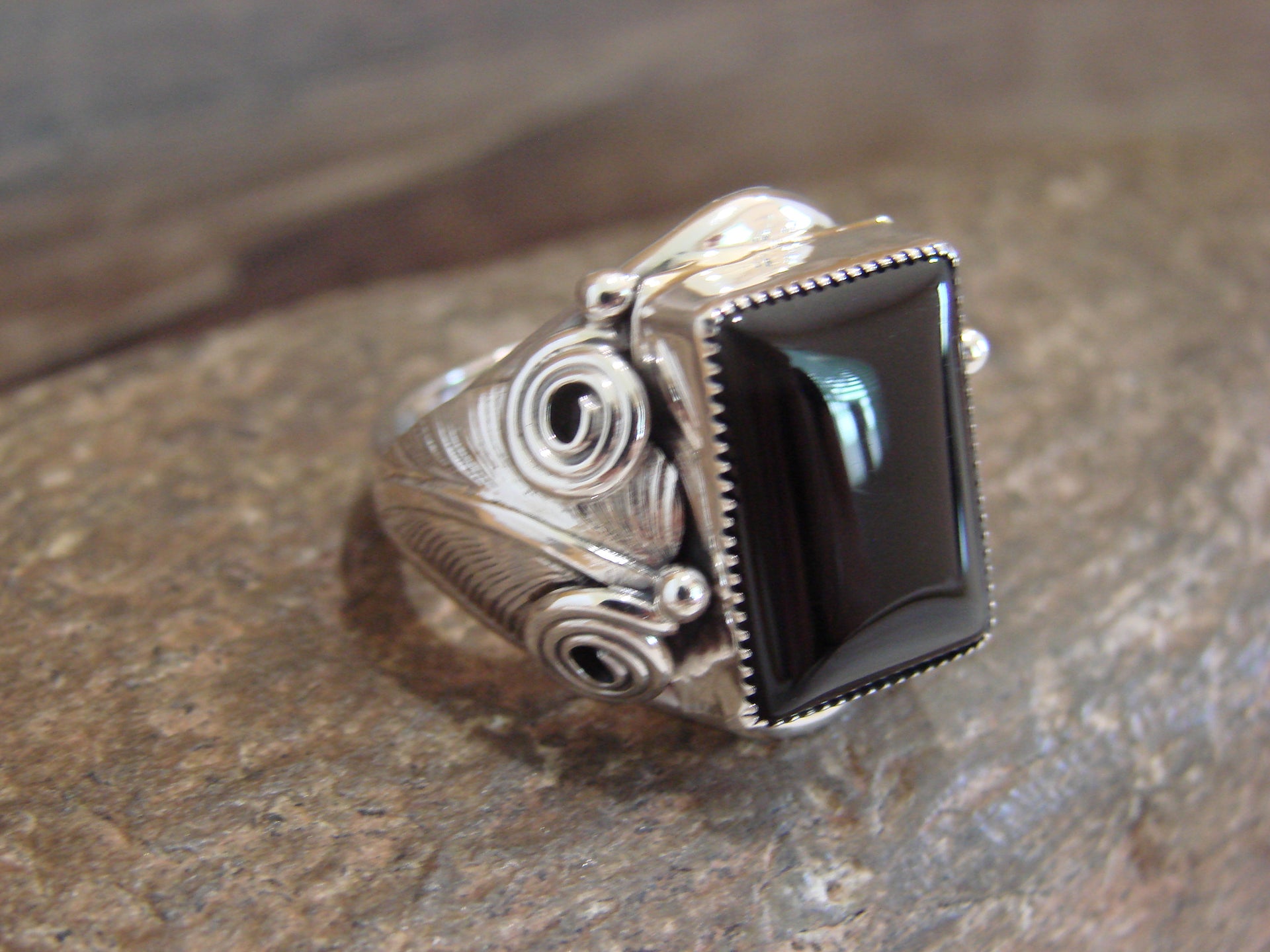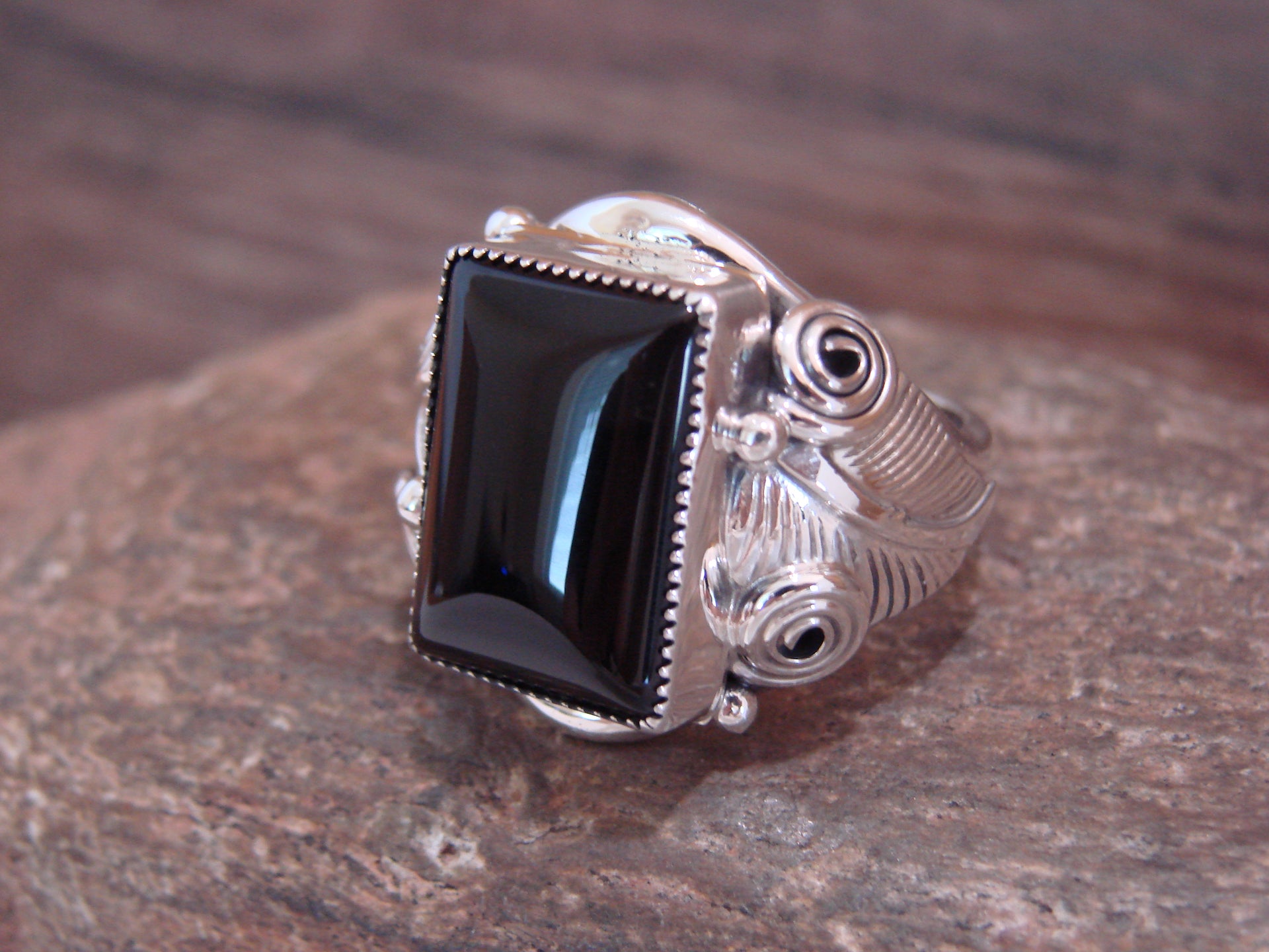 Genuine Native American Navajo Indian Sterling Silver Square Onyx Ring from Western New Mexico. This Stunning ring features a beautiful Onyx stone set into a crown sterling silver bezel setting. Beautiful Hand Stamping and Sterling Silver details surround the stone. Polished to a bright shine, this ring is Handmade to Perfection! Navajo Indian handmade by Darrell Morgan. Signed "DM" and stamped "Sterling" on the inner ring. Free shipping and gift box included!