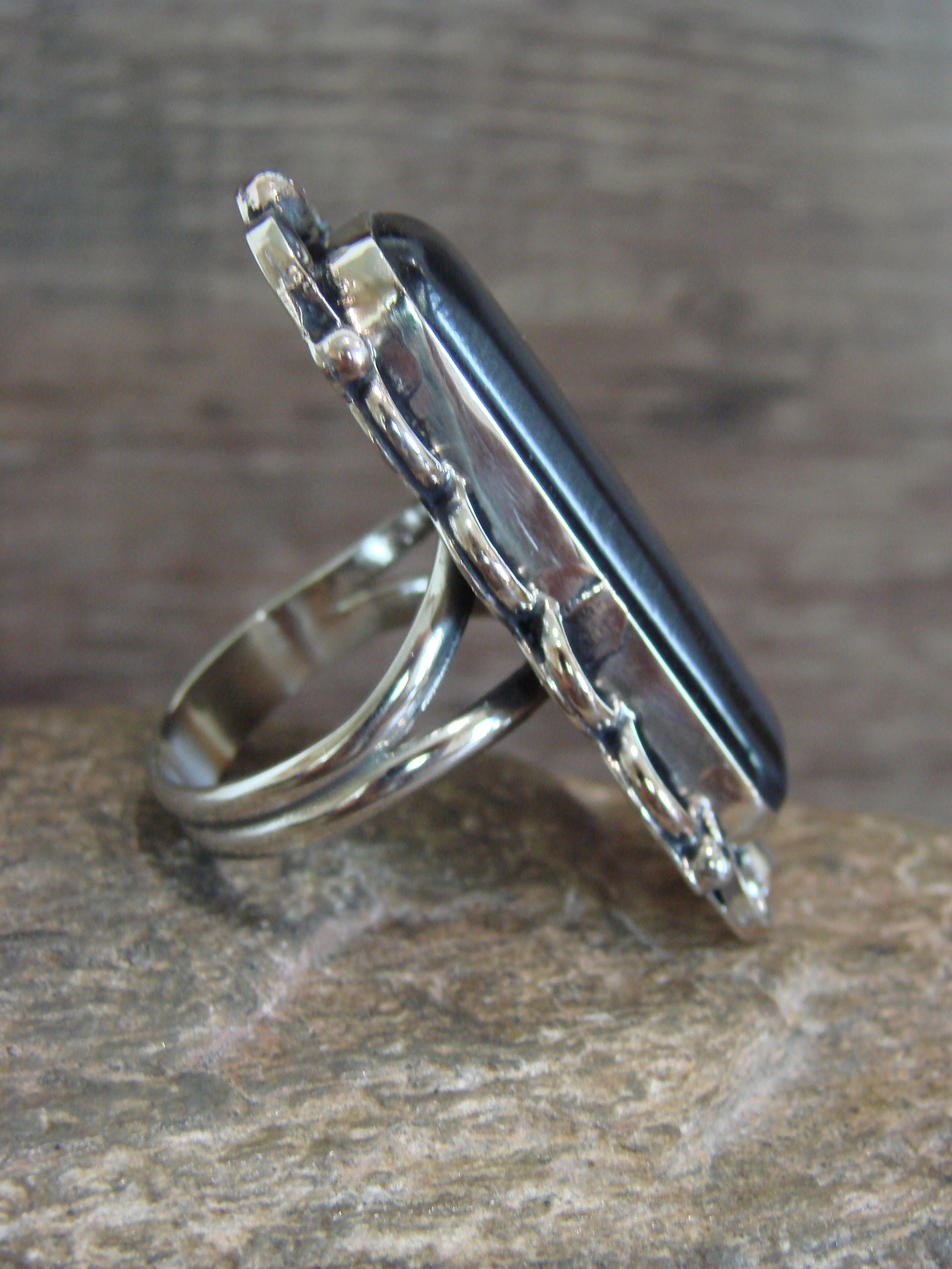 Native American Navajo Indian Nickel Silver & Onyx Ring from Western New Mexico. This ring features an Onyx stone set into a smooth Nickel Silver bezel setting. Beautiful Nickel Silver details Surround the Stone. This ring is made in Nickel Silver. This ring is Stunning! Navajo Indian handmade by Silversmith Jackie Cleveland. Signed "JC" on the back. Free Shipping and Gift Box included!
