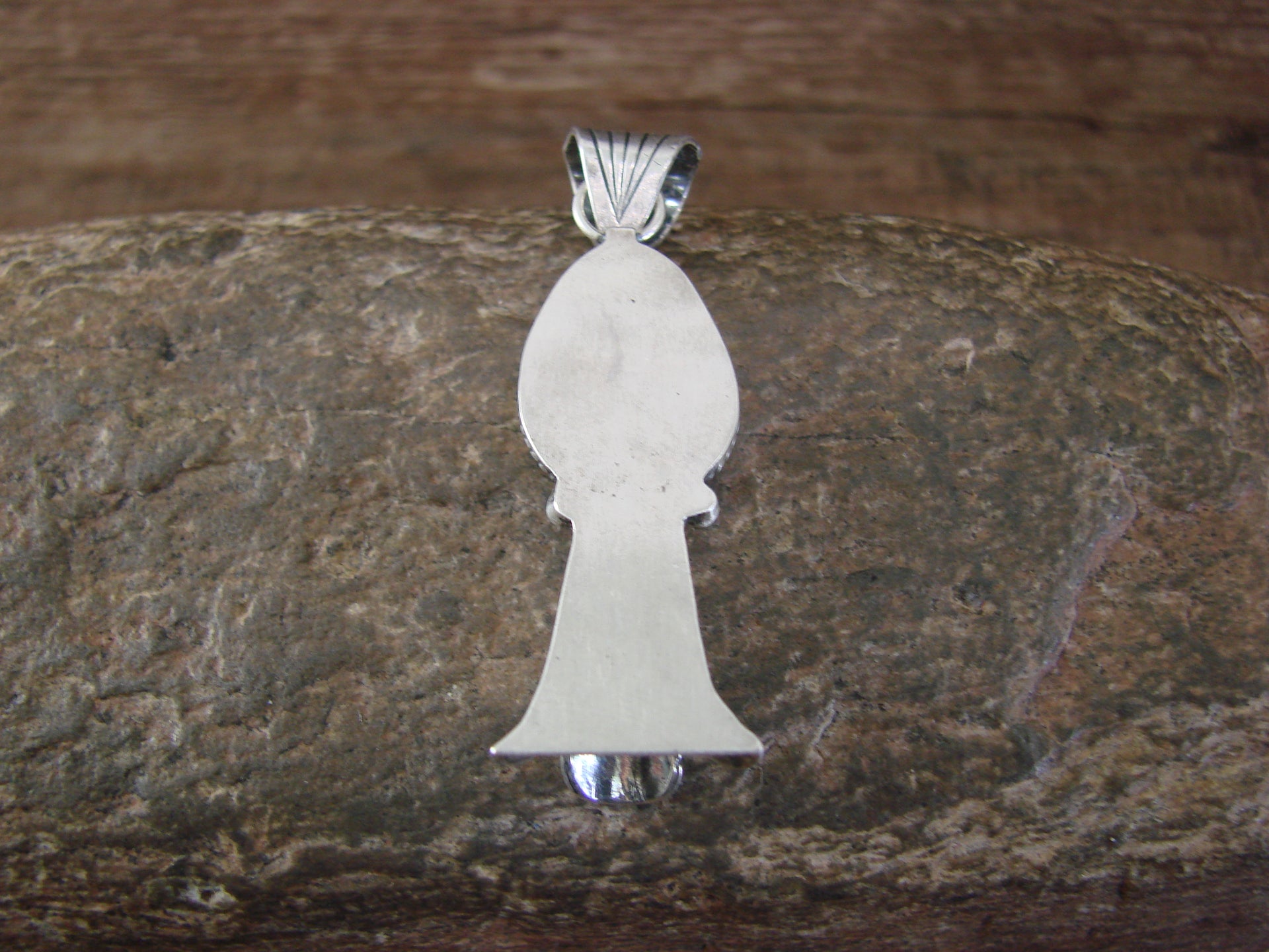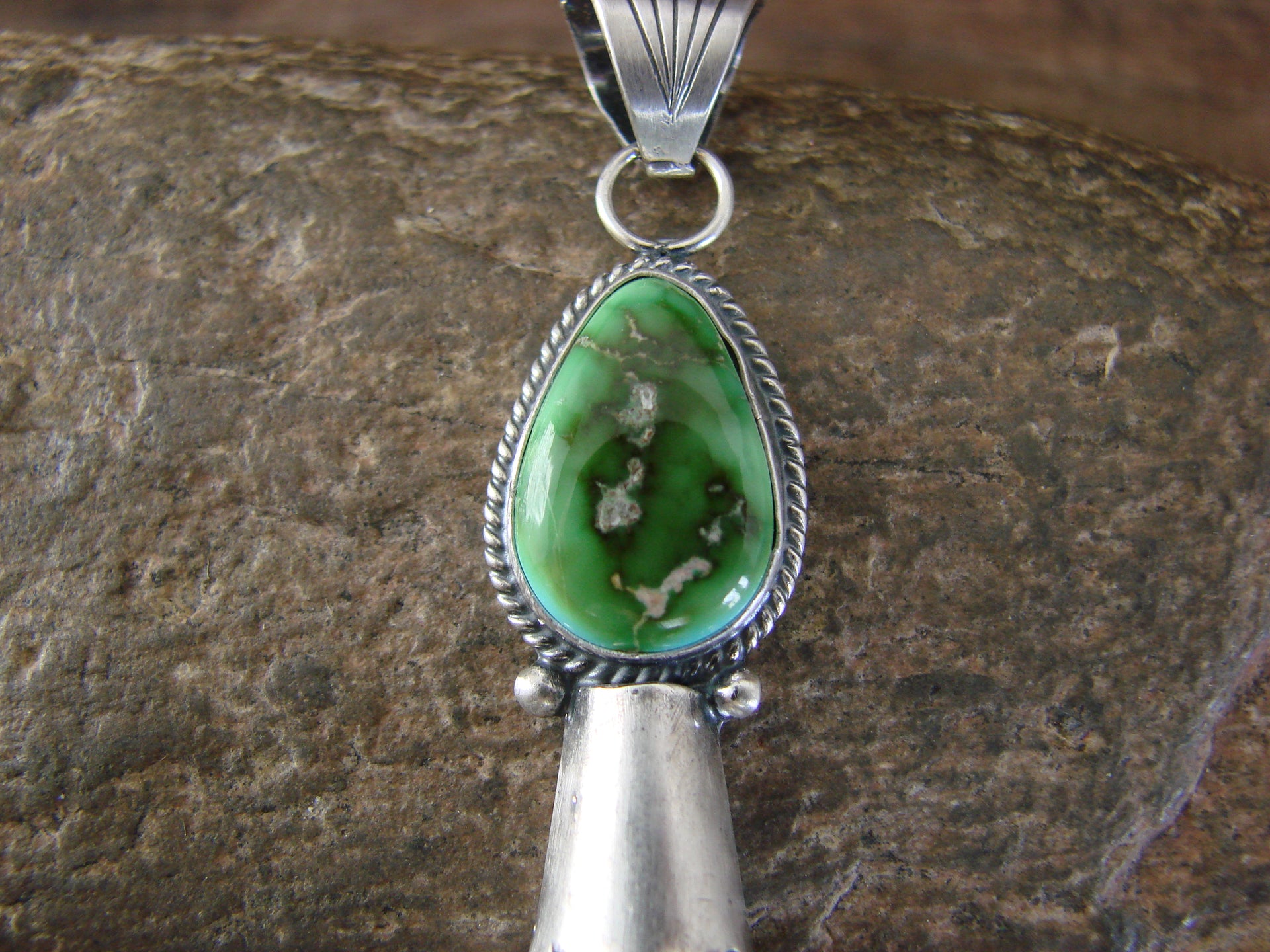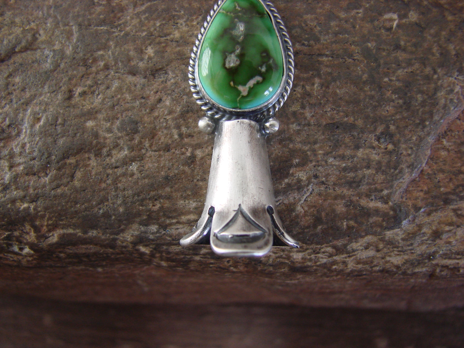 Genuine Native American Navajo Indian Sterling Silver & Turquoise Squash Blossom Pendant from Western New Mexico. This Gorgeous Pendant features a Genuine Turquoise stone Beautifully set into a Smooth Sterling Silver bezel setting. This pendant is Stunning! Hand made by Navajo Silversmith Verley Betone. Free Shipping with a gift box included!
