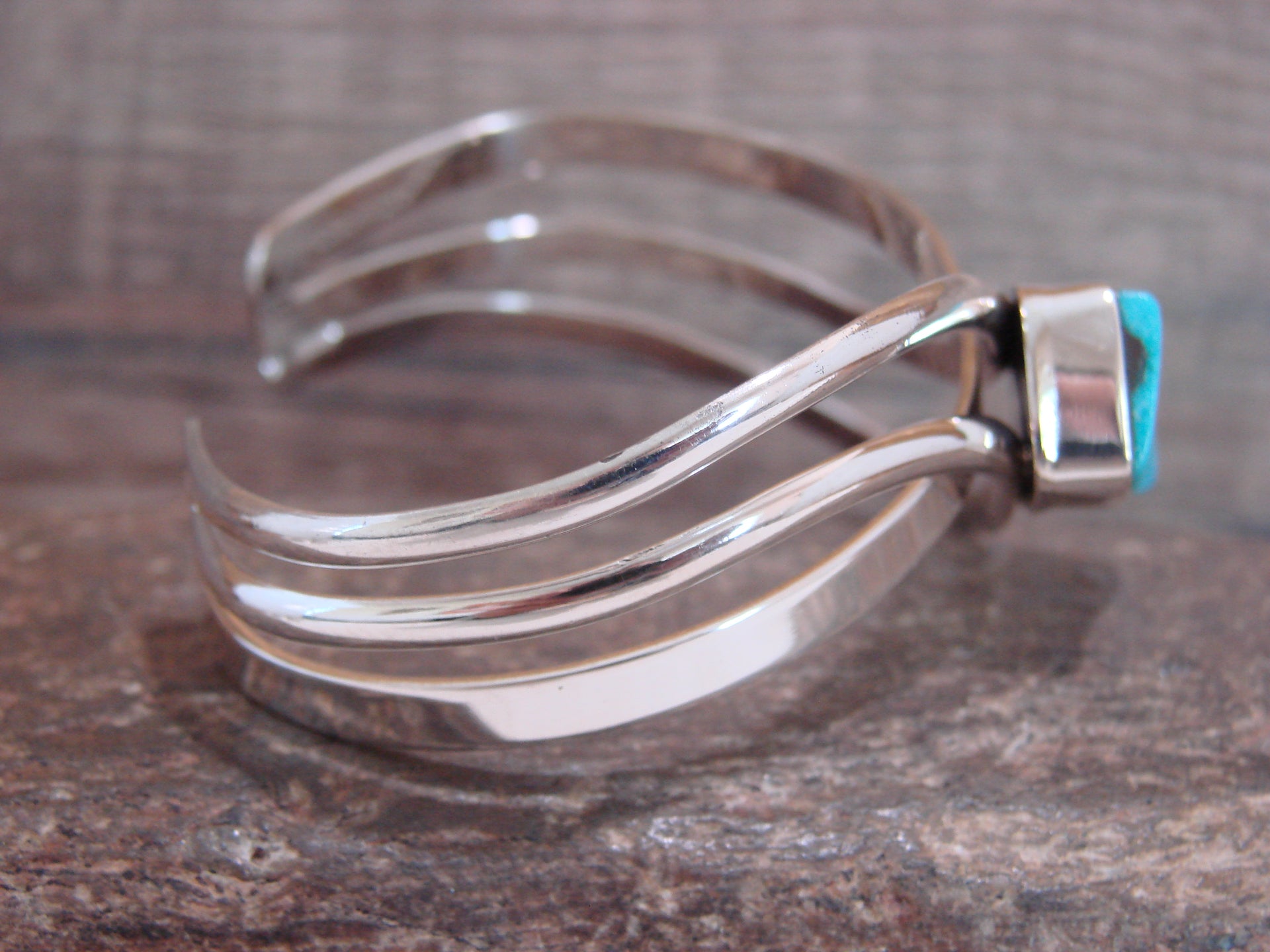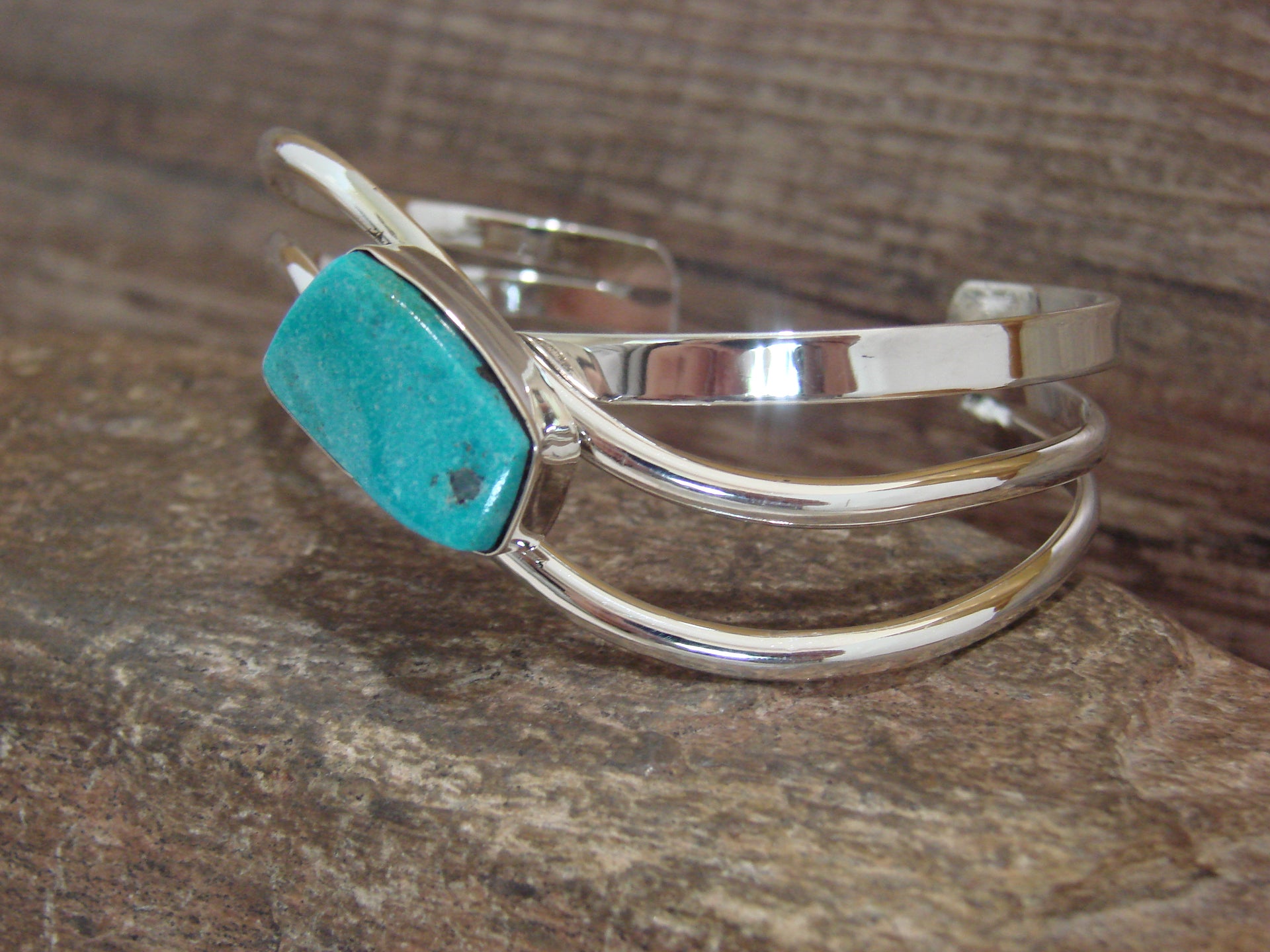Genuine Native American Navajo Indian Sterling Silver & Turquoise Bracelet from Western New Mexico. This Stunning bracelet features a Genuine Turquoise stone intricately set into Smooth Sterling Silver bezel setting. Fine Navajo Silversmith workmanship quality makes this bracelet a beautiful hand made masterpiece! Navajo Indian handmade by Charlene Yazzie. Signed "C. Yazzie" and Stamped "Sterling" on the back. Free gift box and shipping included!