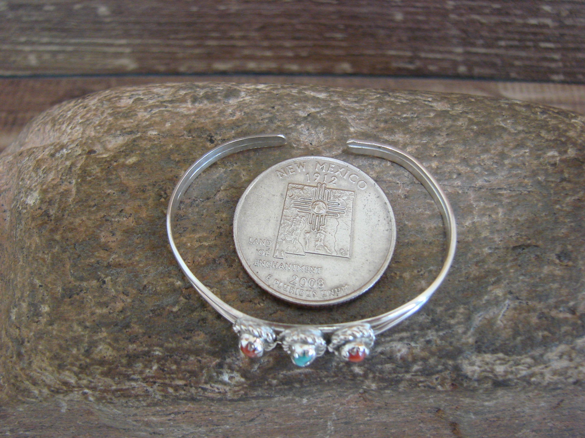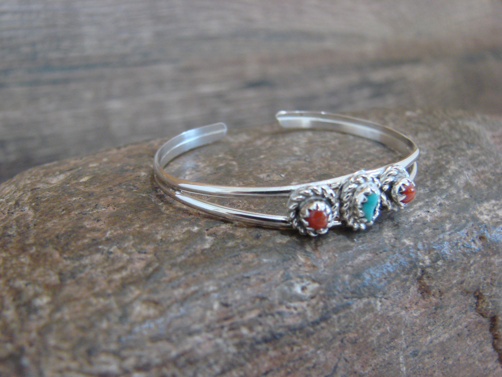 Genuine Native American Navajo Indian Sterling Silver Turquoise & Coral Baby/Child Bracelet from Western New Mexico. This bracelet features 3 Genuine stones at the focal point. The stones are polished and surrounded by beautiful sterling silver work. This is a very nice bracelet! Hand Made by Navajo Silversmith, Elton Cadman. Stamped "Sterling" on the back. Free shipping and gift box included!