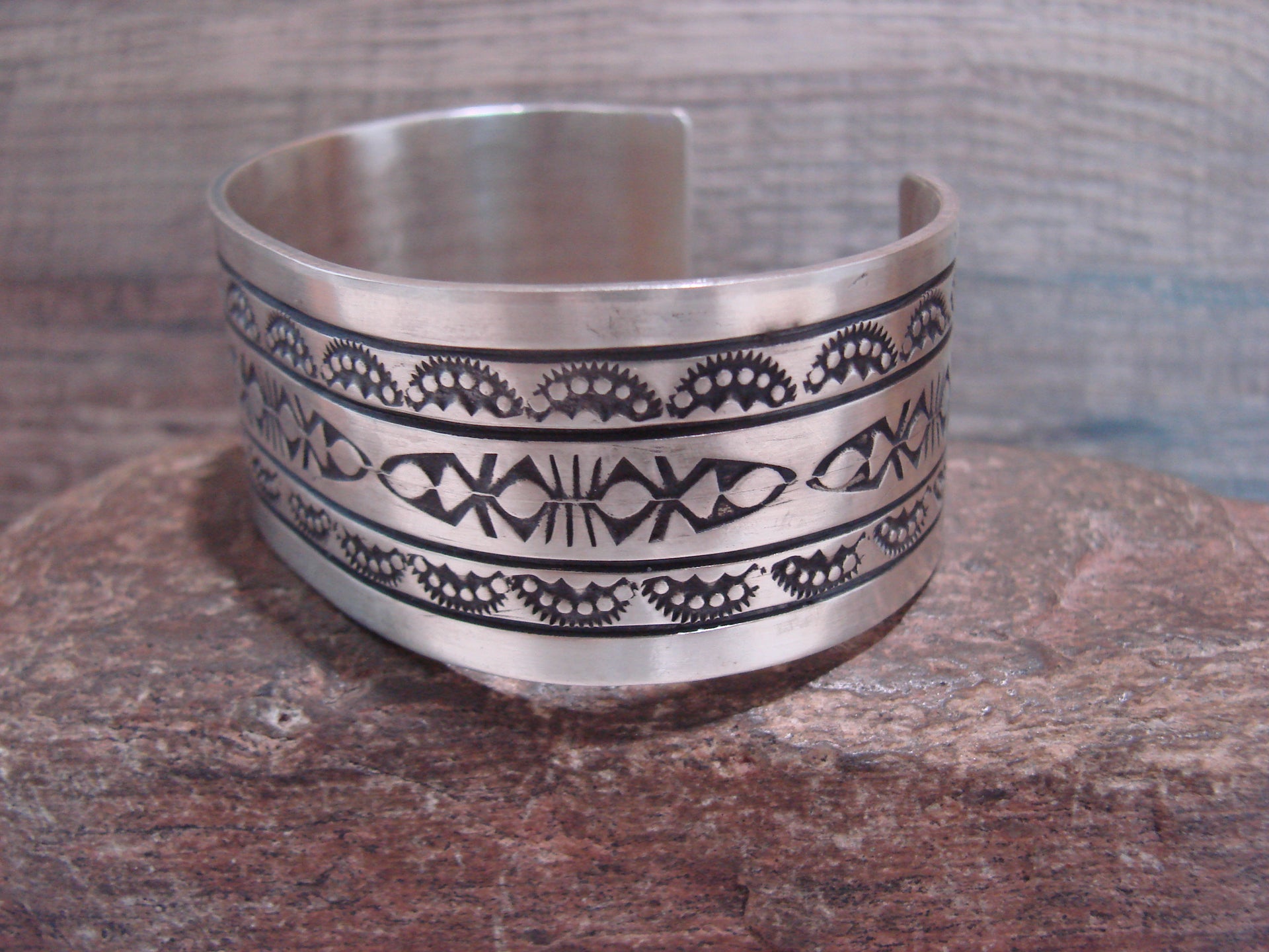 Native American Navajo Indian Hand Stamped Sterling Silver Cuff Bracelet from Western New Mexico. This large Sterling Silver bracelet features beautifully detailed hand stamping throughout. Handmade and Signed by Navajo Silversmith RE. Signed "RE" and stamped "Sterling" on the inner cuff. Free shipping with gift box included!