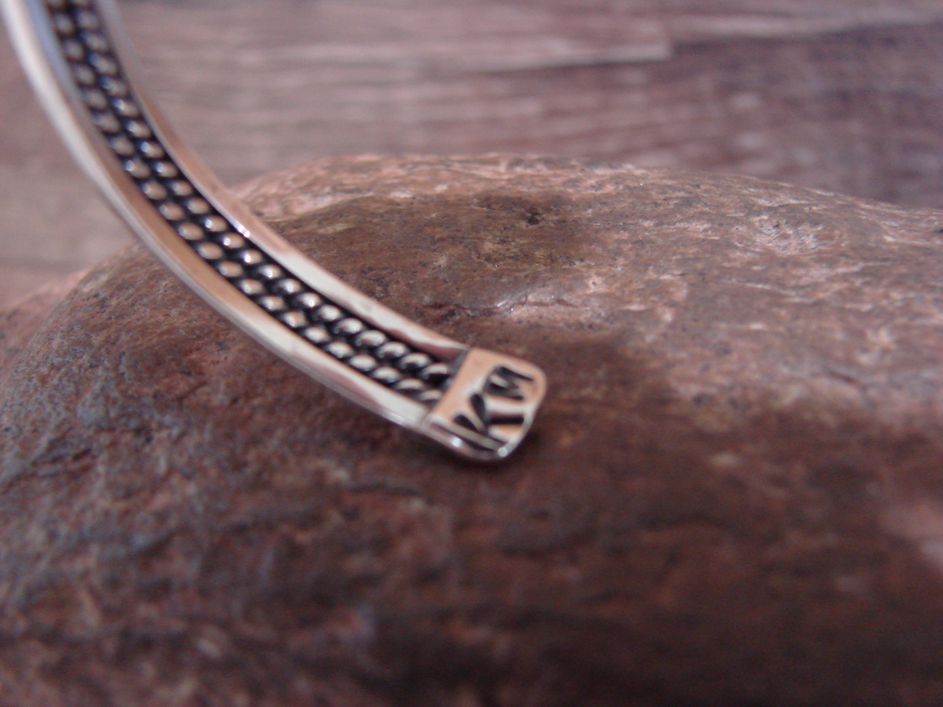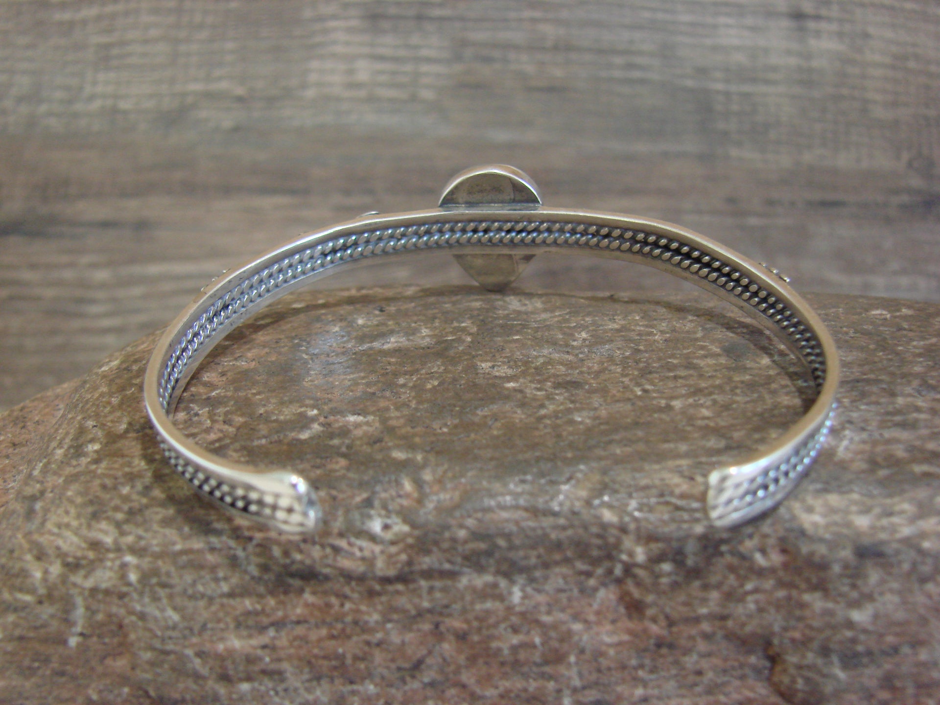 Genuine Native American Navajo Indian Sterling Silver & Turquoise Arrow Bracelet from Western New Mexico. This Stunning bracelet features a beautiful high quality, Genuine, Turquoise stone intricately set into a Smooth Sterling Silver bezel setting. Beautiful Hand Stamping and Sterling Silver Details surround the stones. Fine Navajo Silversmith workmanship quality makes this bracelet a beautiful hand made masterpiece! Navajo Indian handmade by Tina Benally. Signed & Stamped Sterling on the back. Free gift box and shipping included!