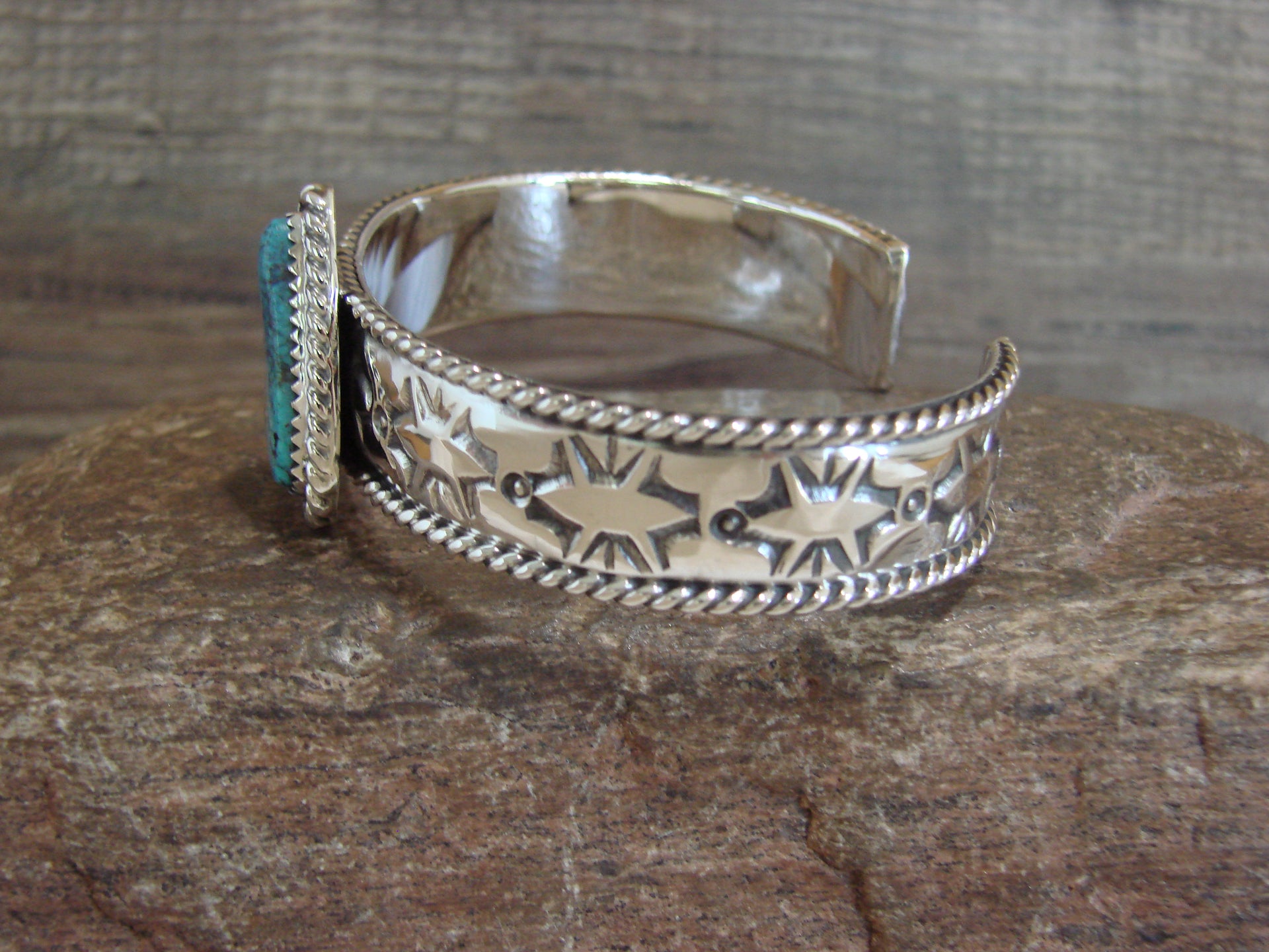 Genuine Native American Navajo Indian Sterling Silver & Turquoise Bracelet from Western New Mexico. This Stunning bracelet features a Genuine Turquoise Stone set into a crown sterling silver bezel setting. Hand Stamping and Beautiful details in Sterling Silver surround the Stone. Fine Navajo Silversmith workmanship quality makes this bracelet a beautiful hand made masterpiece! Navajo Indian handmade by Jason Bahe. Signed "Jason B." and Stamped "Sterling" on the back. Free gift box and free shipping included!