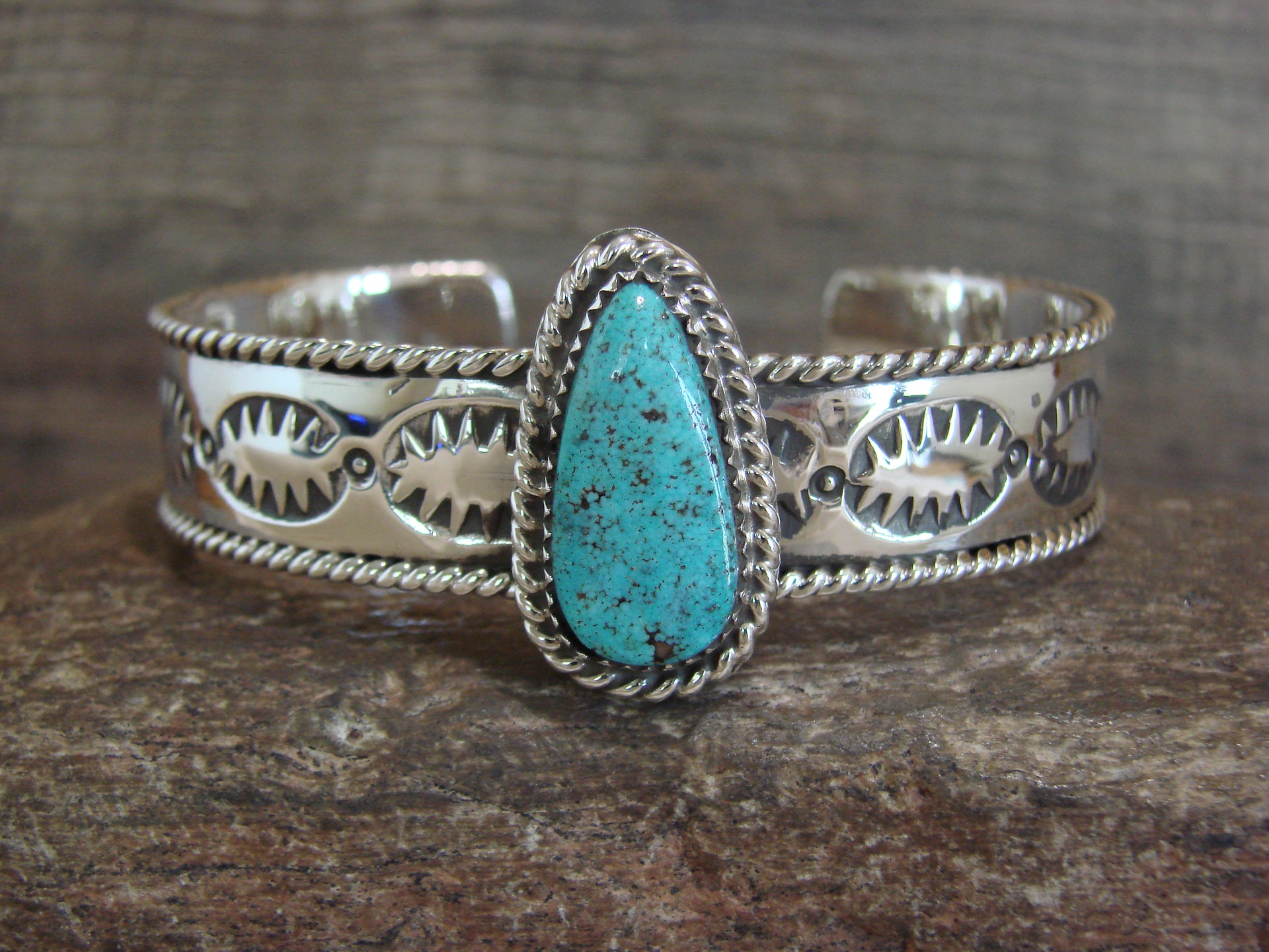 Genuine Native American Navajo Indian Sterling Silver & Turquoise Bracelet from Western New Mexico. This Stunning bracelet features a Genuine Turquoise Stone set into a crown sterling silver bezel setting. Hand Stamping and Beautiful details in Sterling Silver surround the Stone. Fine Navajo Silversmith workmanship quality makes this bracelet a beautiful hand made masterpiece! Navajo Indian handmade by Jason Bahe. Signed "Jason B." and Stamped "Sterling" on the back. Free gift box and free shipping included!