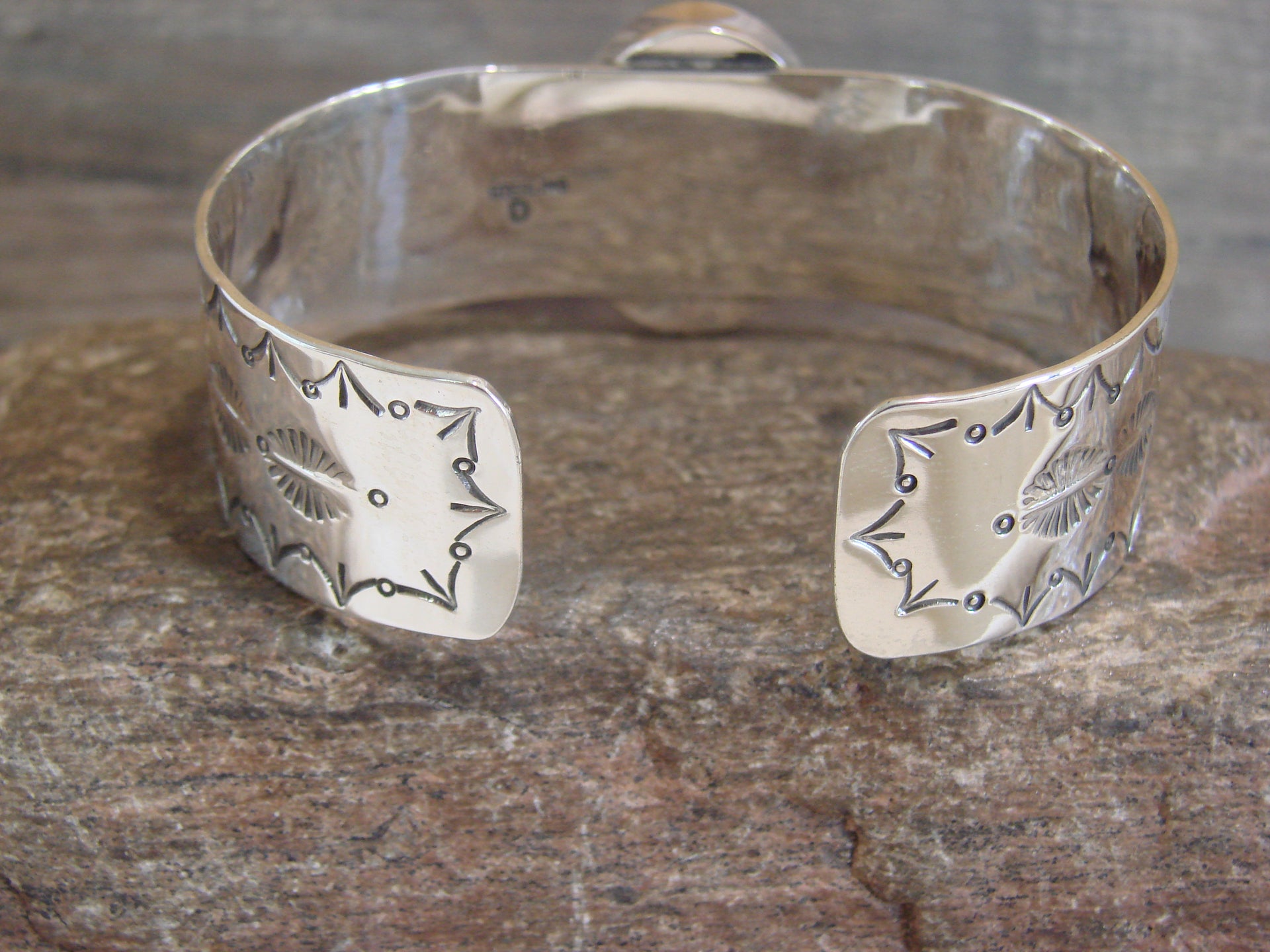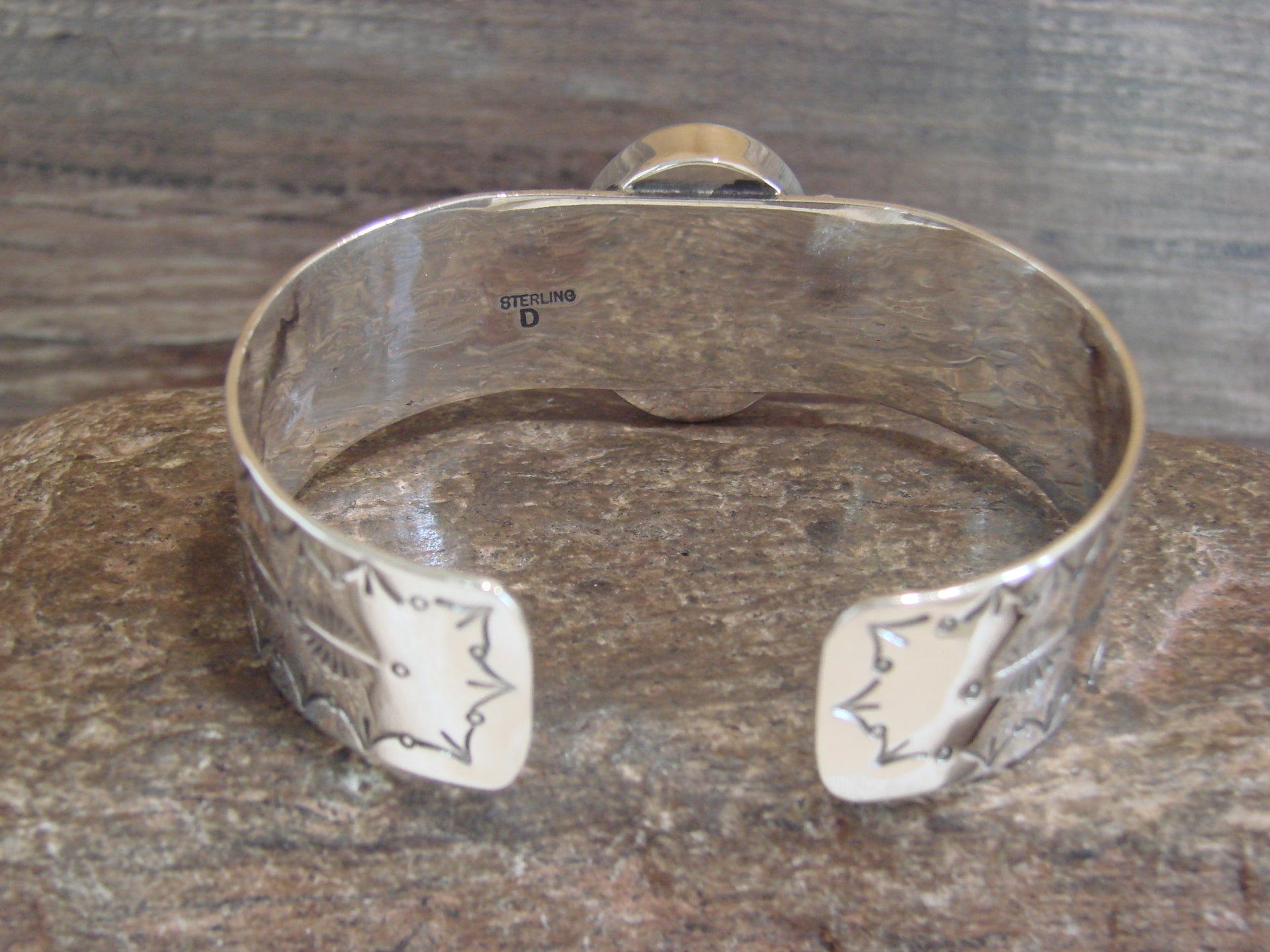 Genuine Native American Navajo Indian Sterling Silver & Turquoise Bracelet from Western New Mexico. This Stunning bracelet features a Genuine Turquoise Stone set into a smooth sterling silver bezel setting. Hand Stamping and Beautiful details in Sterling Silver surround the Stone. Fine Navajo Silversmith workmanship quality makes this bracelet a beautiful hand made masterpiece! Navajo Indian handmade by David Lee. Hallmarked and Stamped "Sterling" on the back. Free gift box and free shipping included!