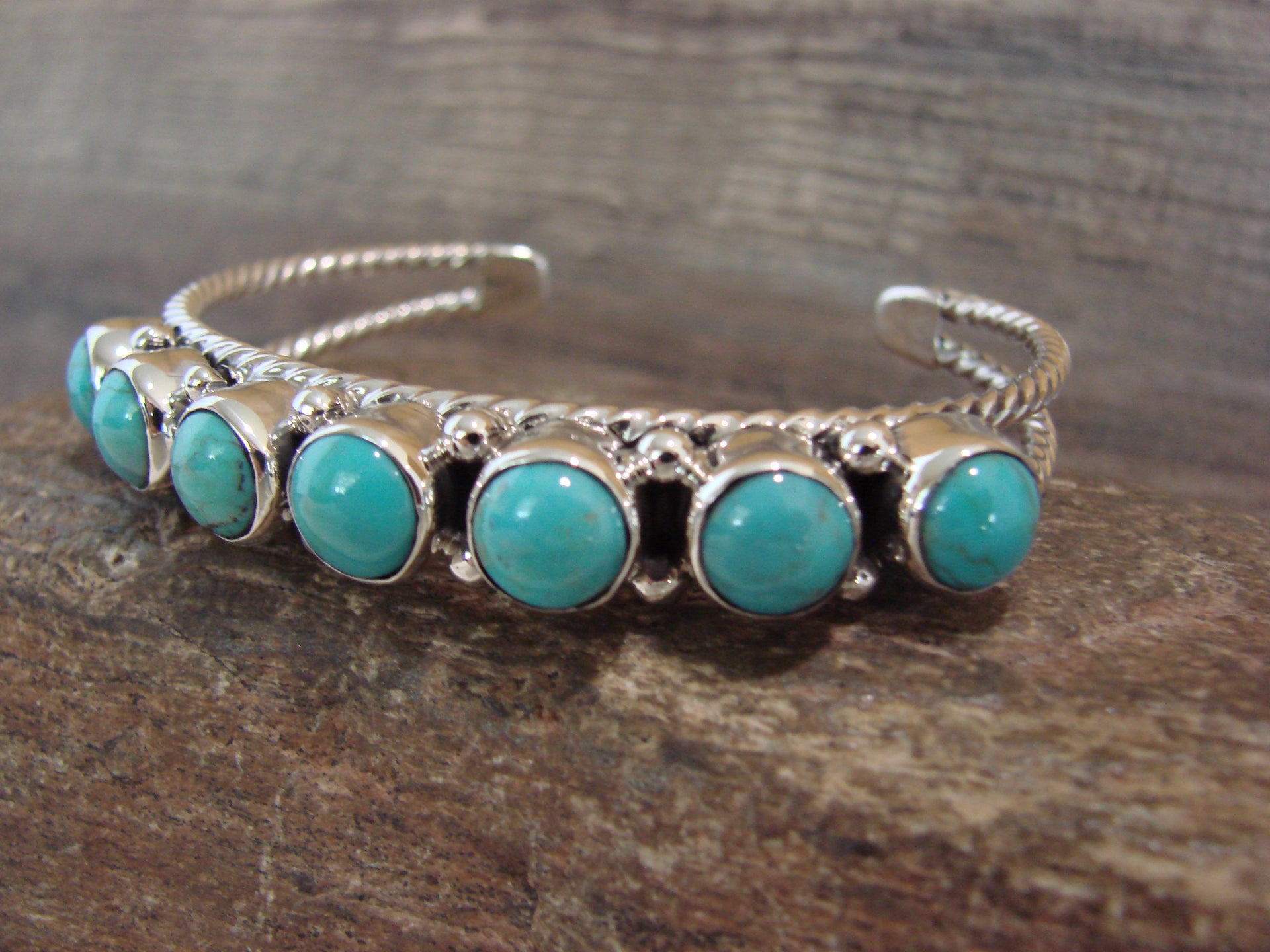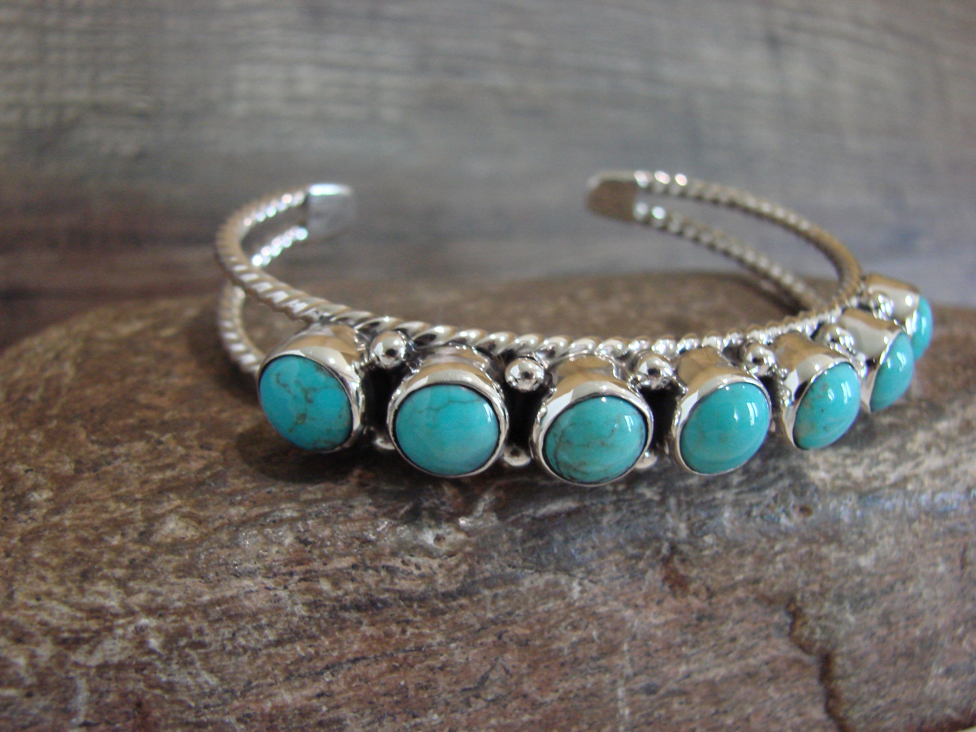 Genuine Native American Navajo Indian Sterling Silver & Turquoise Row Bracelet from Western New Mexico. This Stunning bracelet features a Single Row of beautiful high quality, Genuine, Turquoise stones intricately set into Smooth Sterling Silver bezel settings. Sterling Silver Details surround the stones. Fine Navajo Silversmith workmanship quality makes this bracelet a beautiful hand made masterpiece! Navajo Indian handmade by Sheena Jack. Stamped "Sterling" on the inner cuff. Free gift box and shipping included!