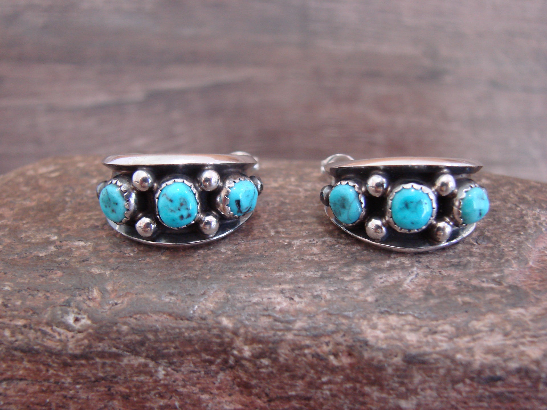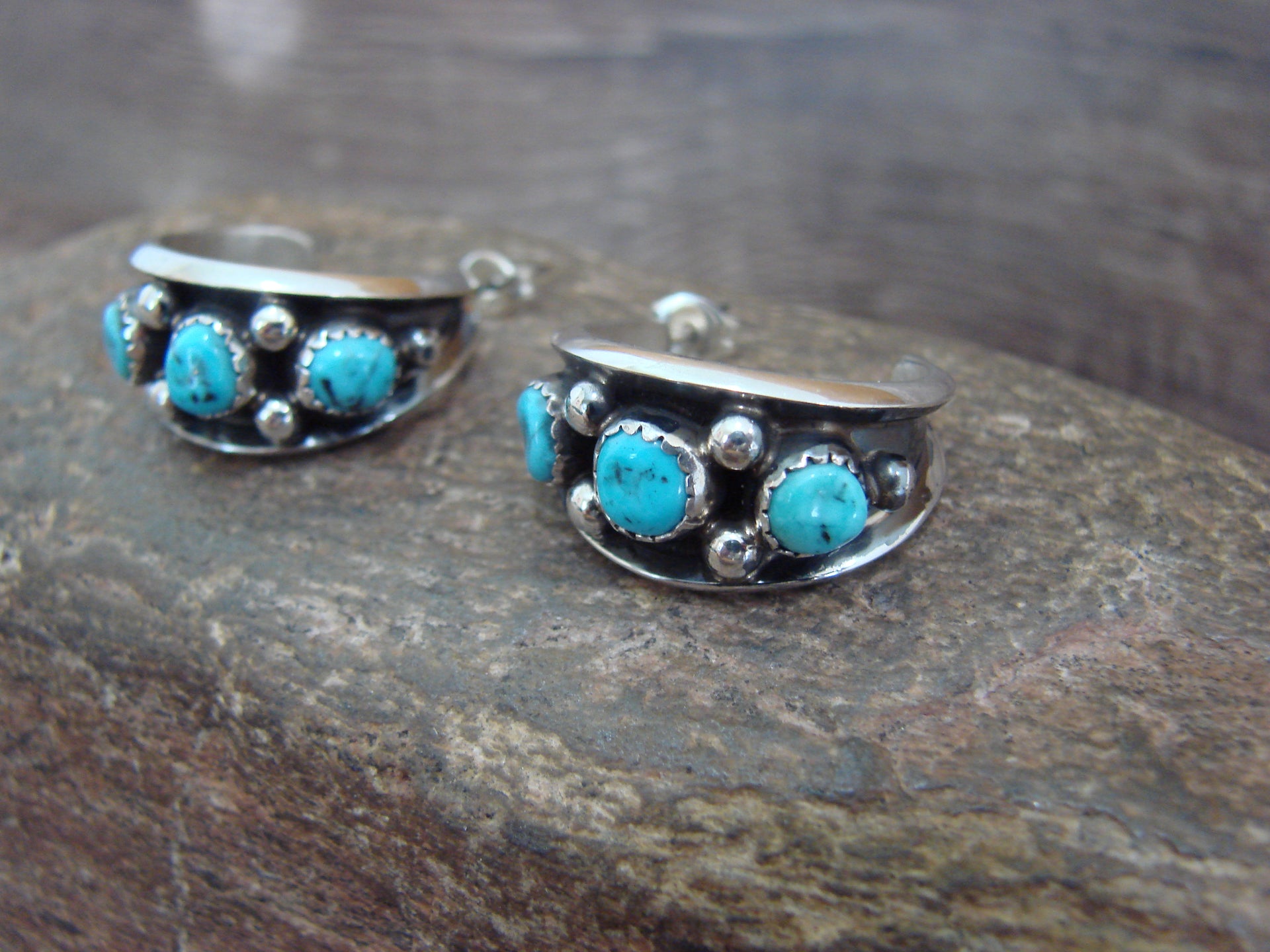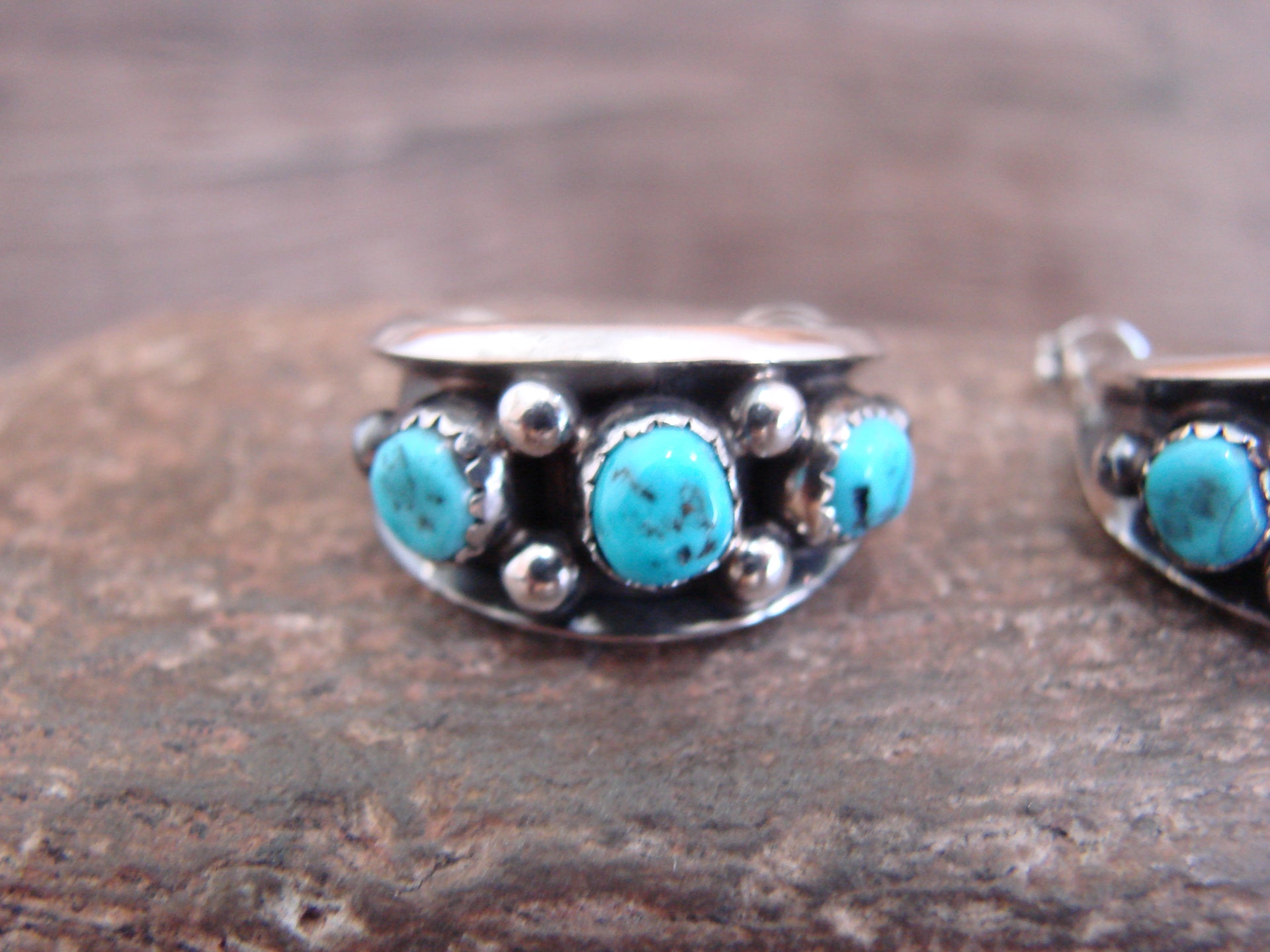 Genuine Native American Navajo Indian Sterling Silver & Turquoise Earrings from Western New Mexico. These Stunning hoop style earrings feature a Row of 3 Genuine Turquoise Stones beautifully set into a crown sterling silver bezel settings. Gorgeous Sterling Silver details surround the Turquoise stones. This is a very nice pair of earrings! Navajo Indian handmade by Paul Largo. Stamped "Sterling" on the inner hoop. Free Shipping with a gift box included!