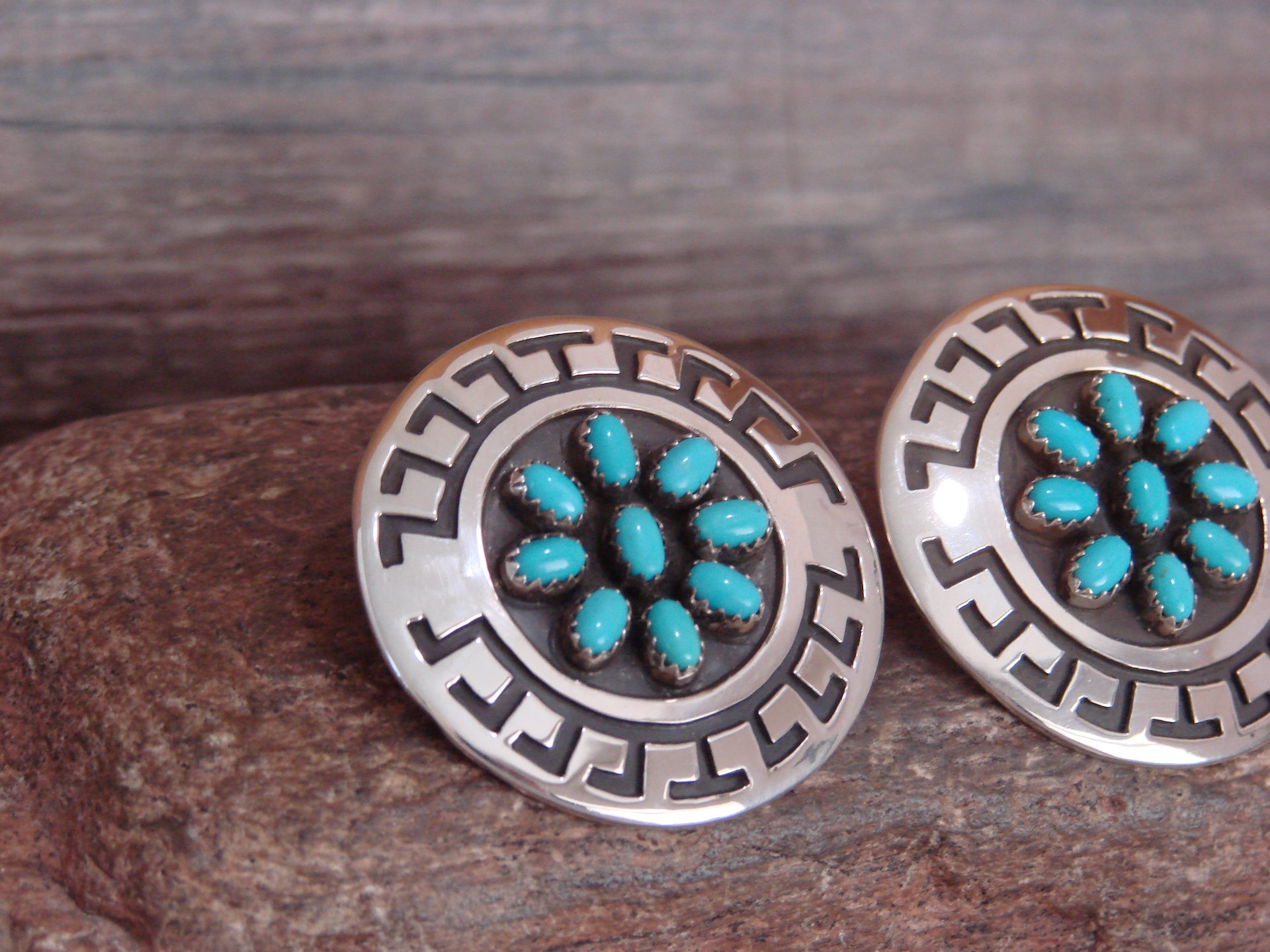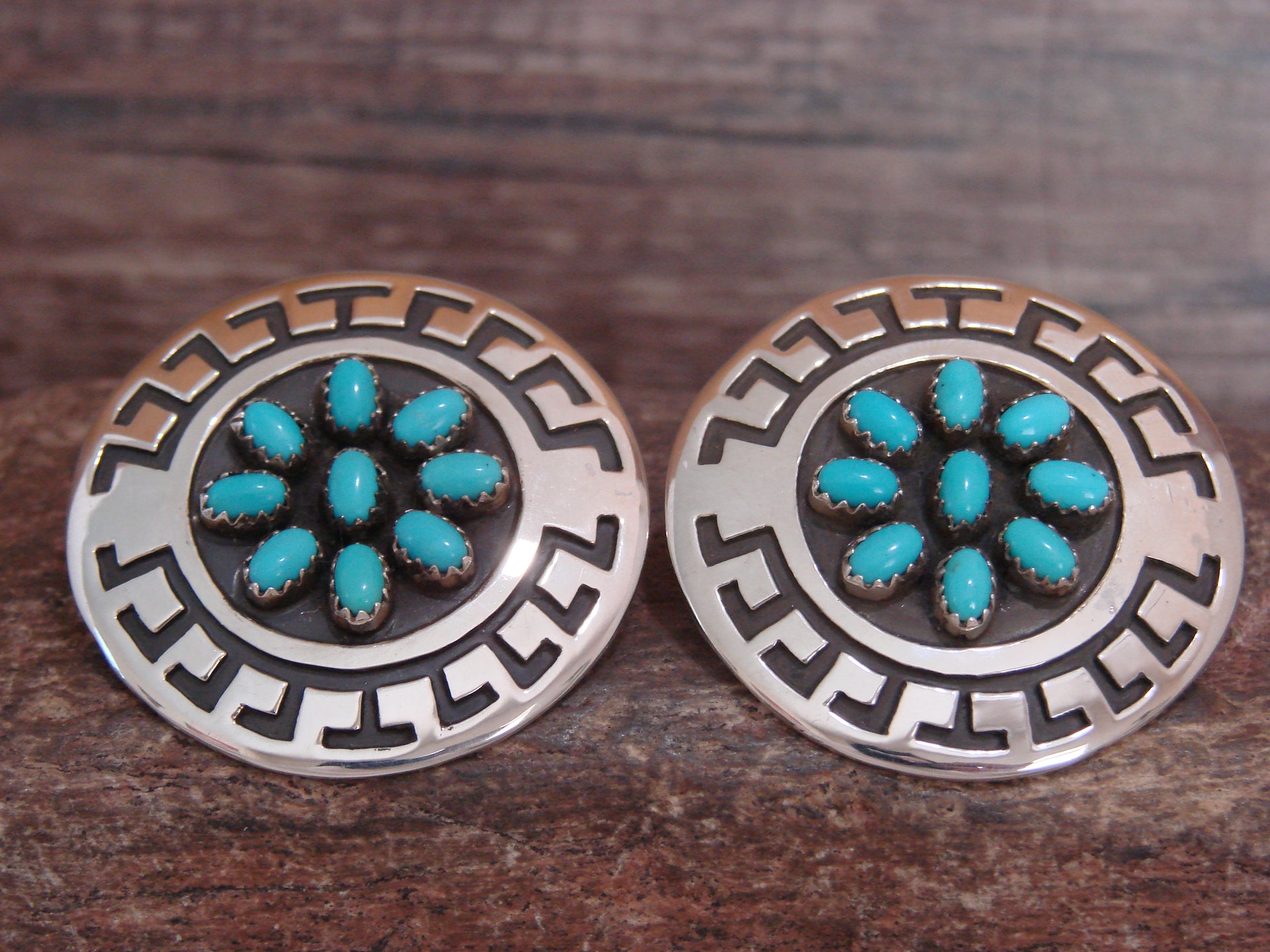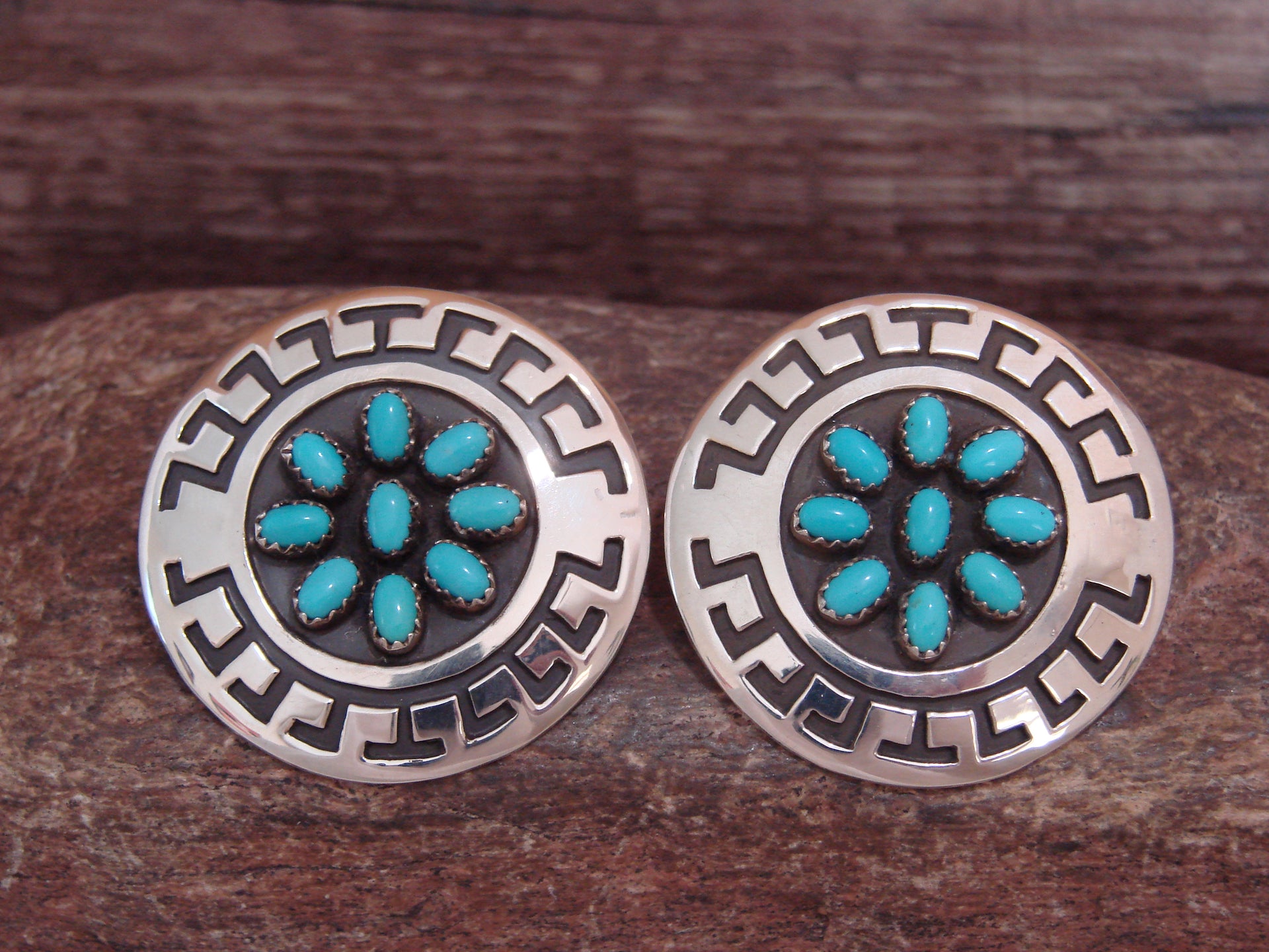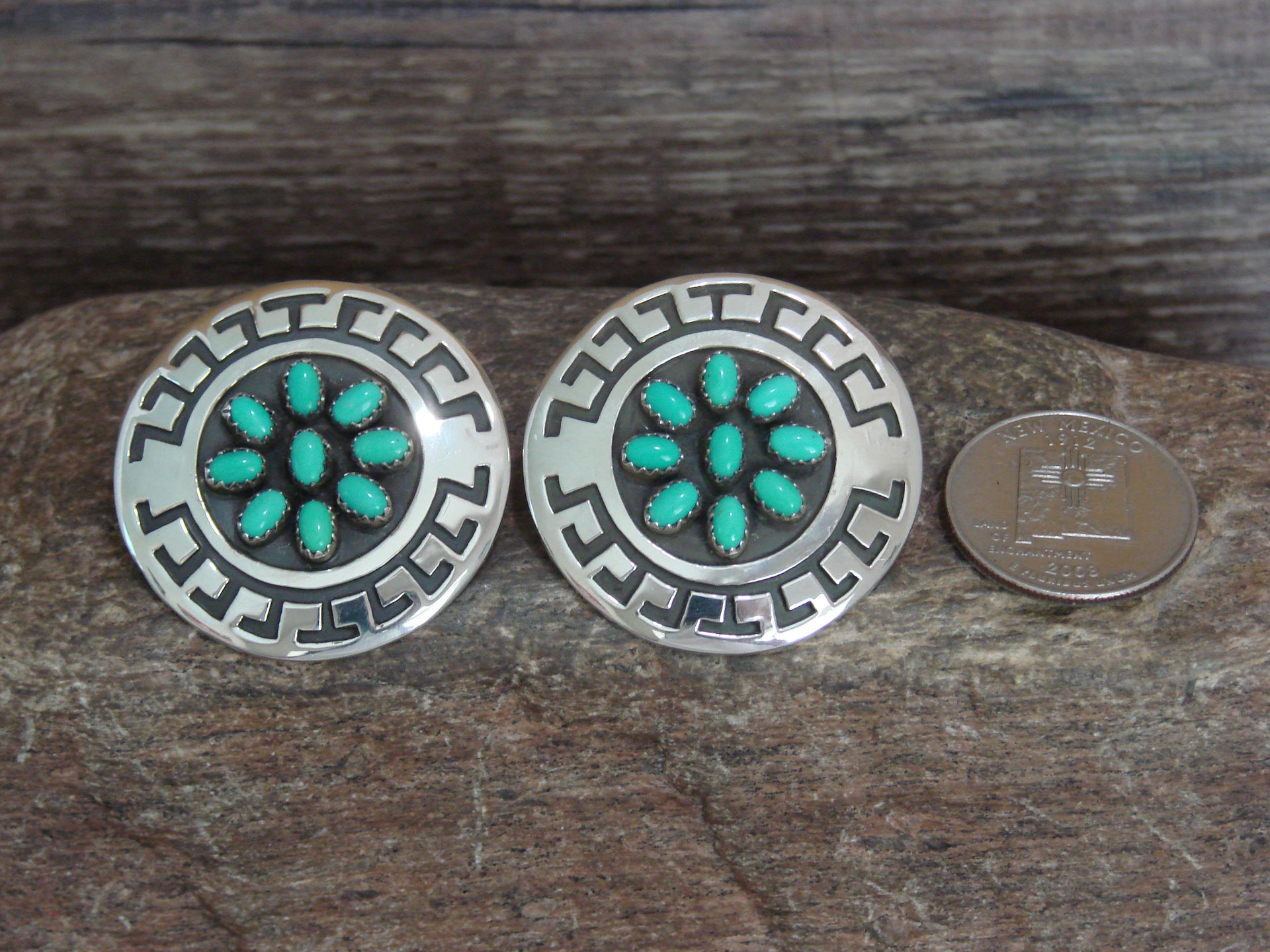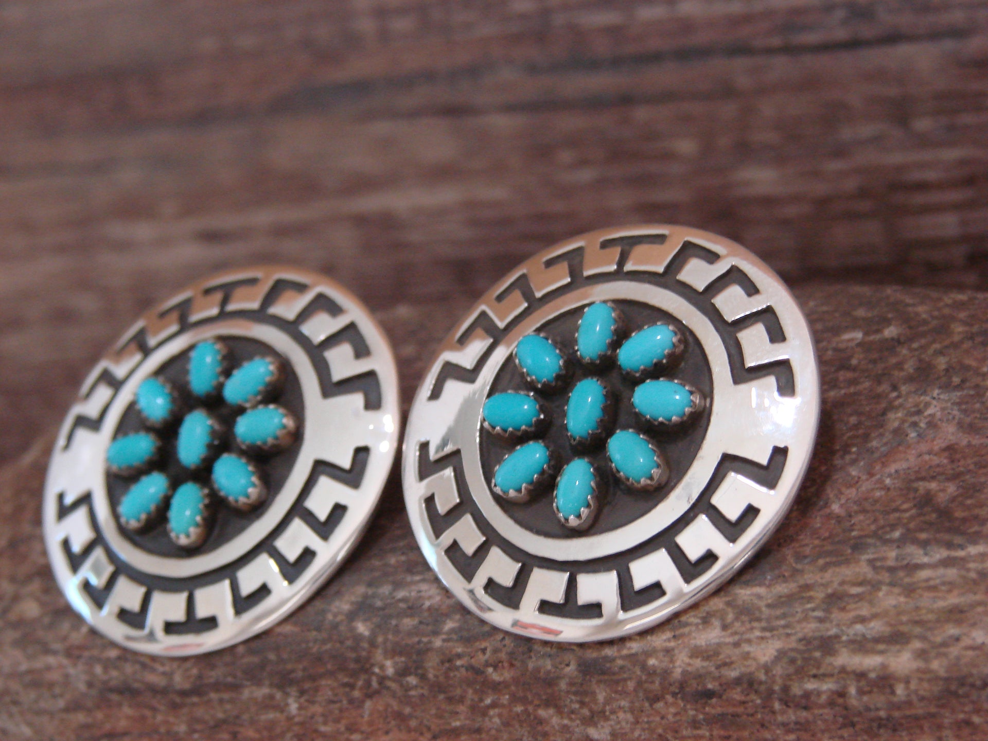 Genuine Native American Navajo Indian Sterling Silver & Turquoise Cluster Post Earrings from Western New Mexico. These Gorgeous earrings feature 9 Genuine Turquoise stones each. Each stone is beautifully set into a crown sterling silver bezel and surrounded by Stunning sterling silver details. Handmade to Perfection by Navajo artist Roscoe Scott. Stamped "Sterling" on the back. Free Shipping with gift box included!