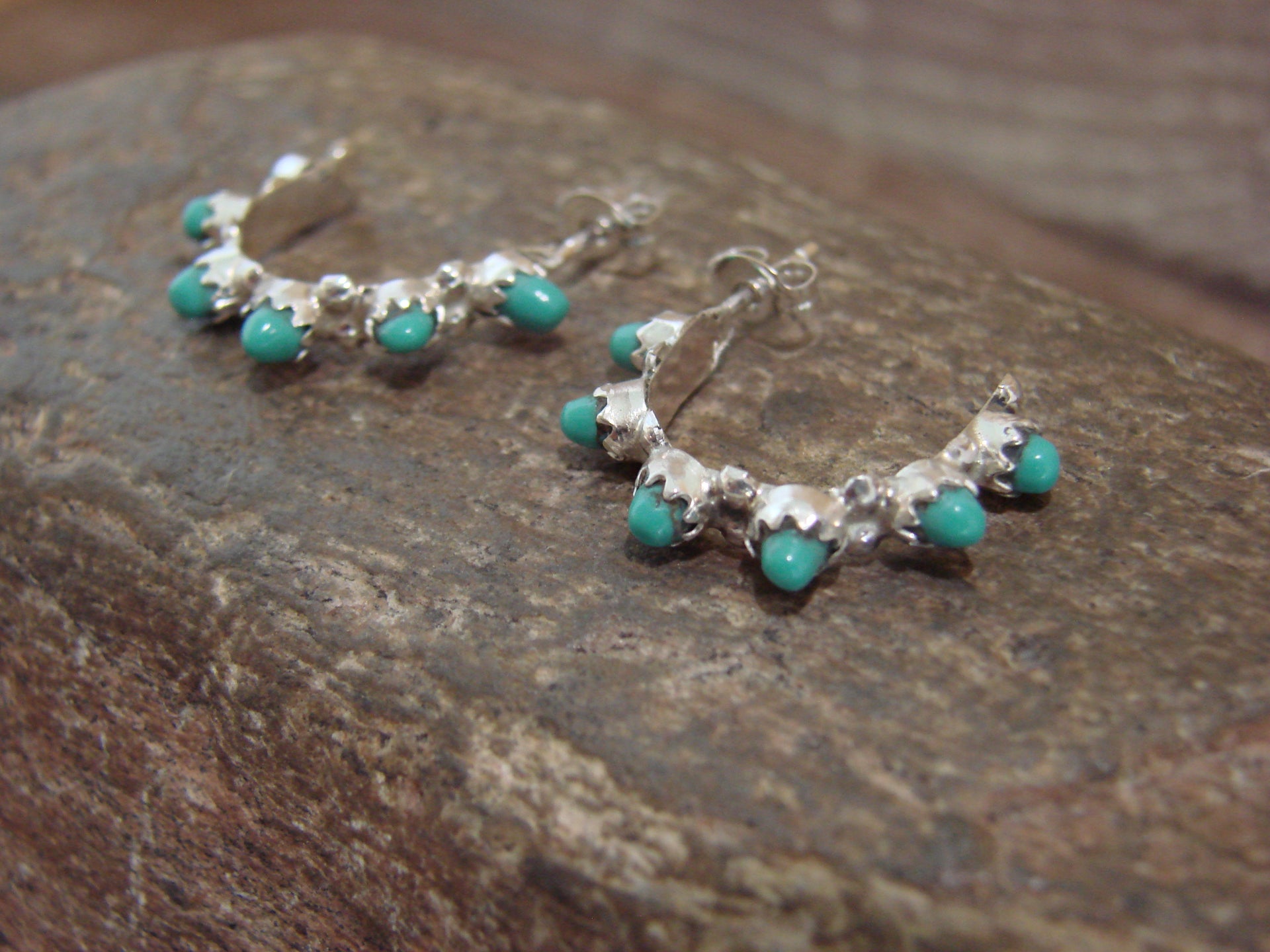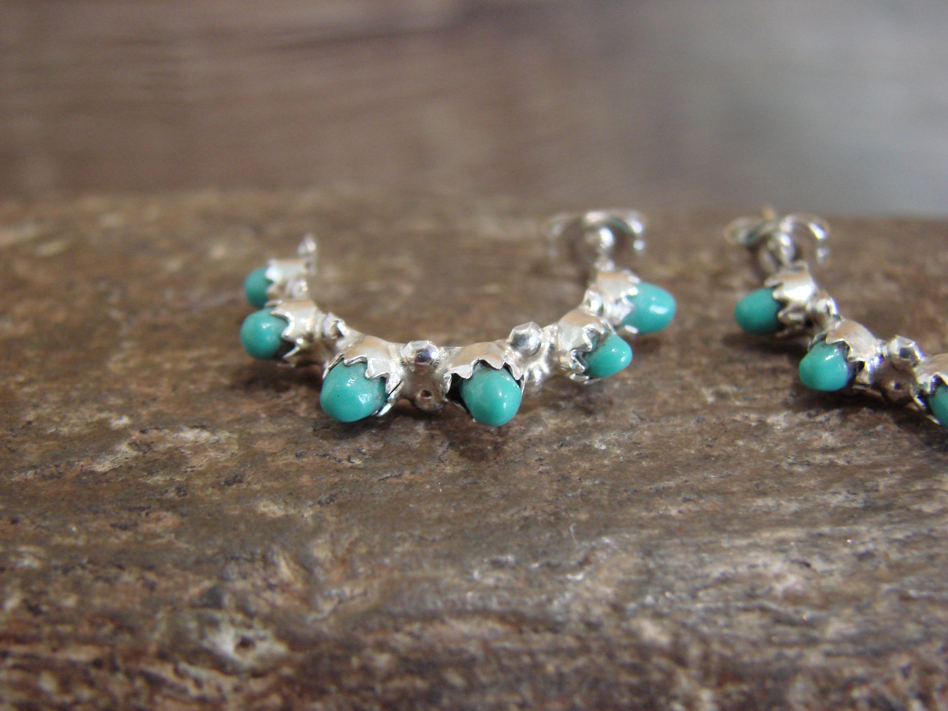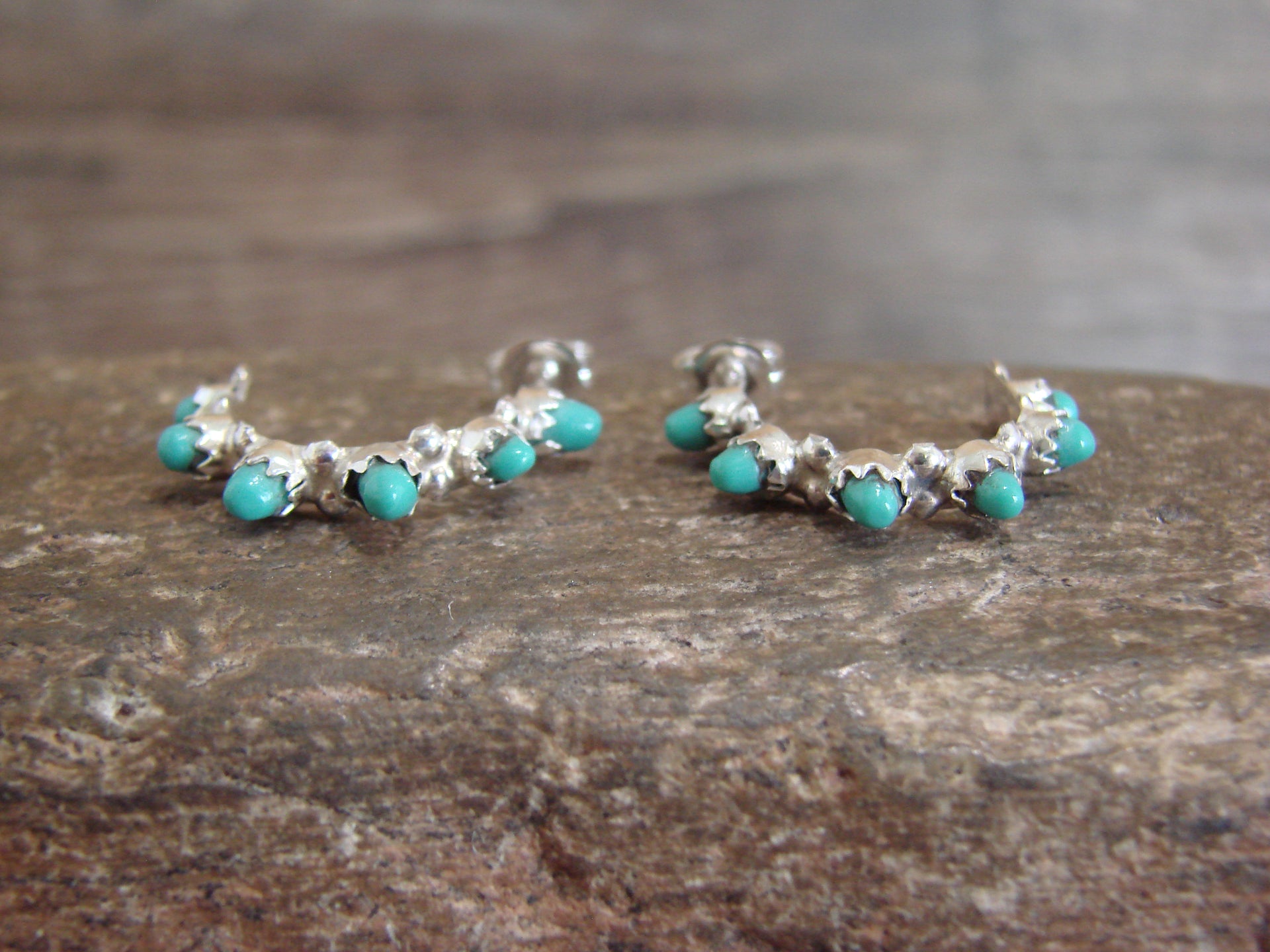 Genuine Native American Zuni Indian Sterling Silver & Turquoise Half Hoop Earrings from Western New Mexico. These hoop Post style earrings feature Turquoise stones intricately inlayed into crown Sterling Silver bezel settings. The stones are polished and have a stunning look. Gorgeous details in the Sterling Silver Surround the Stones. Zuni Indian handmade by Gloria Waseta. Unsigned. Free gift box and shipping included!