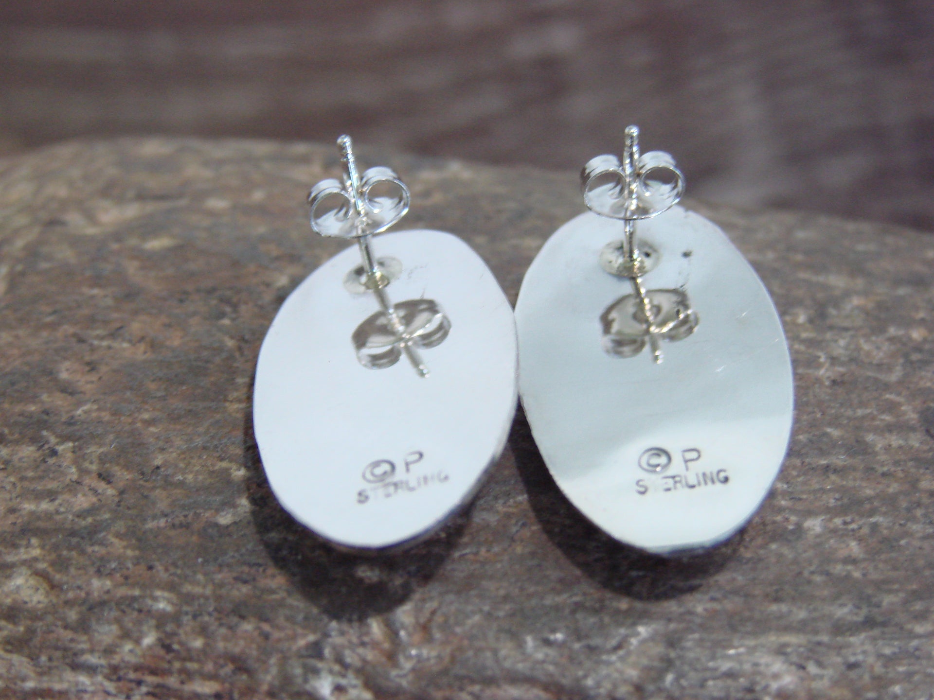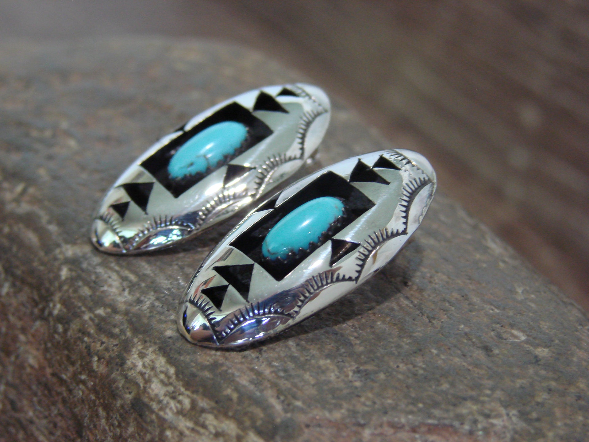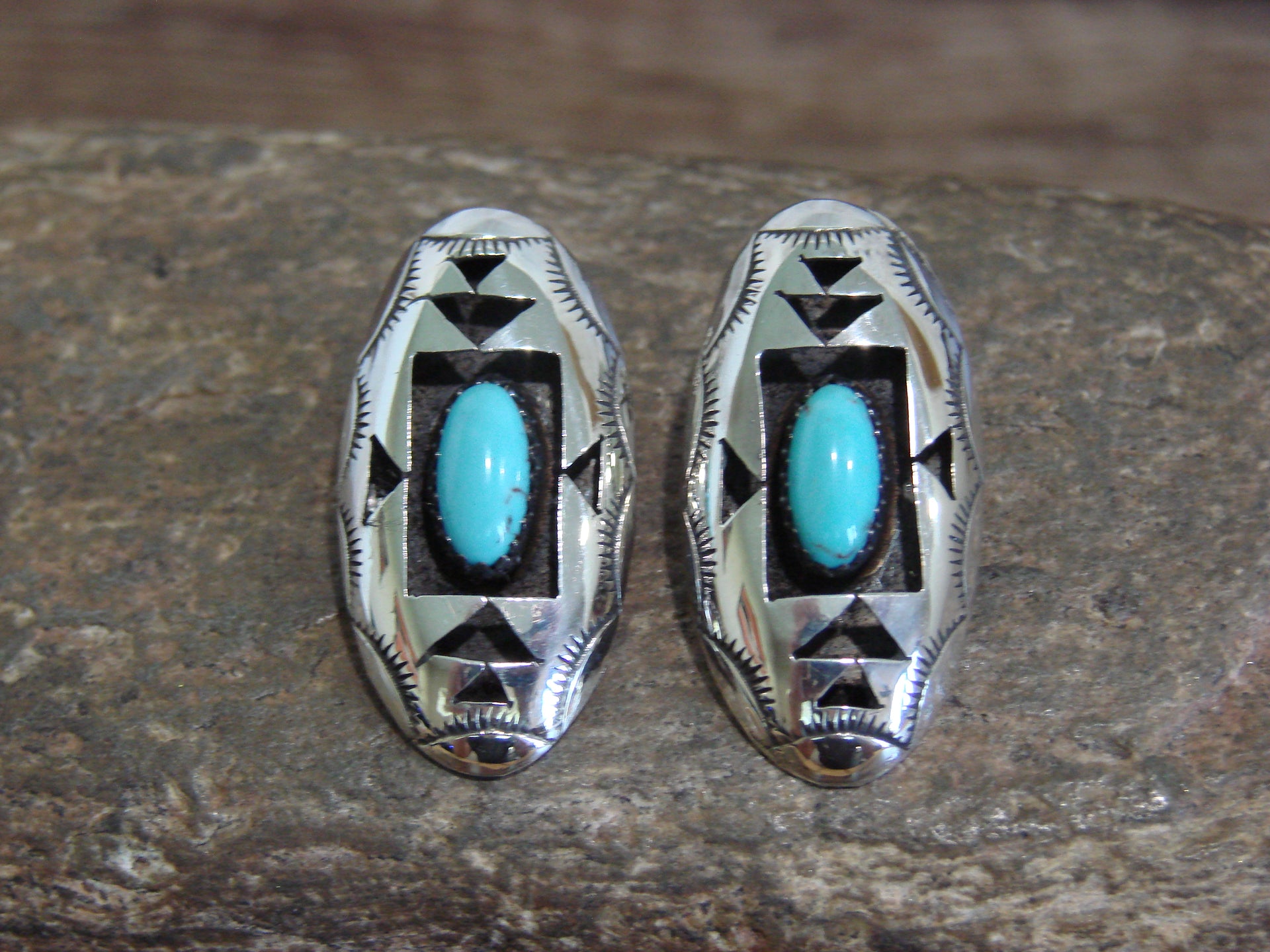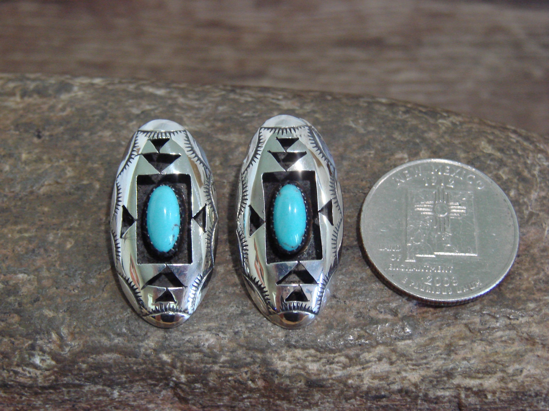 Genuine Native American Navajo Indian Sterling Silver & Turquoise Shadow Box Post Earrings from Western New Mexico. These Beautiful Post earrings feature Turquoise stones beautifully set into a sterling silver shadow box. The shadow box is hand polished. Navajo Indian hand made by Felix Perry. Signed "P" and Stamped "Sterling" on the back. Free shipping and gift box included!