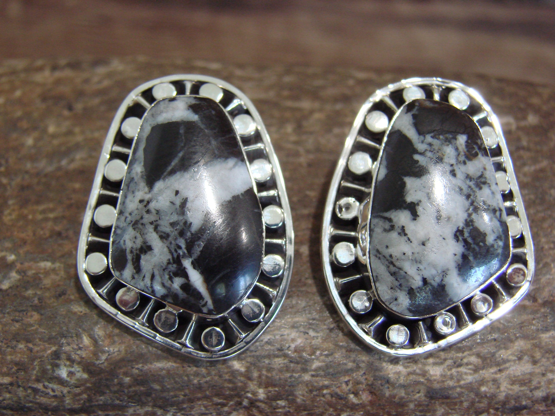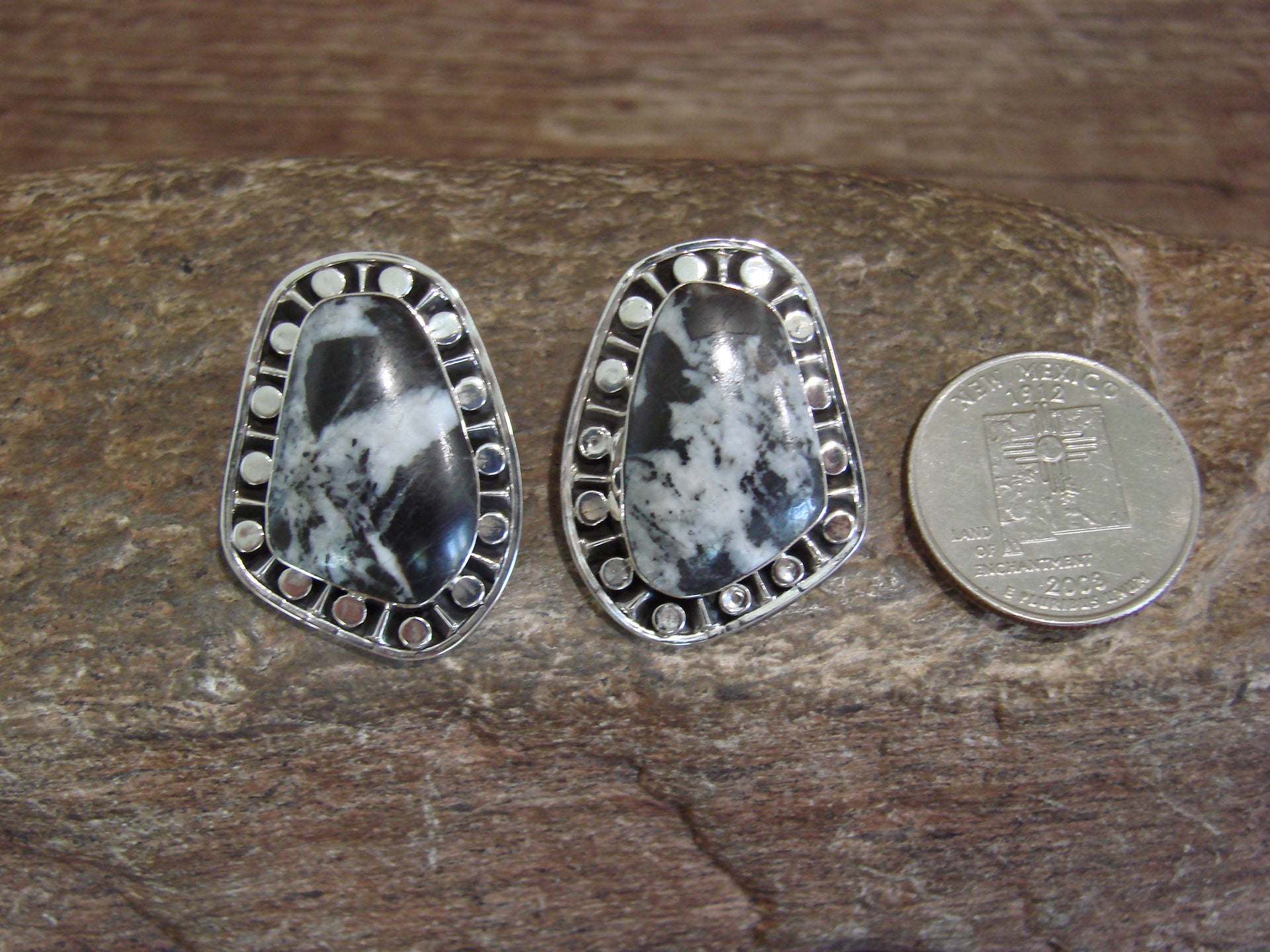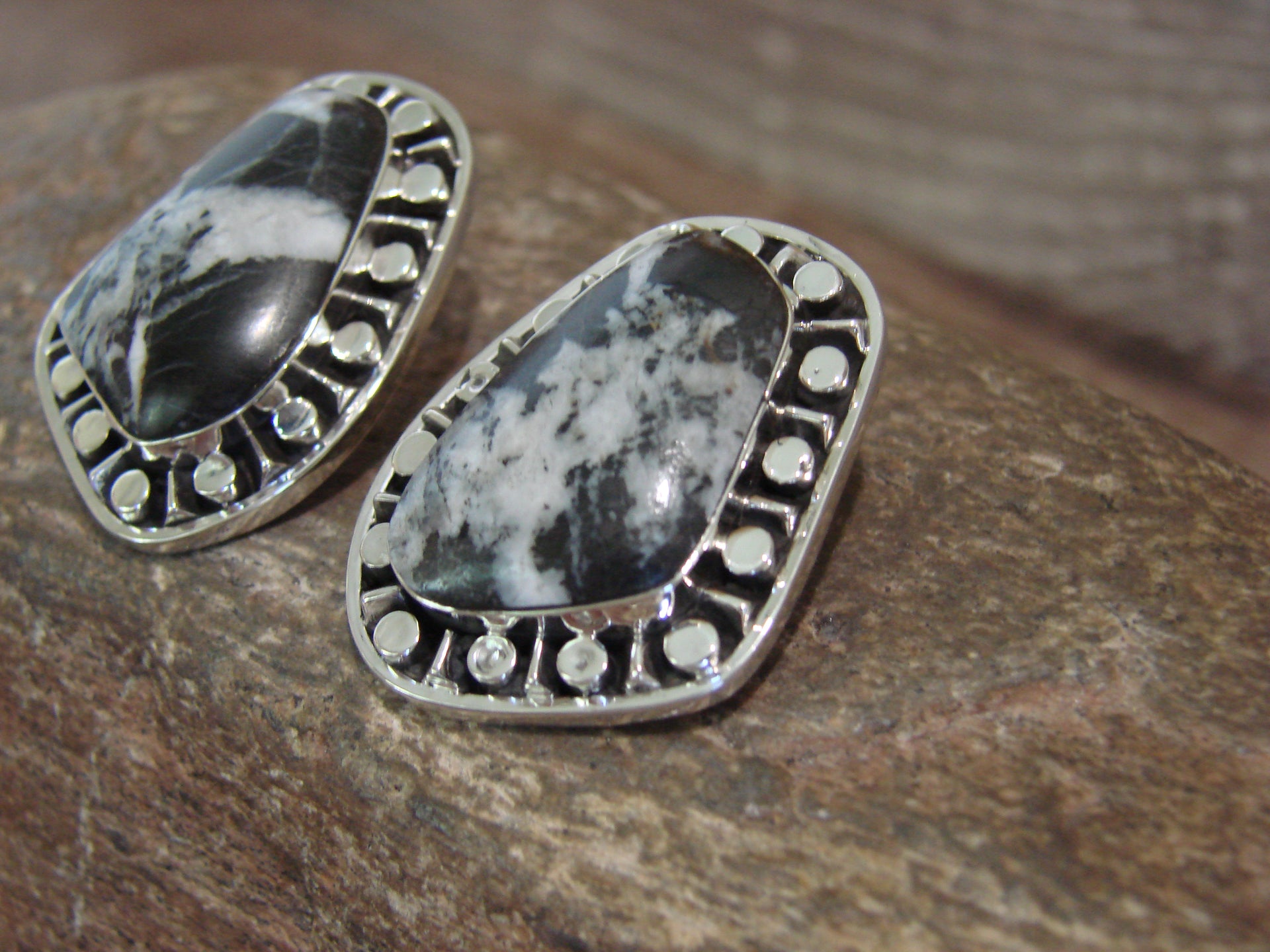 Genuine Native American Navajo Indian Sterling Silver & White Buffalo Turquoise Post Earrings from Western New Mexico. These post earrings feature genuine White Buffalo Turquoise stones set into smooth sterling silver bezel settings. Surrounding these Gorgeous stones are beautiful details in Sterling Silver. Navajo Indian hand made by Sharon McCarthy. Hallmarked on the back. Free shipping and gift box included!