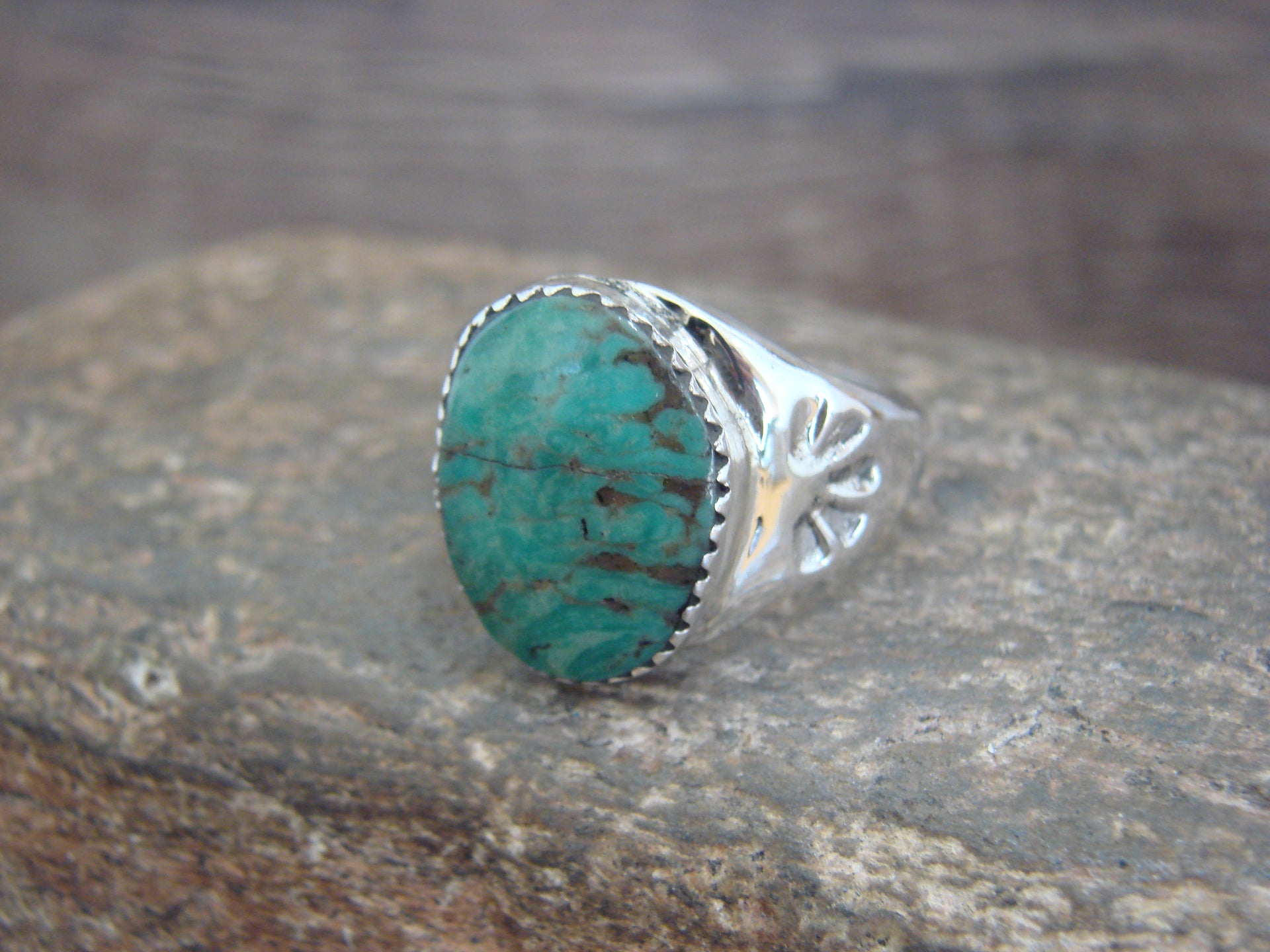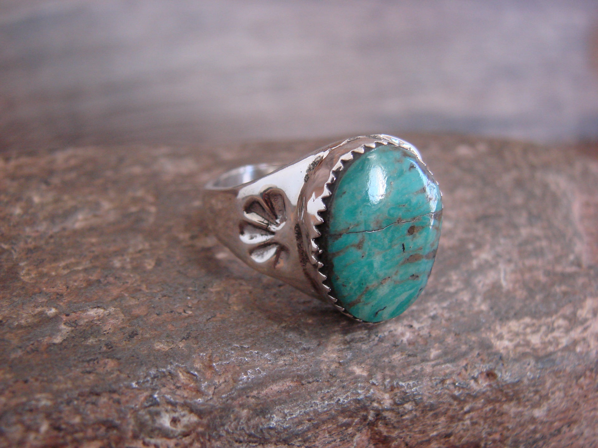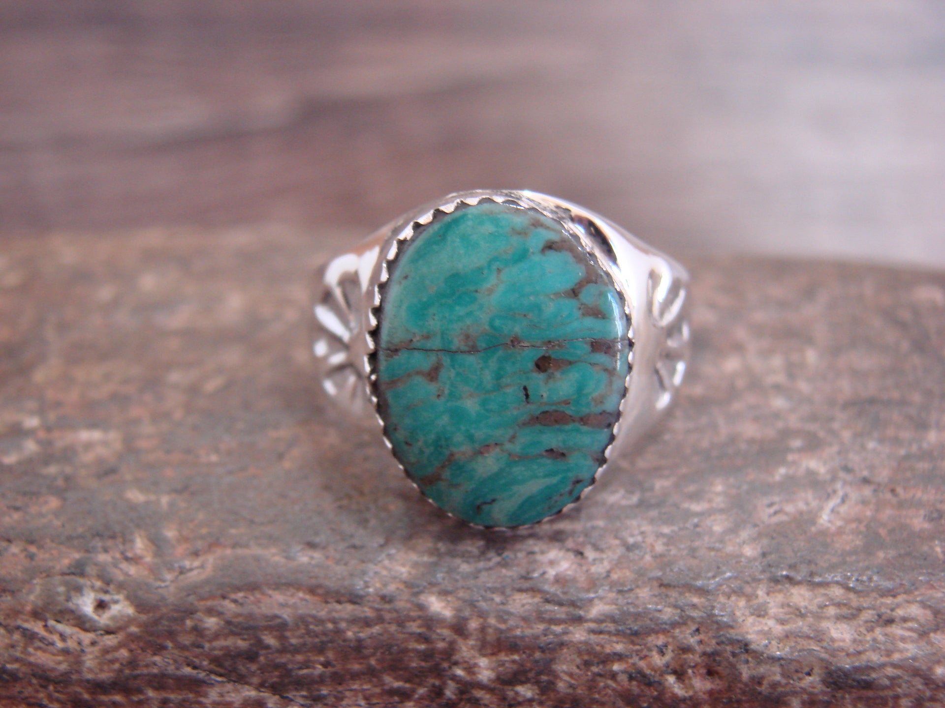 Genuine Native American Navajo Indian Sterling Silver & Turquoise Ring from Western New Mexico. This Genuine piece features a Genuine Turquoise stone intricately set into a crown Sterling Silver Bezel Setting. Beautiful Hand Stamping and Sterling Silver Details surround the stone. Navajo Indian hand made by Raquel Bekis. Stamped "Sterling" on the back. Free Shipping and gift box included!