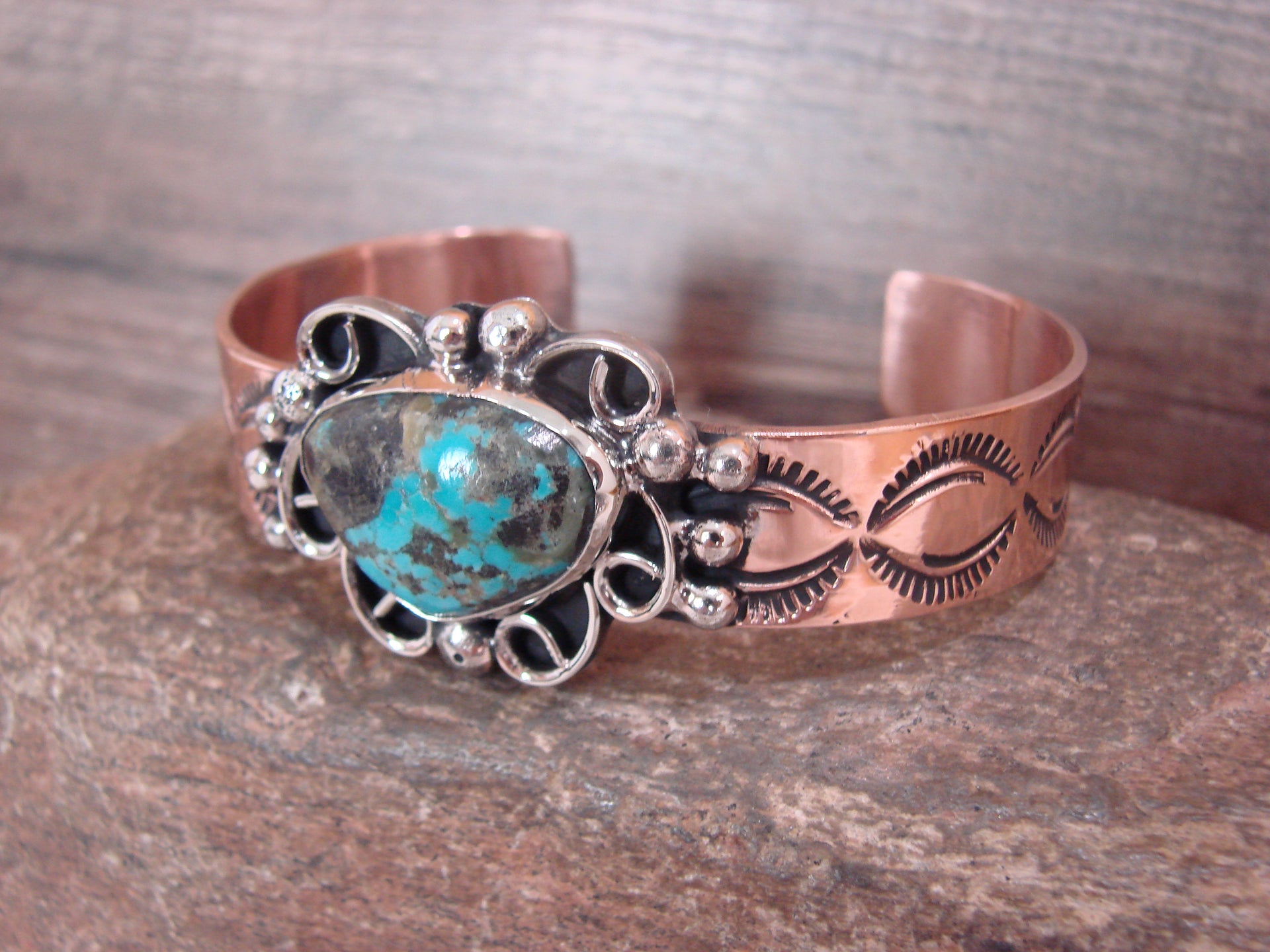 Native American Navajo Indian Handmade Copper & Turquoise Bracelet from Western New Mexico. This bracelet features a Turquoise stone set into a smooth Nickel Silver bezel setting. The stone is nicely polished and surrounded by traditional Navajo style design work in Copper. Navajo Indian handmade by well-known Silversmith Jackie Cleveland. Signed "JC" on the back. Free Shipping with a gift box included!