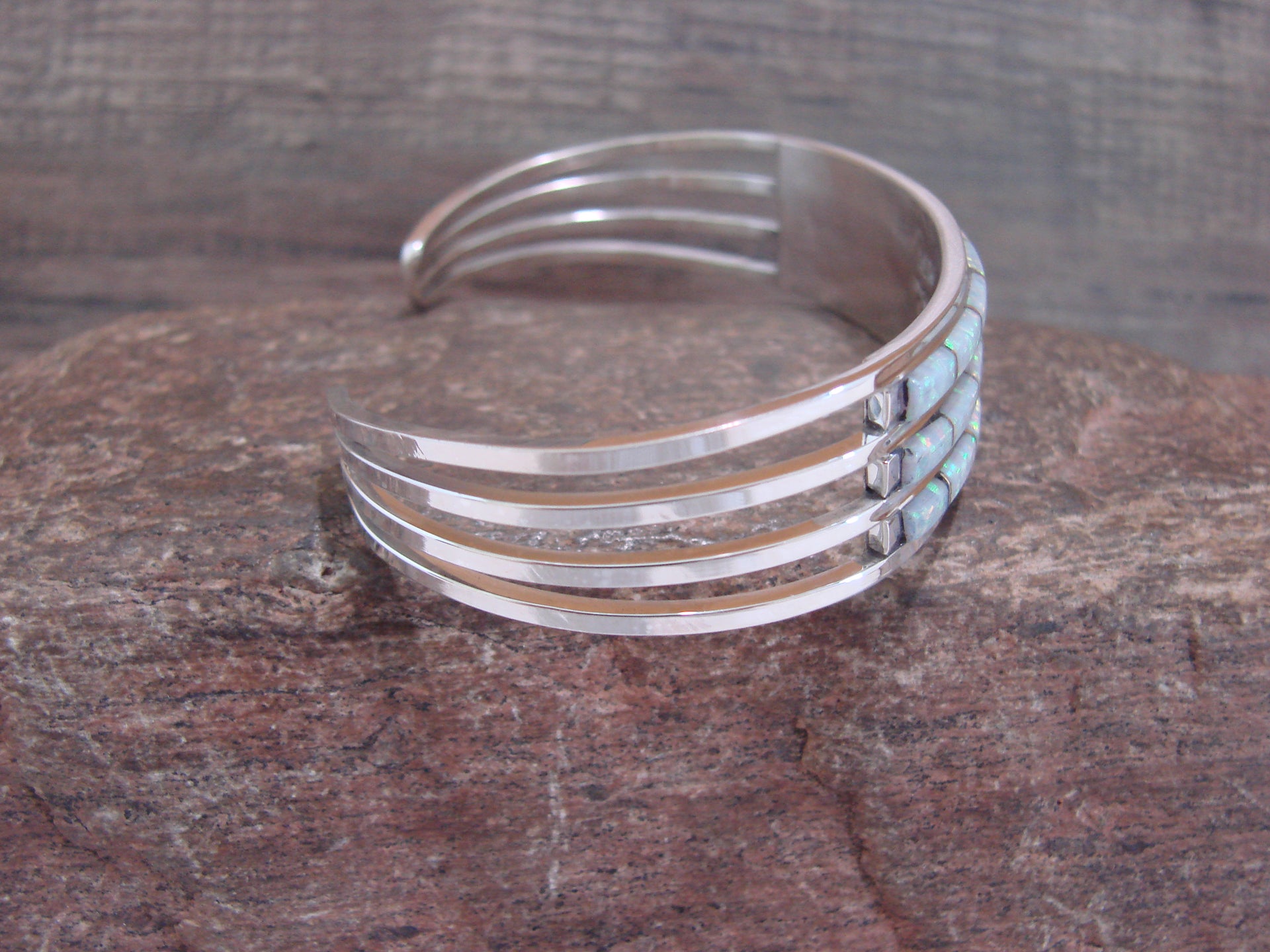 Genuine Native American Zuni Indian Sterling Silver & Opal Inlay Row Bracelet from Western New Mexico. This Bracelet feature 3 rows of Lab Opal stones beautifully inlayed into smooth sterling silver and polished. This inlay work is Stunning! Zuni Indian hand made by Anson Wallace. Signed "ALW" and stamped "Sterling" on the back. Free gift box and shipping included!
